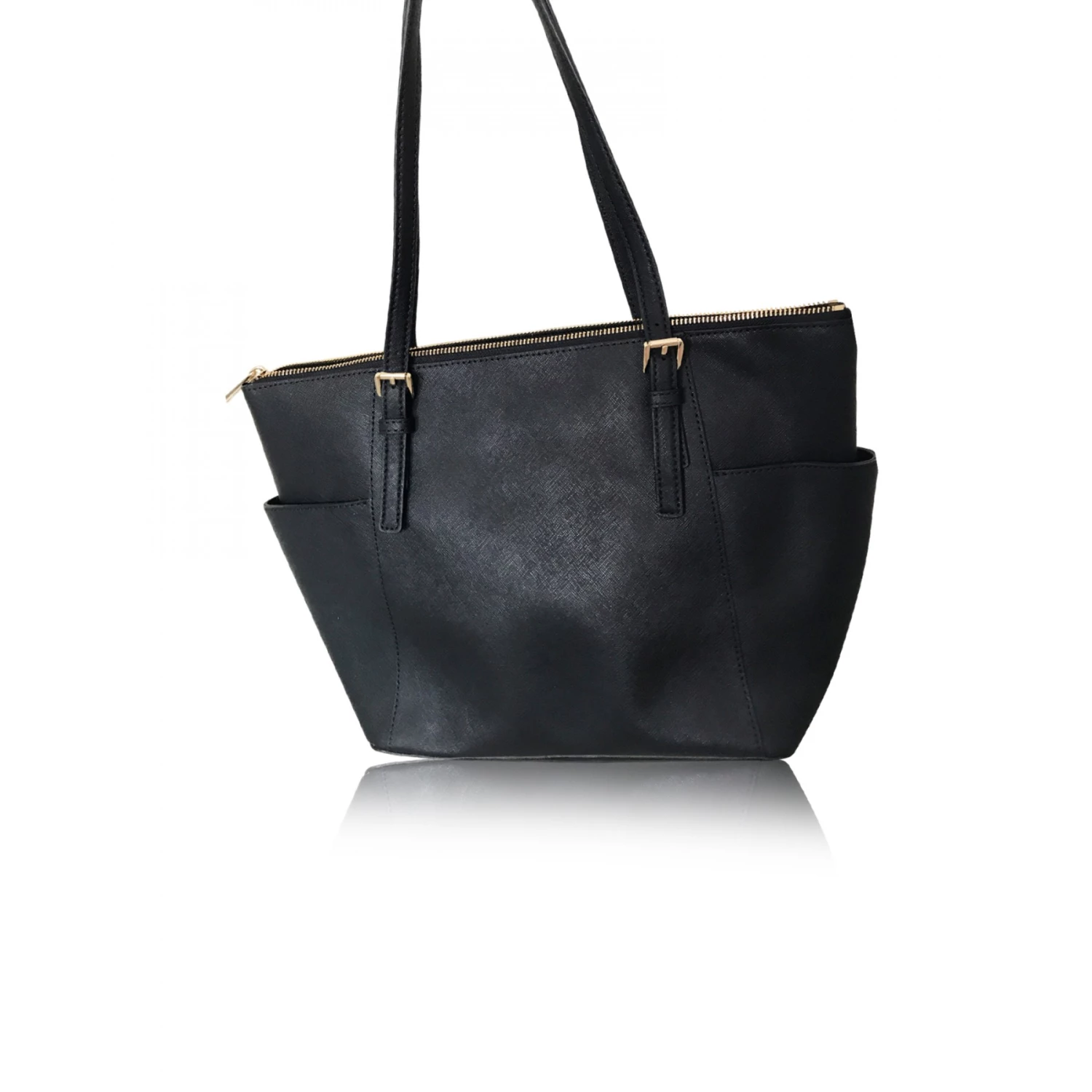 Coming from the iconic house of Micheal Kors, this Jet Set tote is perfect for your everyday outings. Designed with a black saffiano leather, this sleek bag comes with a top zip closure, two exterior side zip pockets and decorated with gold-tone hardware. Carry it by the two thin shoulder handles.