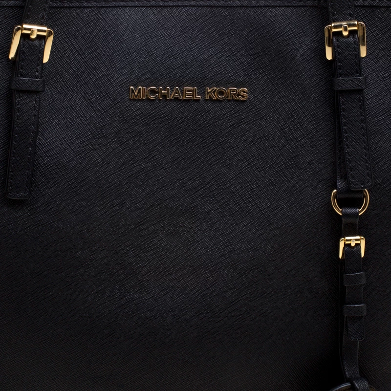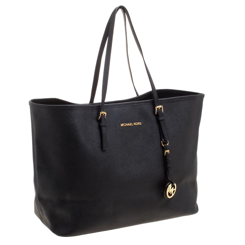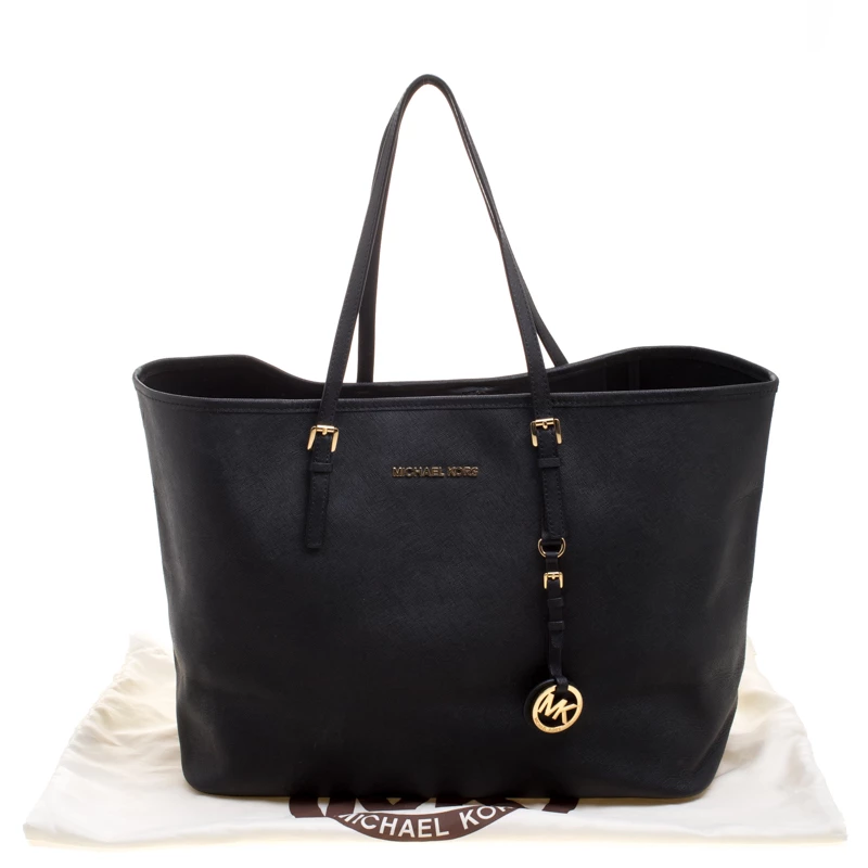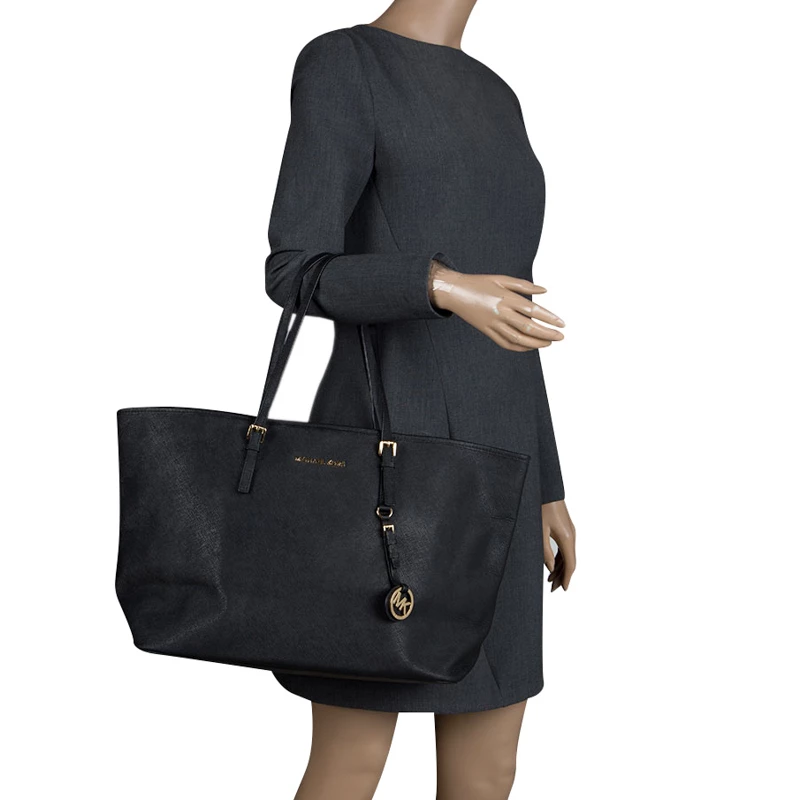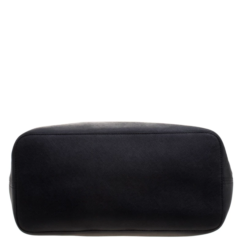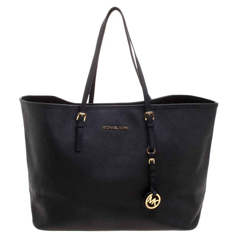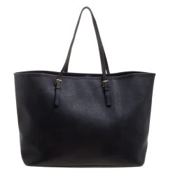 This elegant Jetset tote from Michael Kors is intricately crafted from the durable and distinctive Saffiano leather. Featuring minimal designing, the striking black bag is accentuated with dual top handles, buckle detailing and the dangling ‘MK’ charm in gold tone. It is secured by a clasp, which opens to a canvas lined interior housing a zip pocket and enough room to fit your belongings. This tote definitely looks classic and elegant.