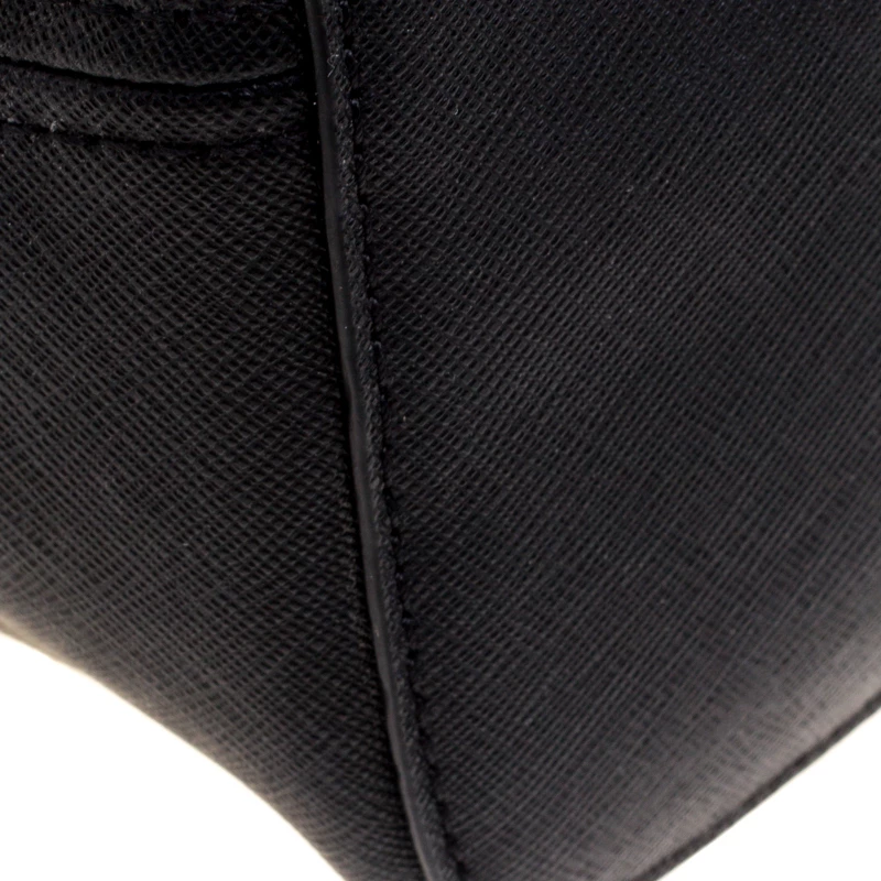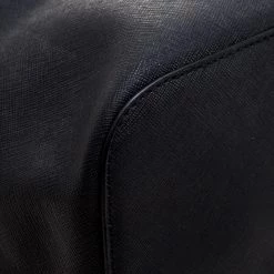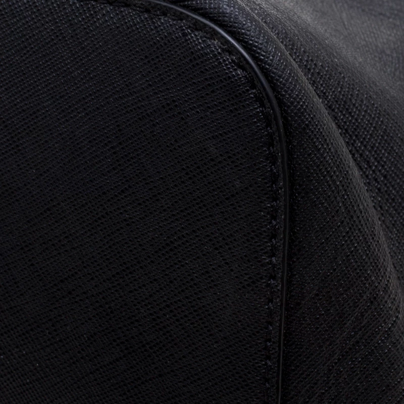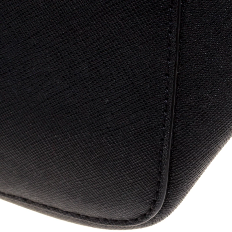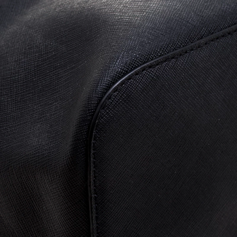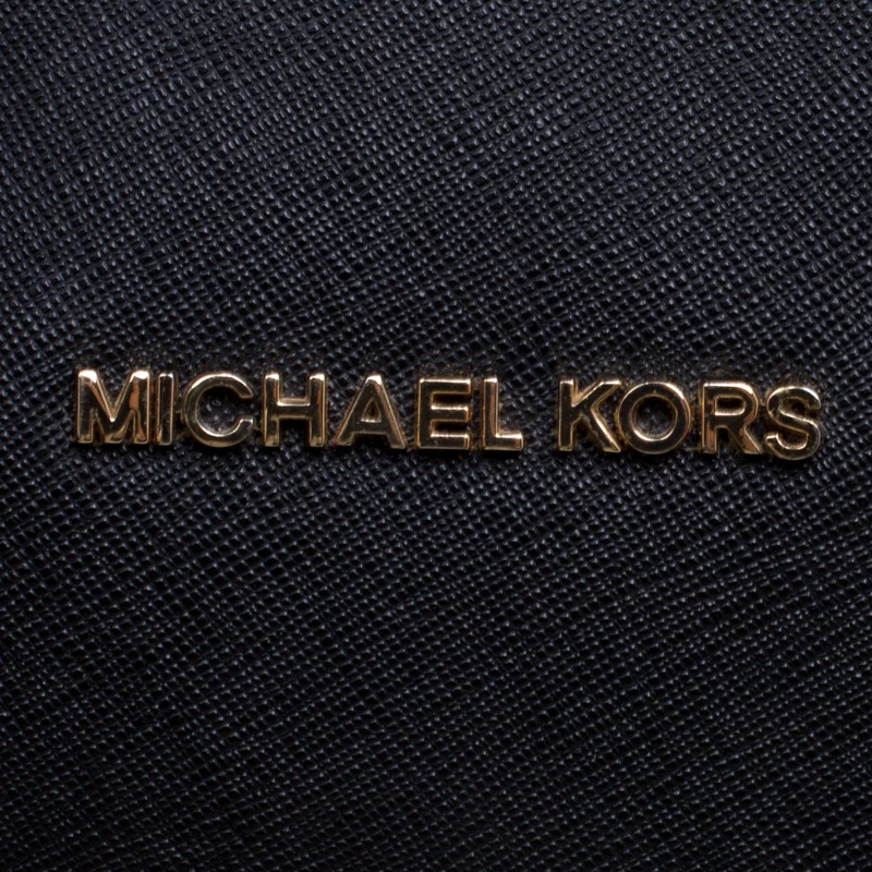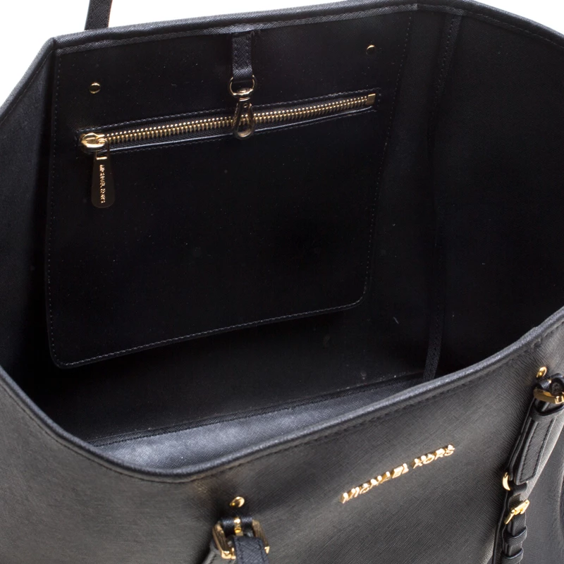 This elegant Jetset tote from Michael Kors is intricately crafted from the durable and distinctive Saffiano leather. Featuring minimal designing, the striking black bag is accentuated with dual top handles, buckle detailing and the dangling ‘MK’ charm in gold tone. It is secured by a clasp, which opens to a canvas lined interior housing a zip pocket and enough room to fit your belongings. This tote definitely looks classic and elegant.