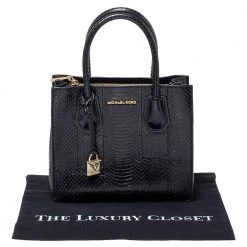 Classy and super stylish, this Mercer tote is a Michael Kors creation. It has been luxuriously crafted from exotic snakeskin, detailed with gold-tone metal, and shaped to complement all your elegant outfits. The insides are lined with Alcantara and sized to carry your necessities. The tote is complete with dual top handles and a padlock on the front. NOTE: FOR UAE CUSTOMERS ONLY