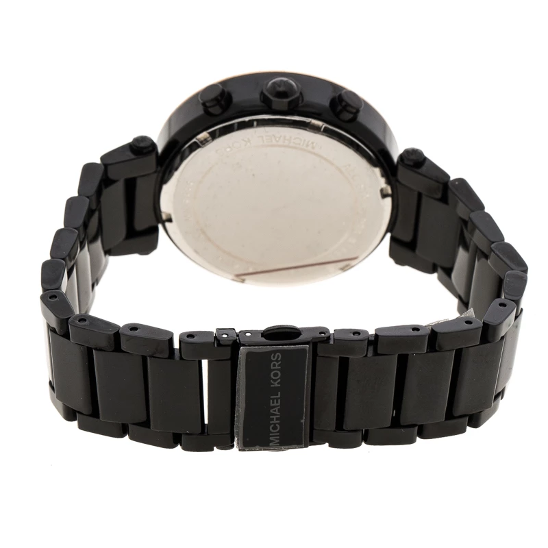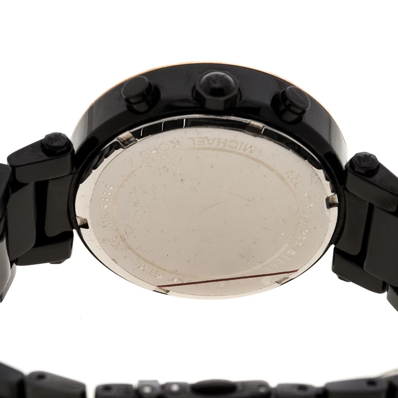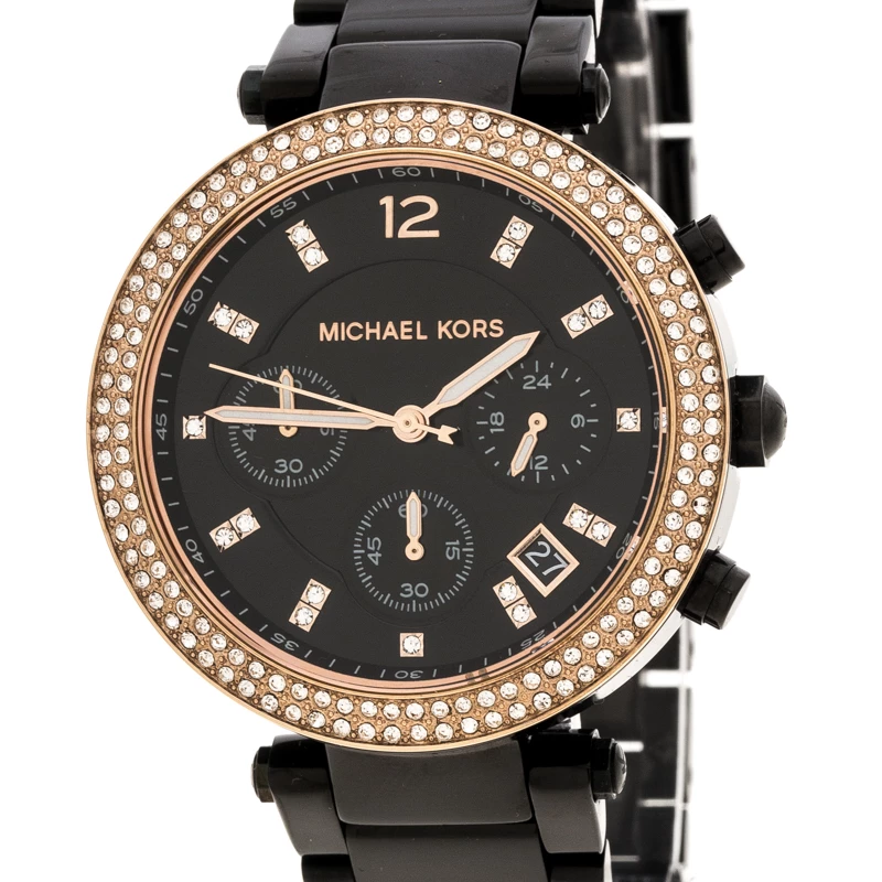 Set to shine on your wrist, this Michael Kors watch comes in a delighting gathering of the finest features. It has been wonderfully crafted from black stainless steel and designed with a rose gold-plated bezel decorated with crystals. The scratch-resistant mineral glass protects a black dial that has embellished hour markers, three subdials and a date window. Lastly, the creation is topped by a water resistance of 100 meters and held by a bracelet with push-button release.