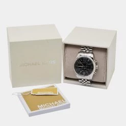 Designed with a fine blend of luxury and craftsmanship, this Lexington watch from Michael Kors is sure to delight your style. Made of stainless steel, the Quartz / Chronograph watch has a black dial housing silver-tone markers, three subdials, and a date window. The watch is water-resistant up to 100 meters and it is secured by a push-button closure.