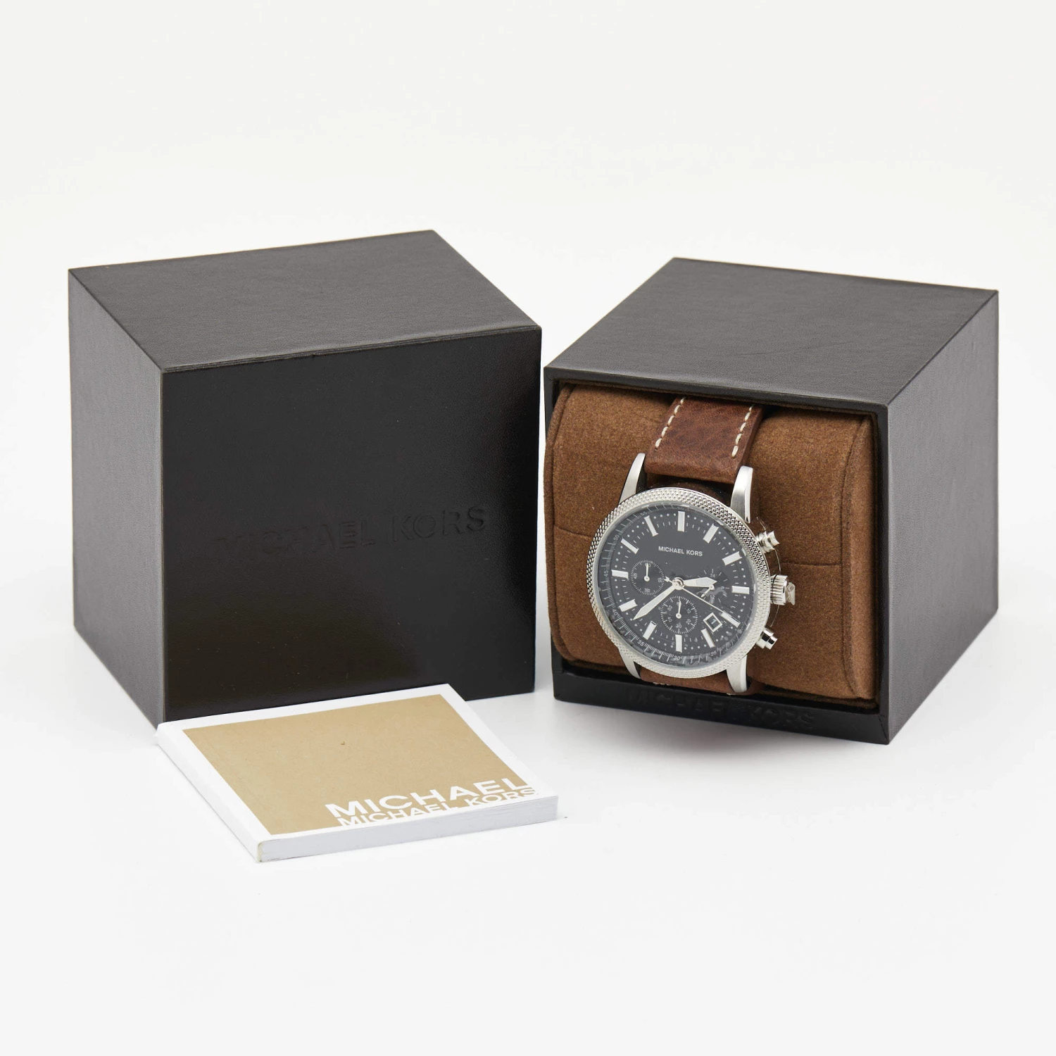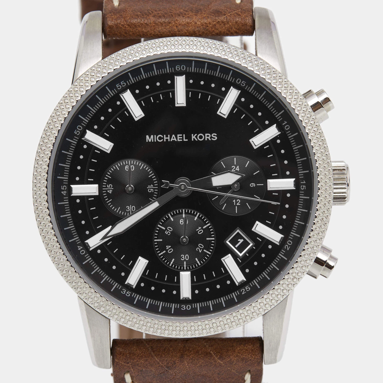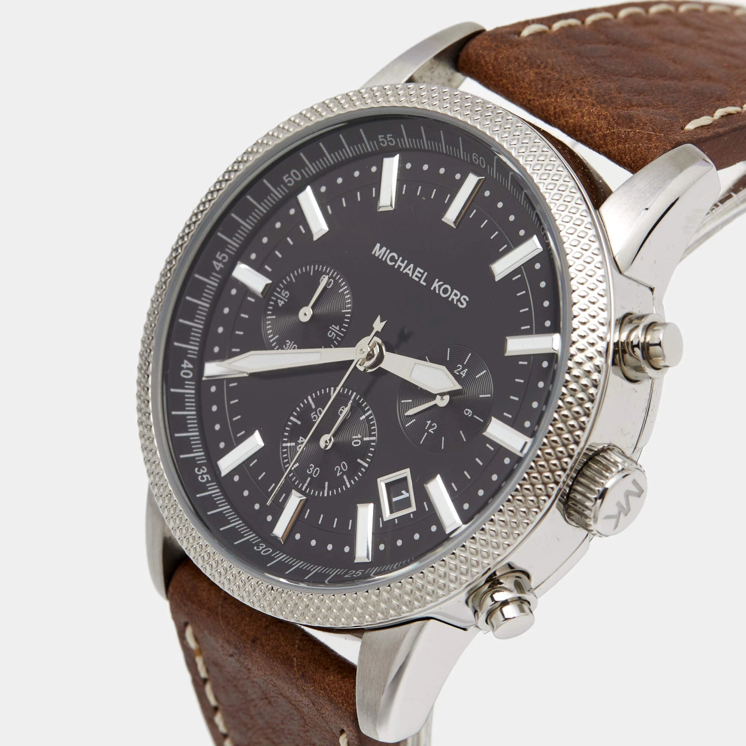Michael Kors brings you this Scout MK8309 timepiece to add to your style. It has a black dial housing silver-tone hour markers, three subdials, three hands, and a date window. The stainless steel case of 43 mm is held by a brown leather bracelet. The MK men’s watch is complete with a water resistance of 100 meters.
