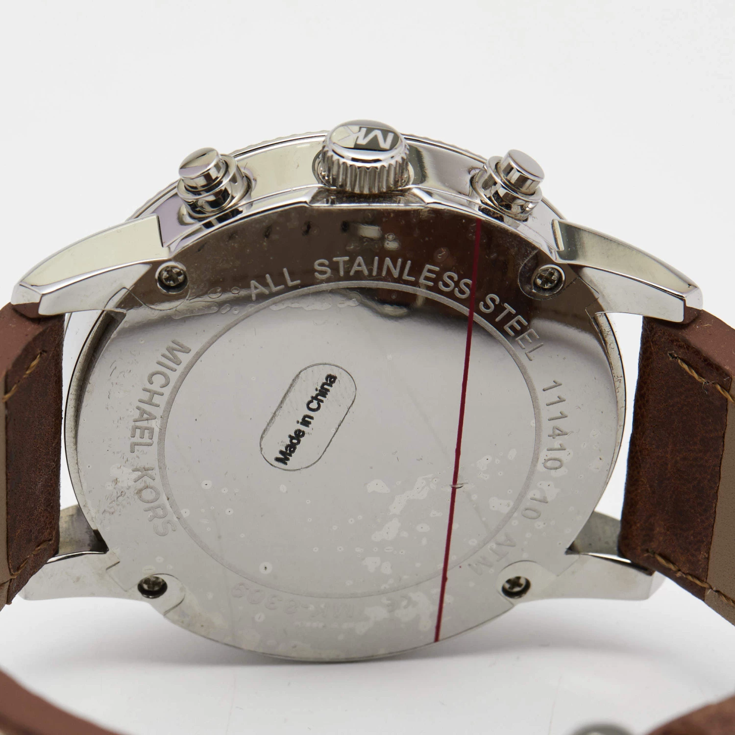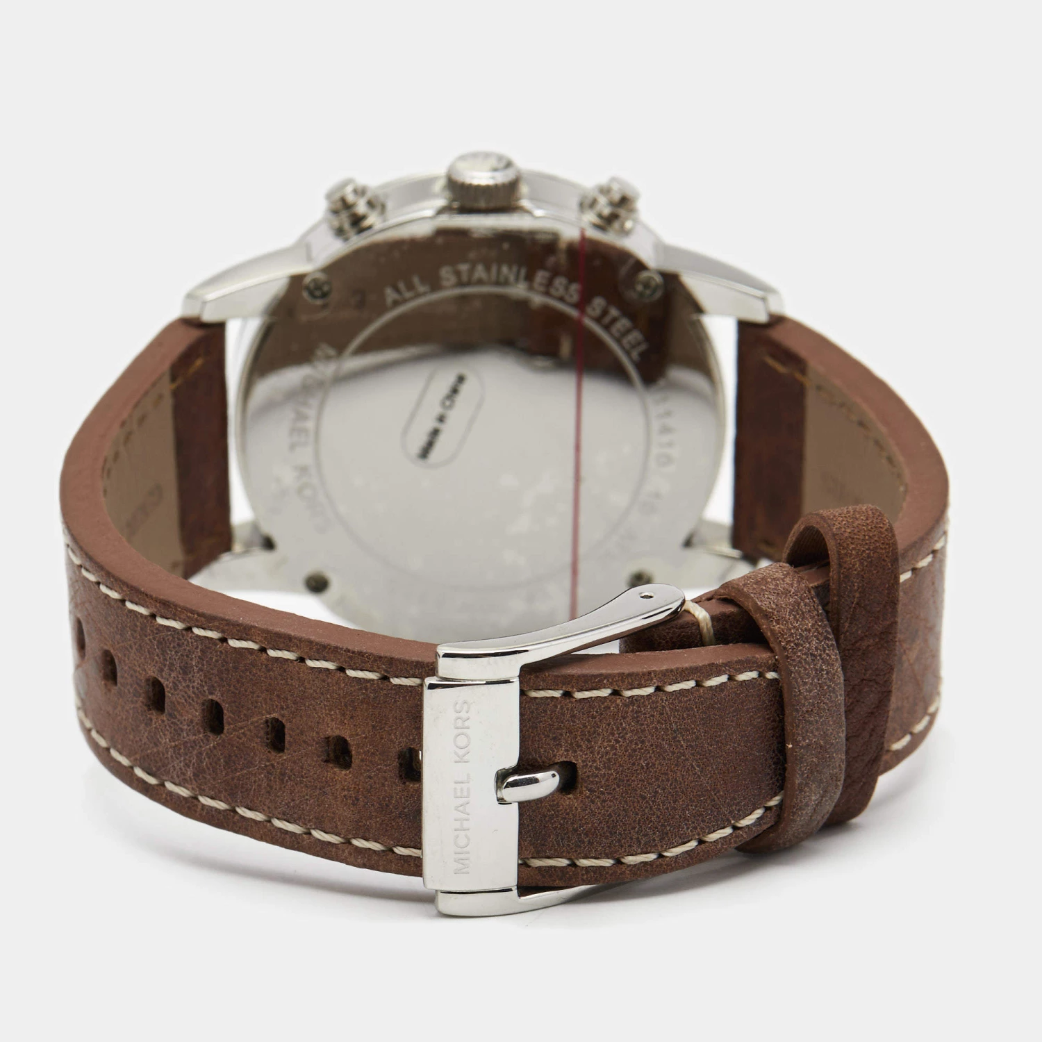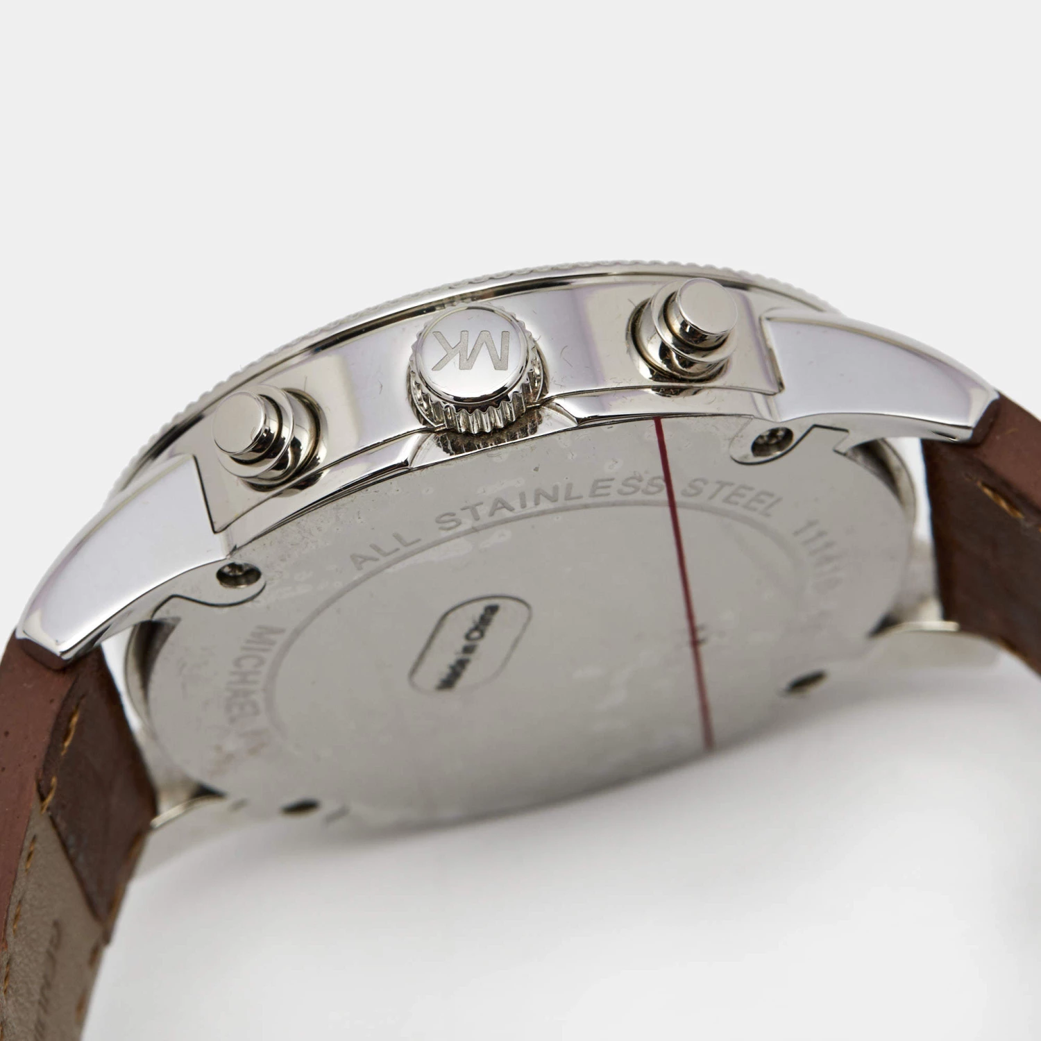 Michael Kors brings you this Scout MK8309 timepiece to add to your style. It has a black dial housing silver-tone hour markers, three subdials, three hands, and a date window. The stainless steel case of 43 mm is held by a brown leather bracelet. The MK men’s watch is complete with a water resistance of 100 meters.