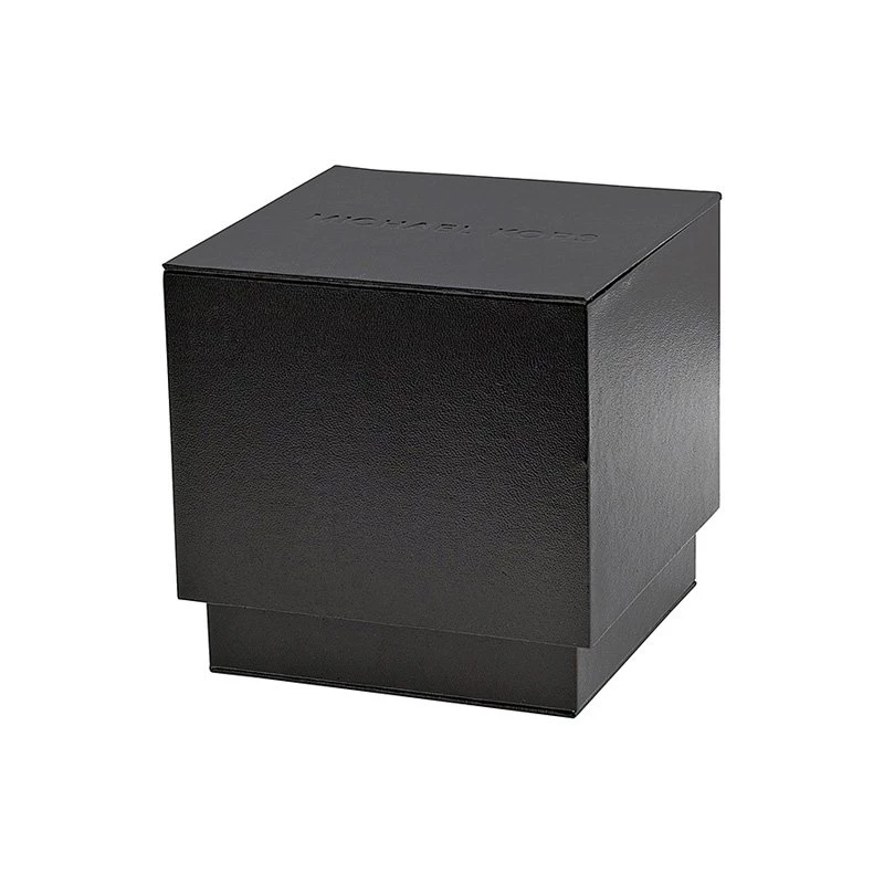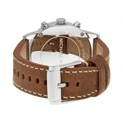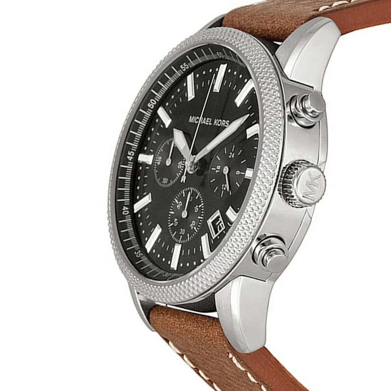 This Michael Kors Scout watch is a combination of style and exquisite craftsmanship. Crafted from stainless steel, it features a black dial, three sub-dials, bar index time indicators, a date window and luminous hands. The leather strap clasps on the wrist with a buckle closure. This 100M water resistant watch is perfect for daily wear.