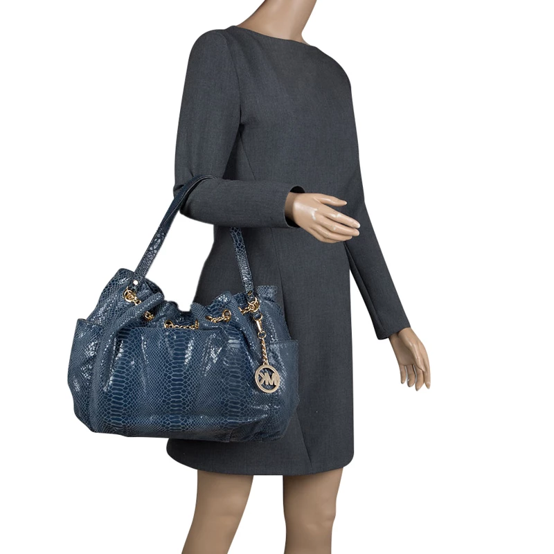 Elevate your style with this gorgeous Jet Set tote from Michael Kors. Crafted from blue python embossed leather, the bag features dual top handles, a Michael Kors charm and a slip pocket on each side. It has a spacious nylon lined interior that will hold all your belongings. This beauty is totally worth the splurge!