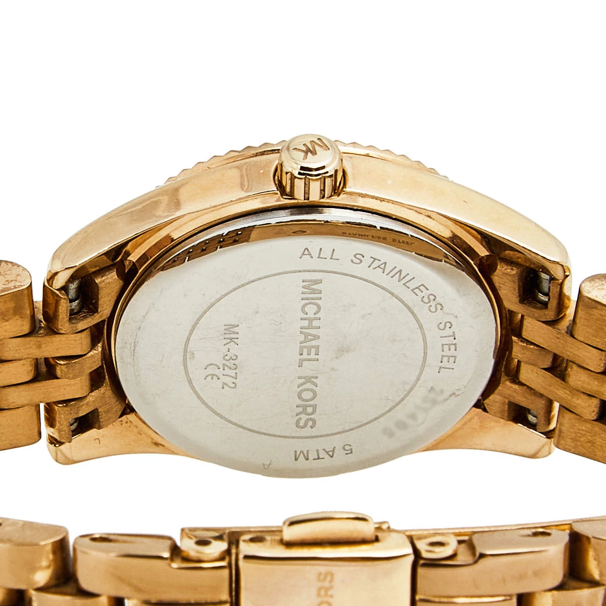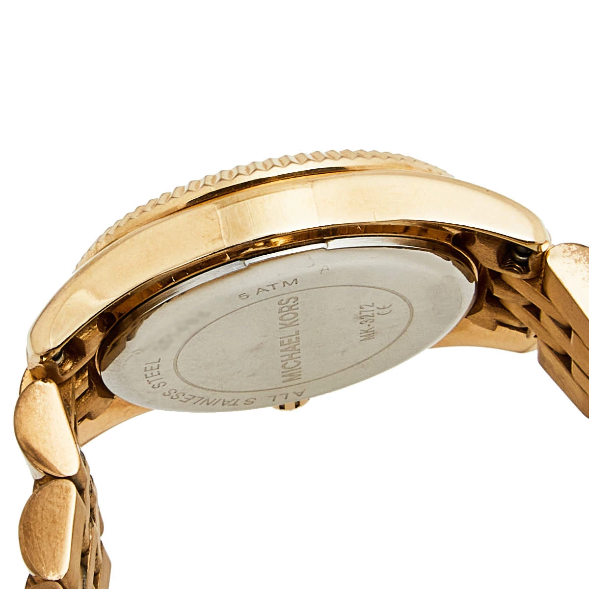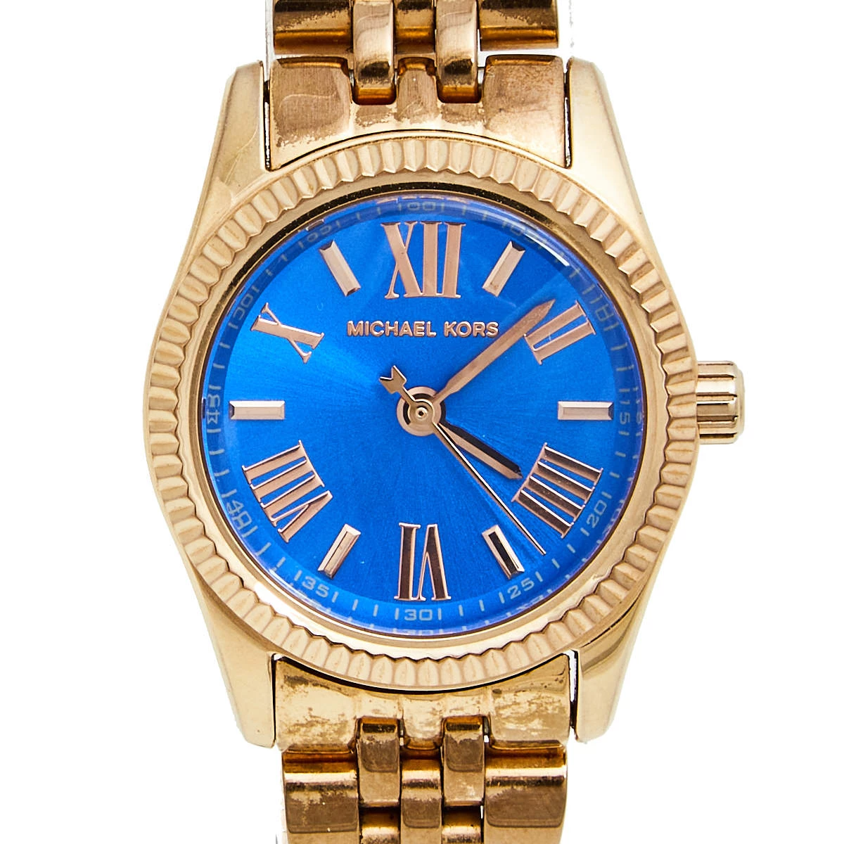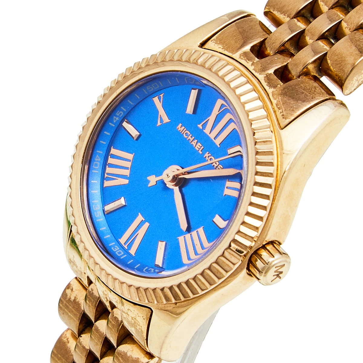 Designed with a fine blend of luxury and craftsmanship, this Lexington watch from Michael Kors is sure to delight your style. Made of gold-plated stainless steel, the quartz watch has a blue dial housing gold-tone markers and three hands. The watch is water-resistant up to 50 meters and it is secured by push-button closure.
