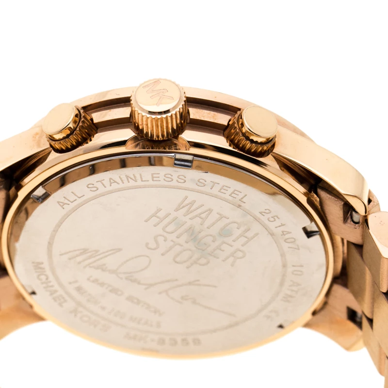 The Watch Hunger Stop by Michael Kors is an annual campaign to fight global hunger. Under this initiative, the brand launches special edition watches along with other personalised designs and in turn for the sales, meals are donated to children through the World Food Programme. This watch is from the Runway series of just 100 limited pieces created by the brand for Watch Hunger Stop. It is crafted from gold-plated stainless steel and its blue dial is covered in map details and fixed with gold-tone indicators and a date window. Water resistance of 100 meters and a push-button clasp completes this Chronograph delight.