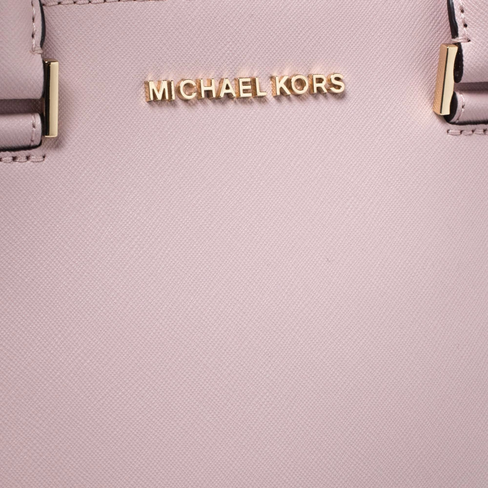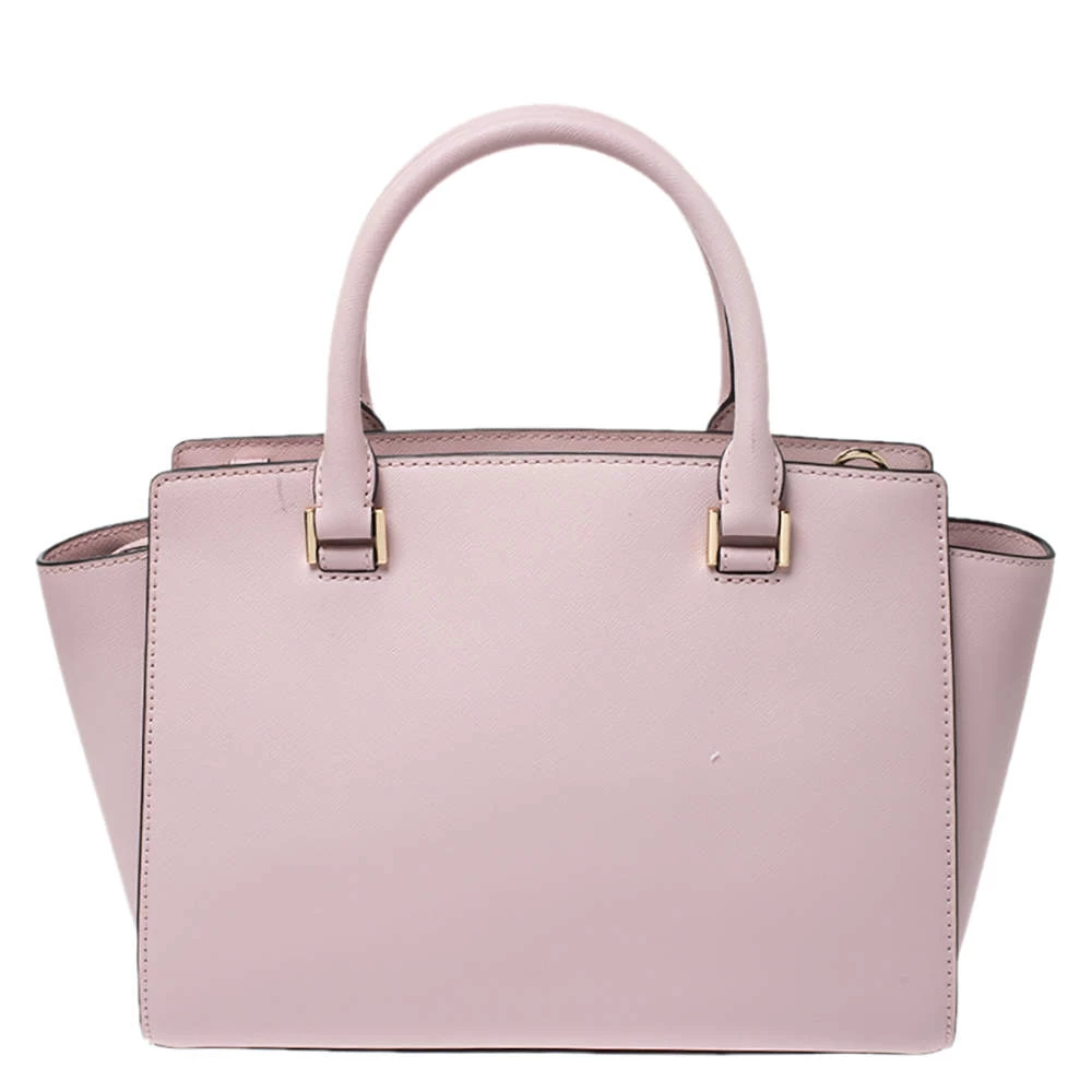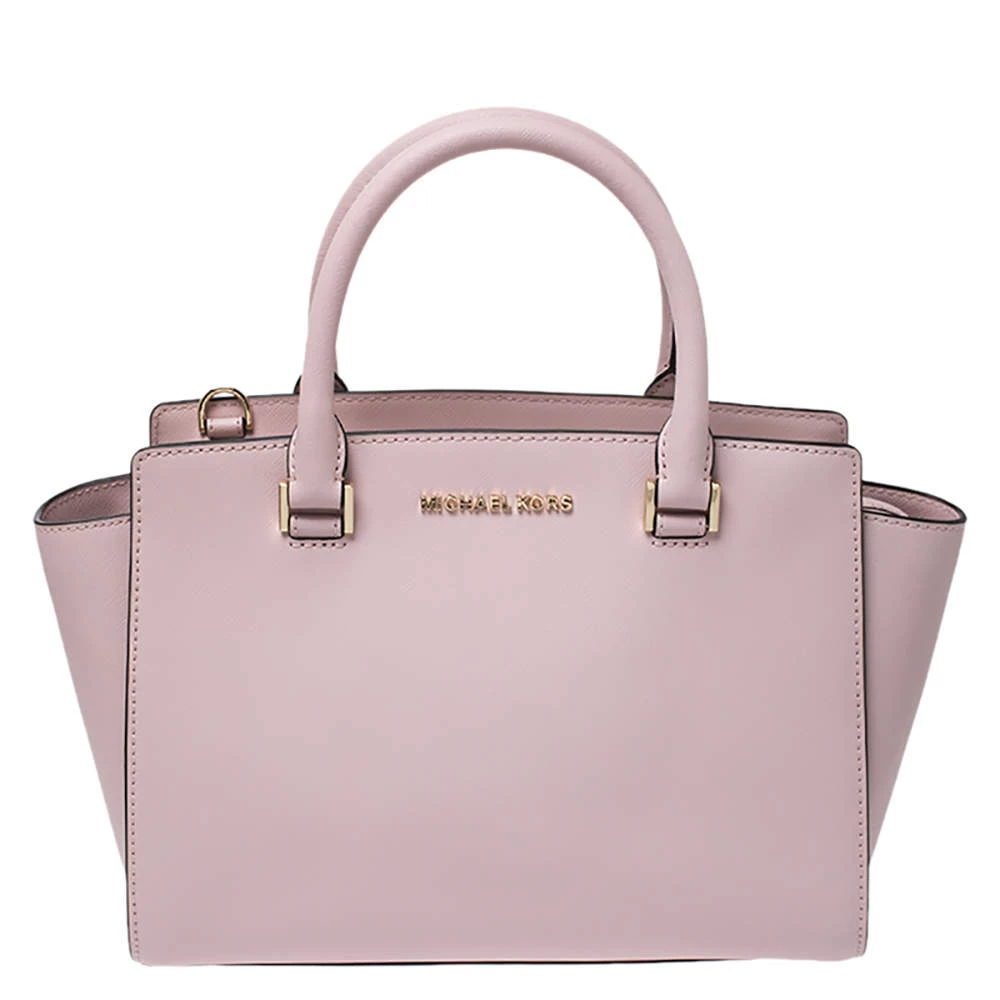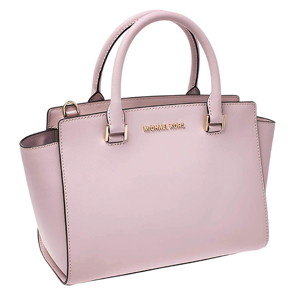 Carry this gorgeous Selma satchel by Michael Kors to all your outings. Crafted from blush pink leather, the bag features dual top handles, a detachable shoulder strap and protective metal feet at the bottom. It has a spacious nylon-lined interior that will hold all your daily necessities. This beauty is totally worth the splurge!