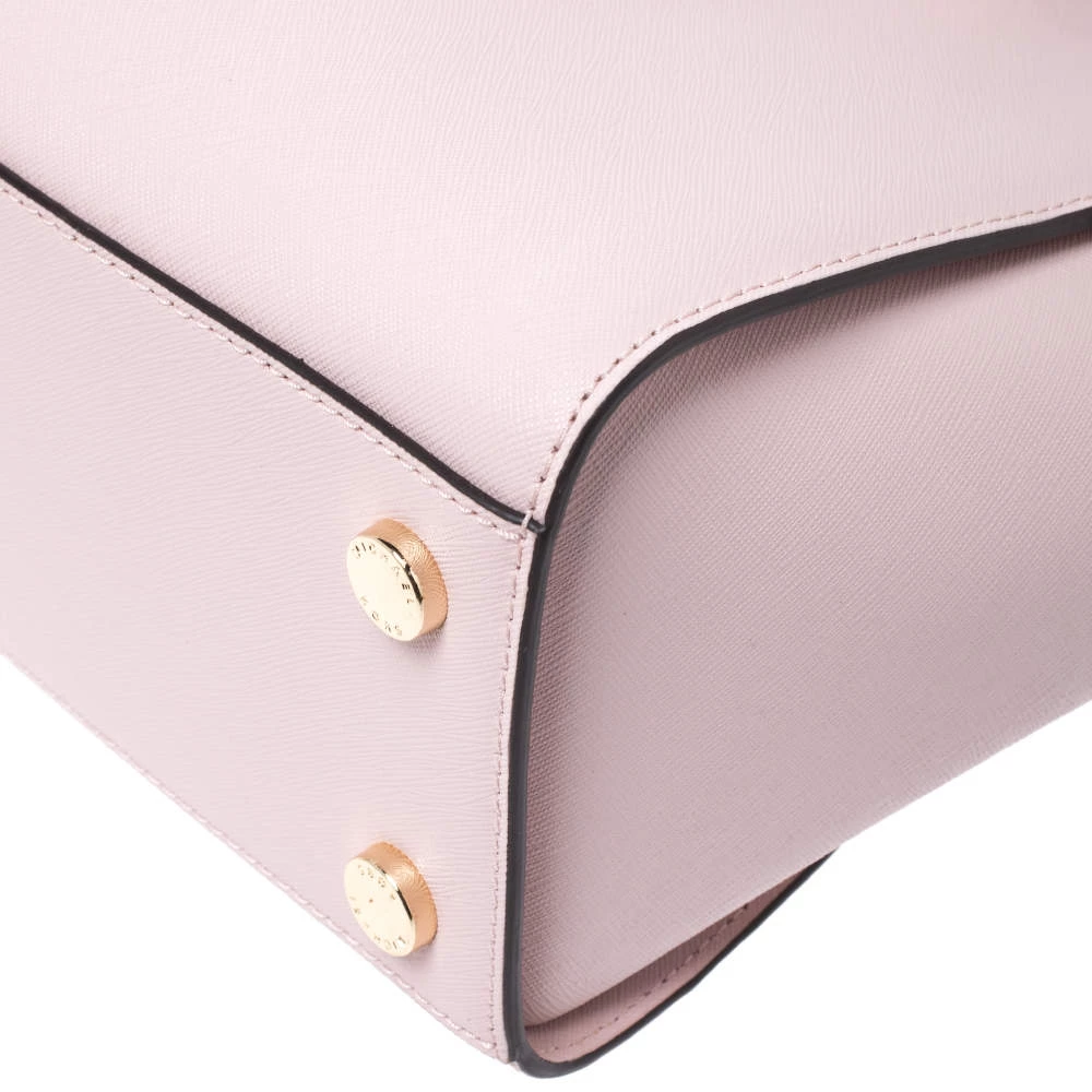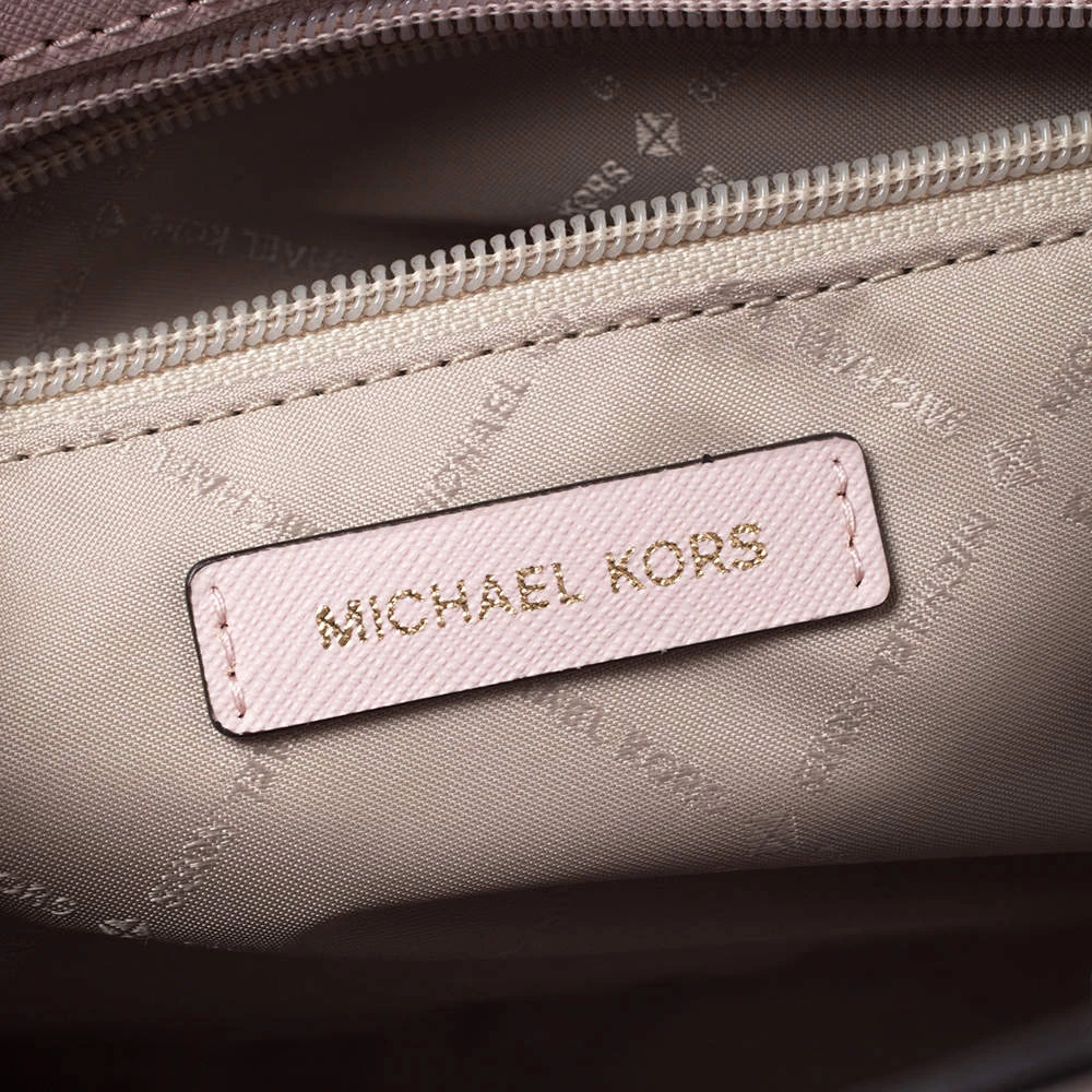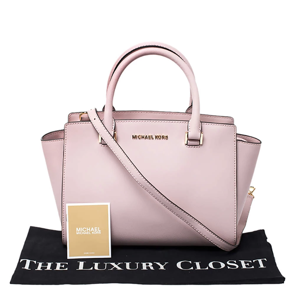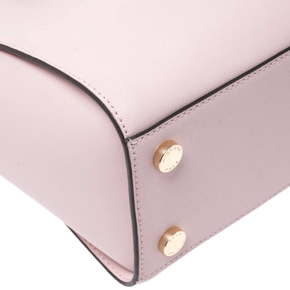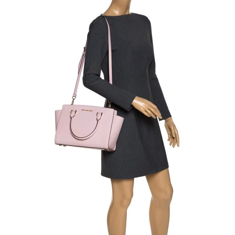 Carry this gorgeous Selma satchel by Michael Kors to all your outings. Crafted from blush pink leather, the bag features dual top handles, a detachable shoulder strap and protective metal feet at the bottom. It has a spacious nylon-lined interior that will hold all your daily necessities. This beauty is totally worth the splurge!