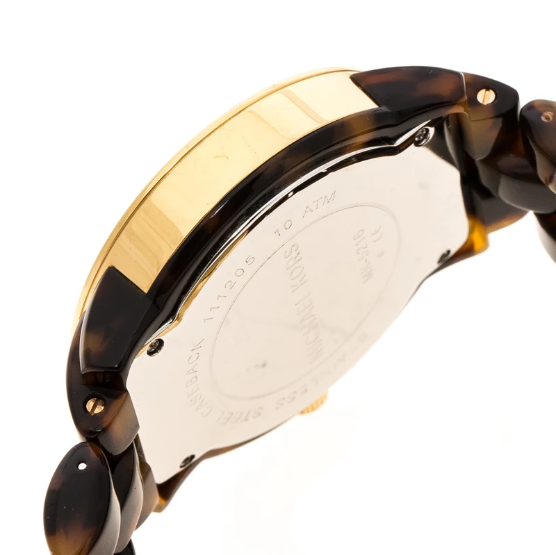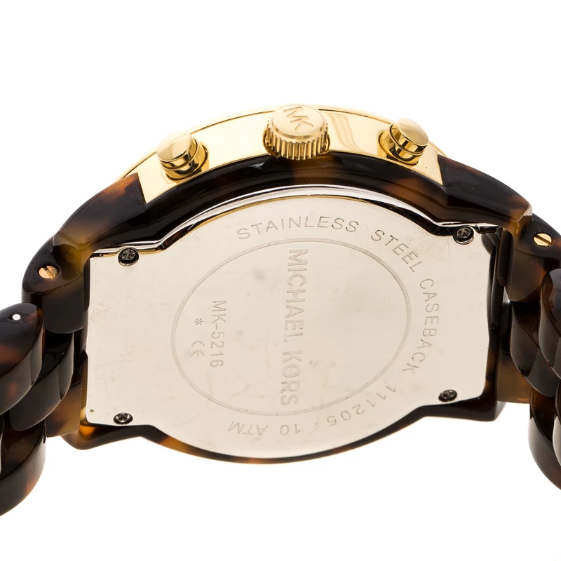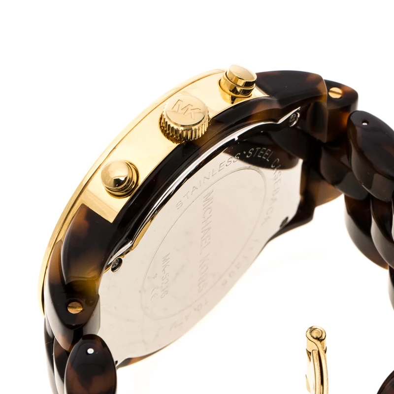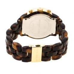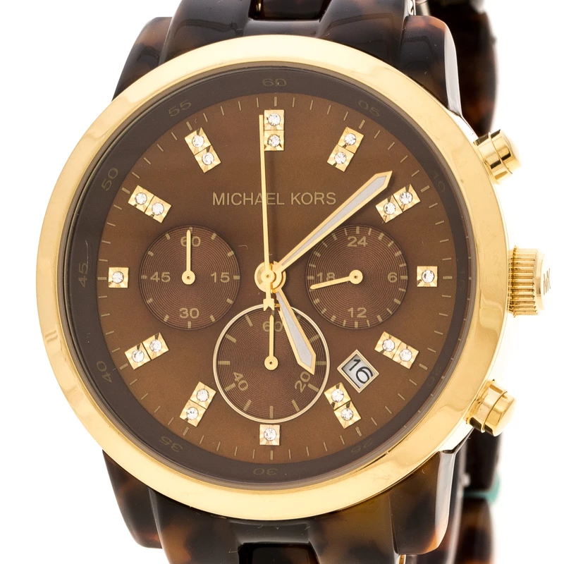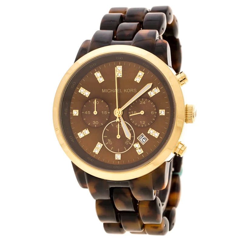 Your everyday style deserves a luxury touch like this wristwatch from Michael Kors. It is made from gold-plated metal as well as acrylic, a blend that adds to the overall beauty of the piece. The brown dial has crystal hours markers, stick minute markers around the outer rim, a date window between the 4 and 5 o’clock positions, and three subdials for the chronograph. The watch is topped with a water resistance of 100 meters.