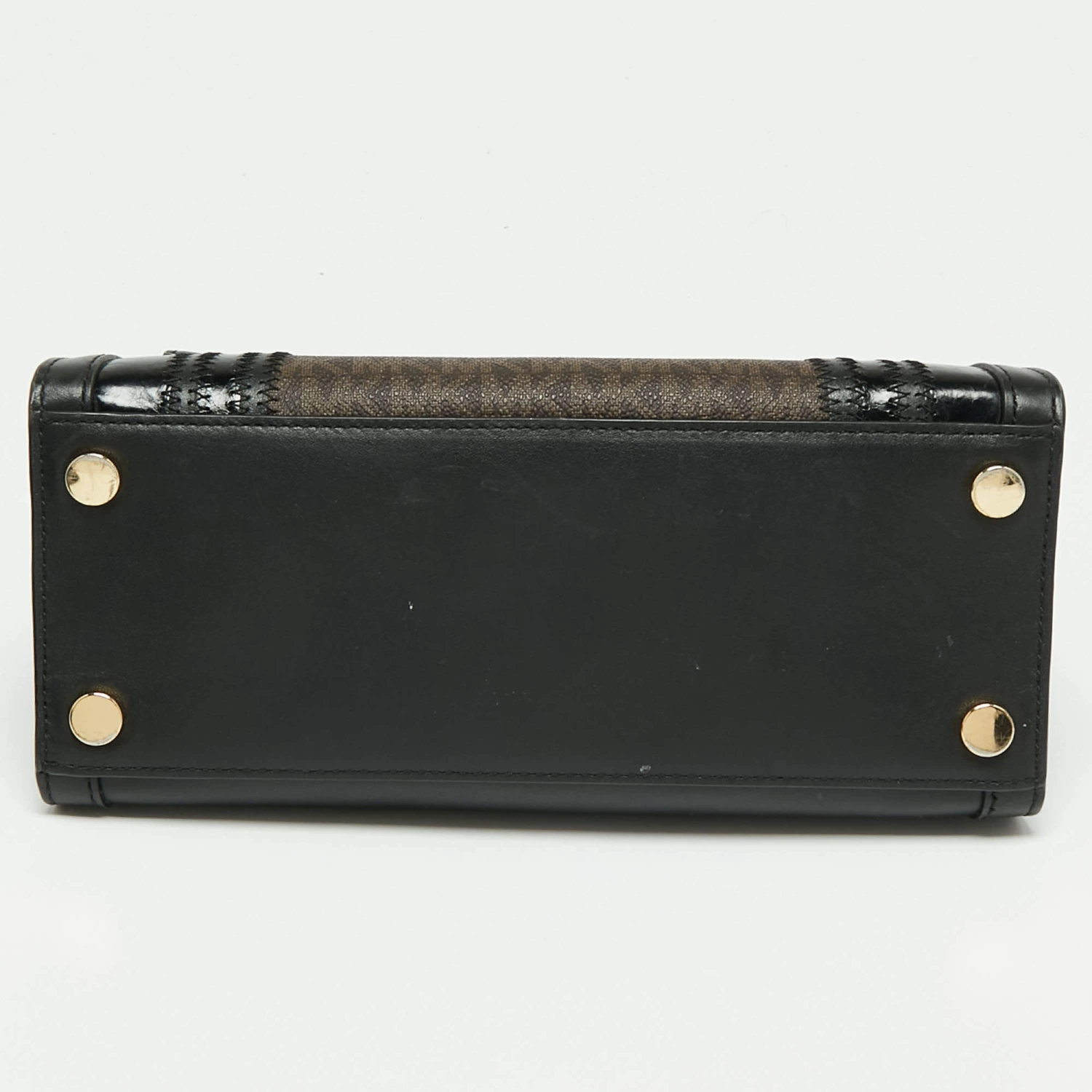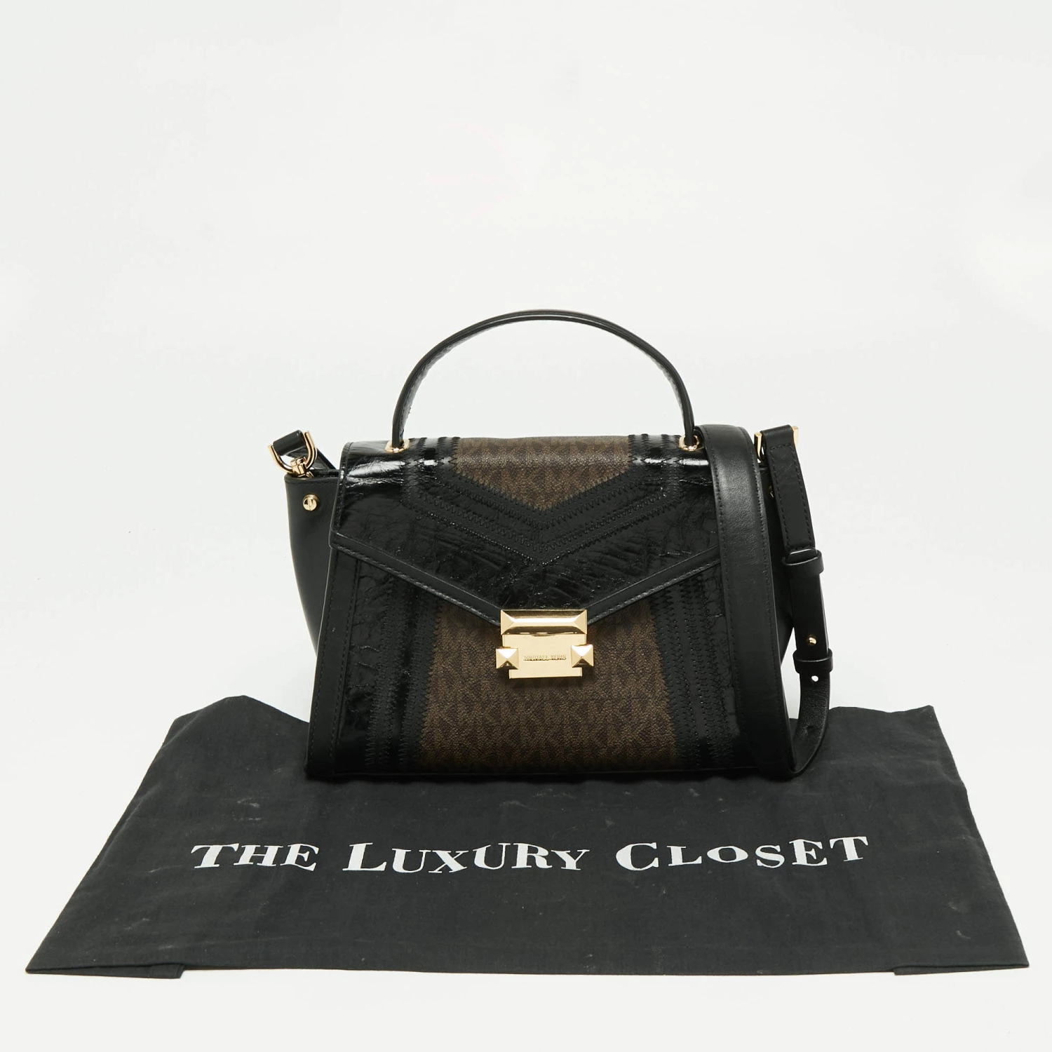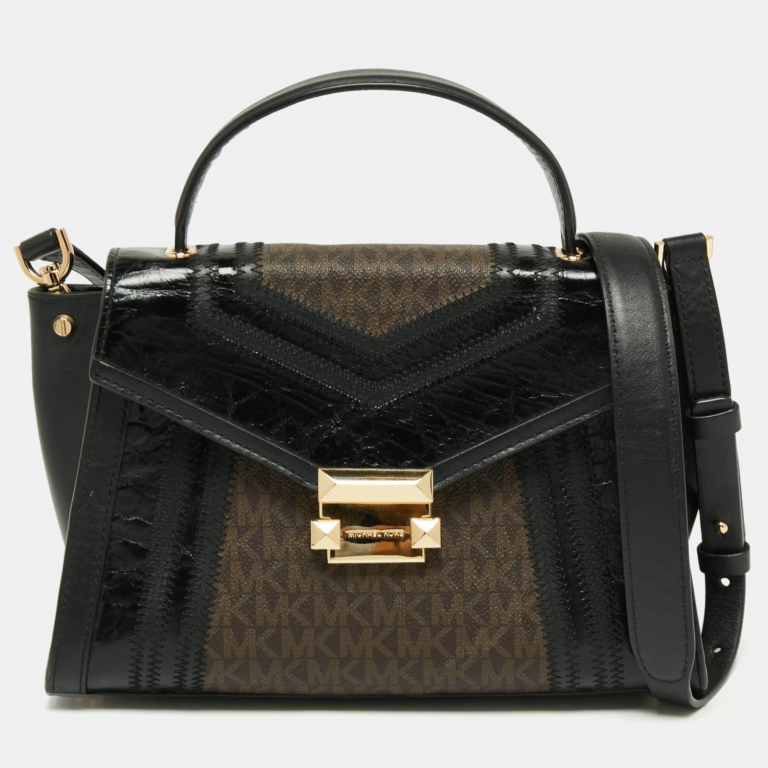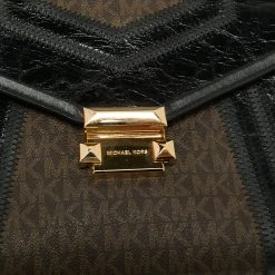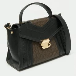 Beautified with gold-tone accents and a structured silhouette, this Michael Kors Whitney bag is an ideal option for your next outing. It comes crafted from the signature coated canvas and leather and exhibits the brand signature on the front, dual handling options, and a nylon-lined interior.