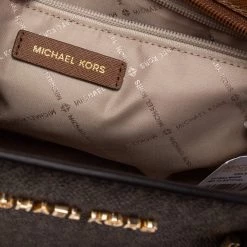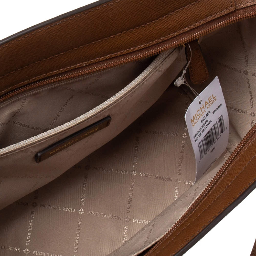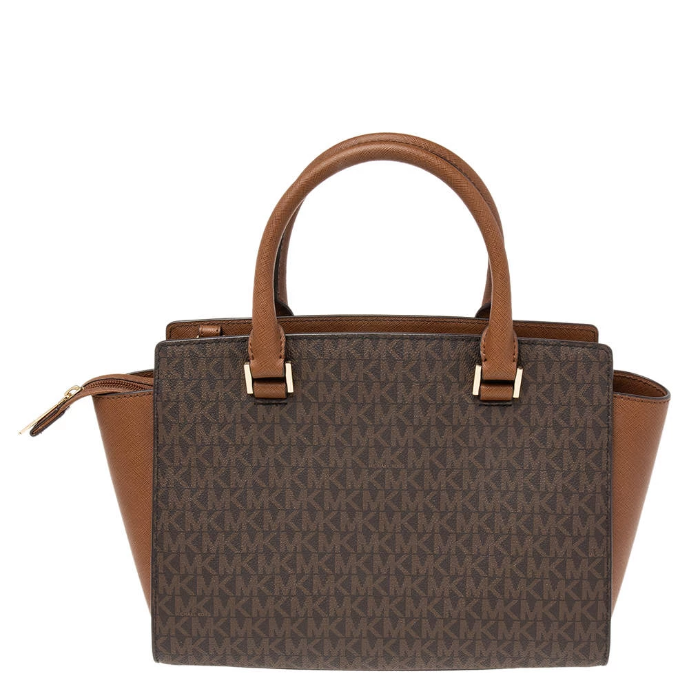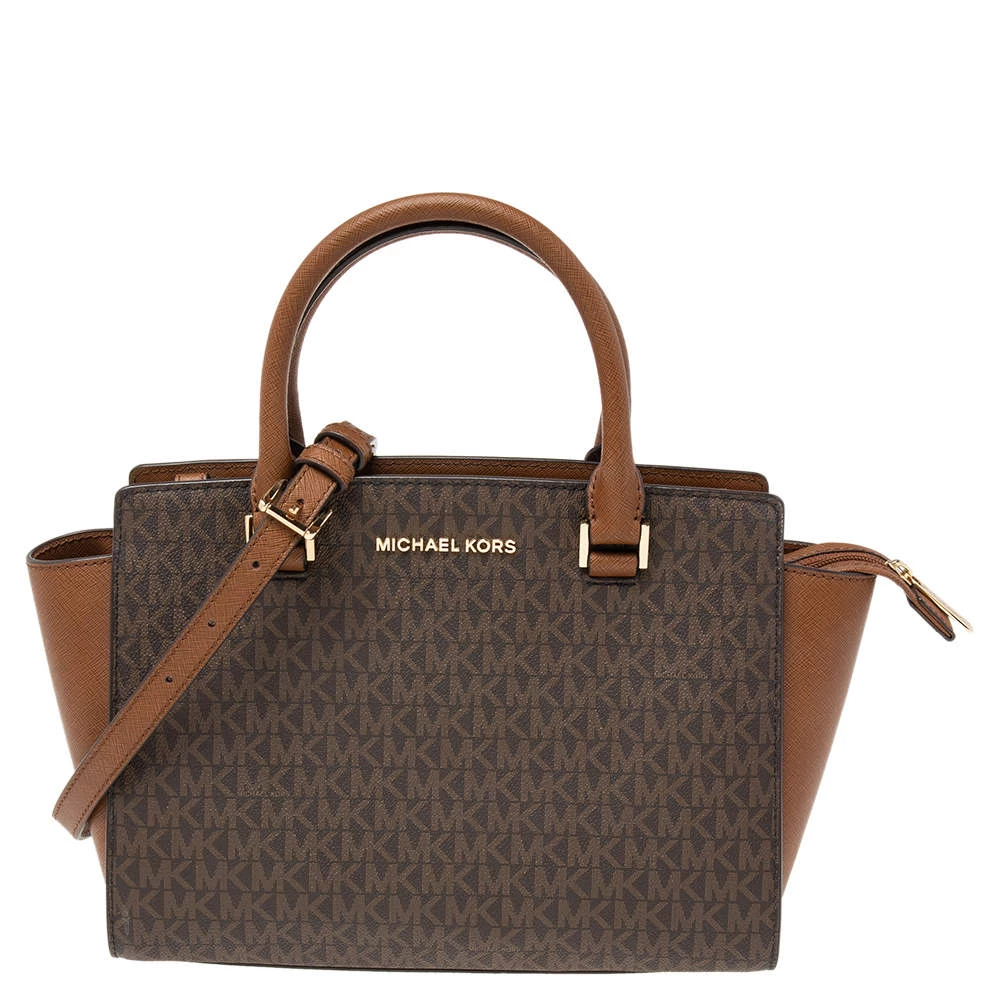 This Selma satchel from Michael Kors is both elegant and fashionable. Crafted from brown coated canvas and leather, this bag features a gold-toned logo embellishment on the front and a nylon-lined interior. It has dual handles. This exquisite satchel will complete all your ensembles with perfection.