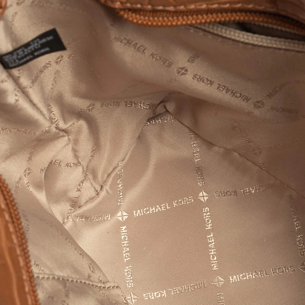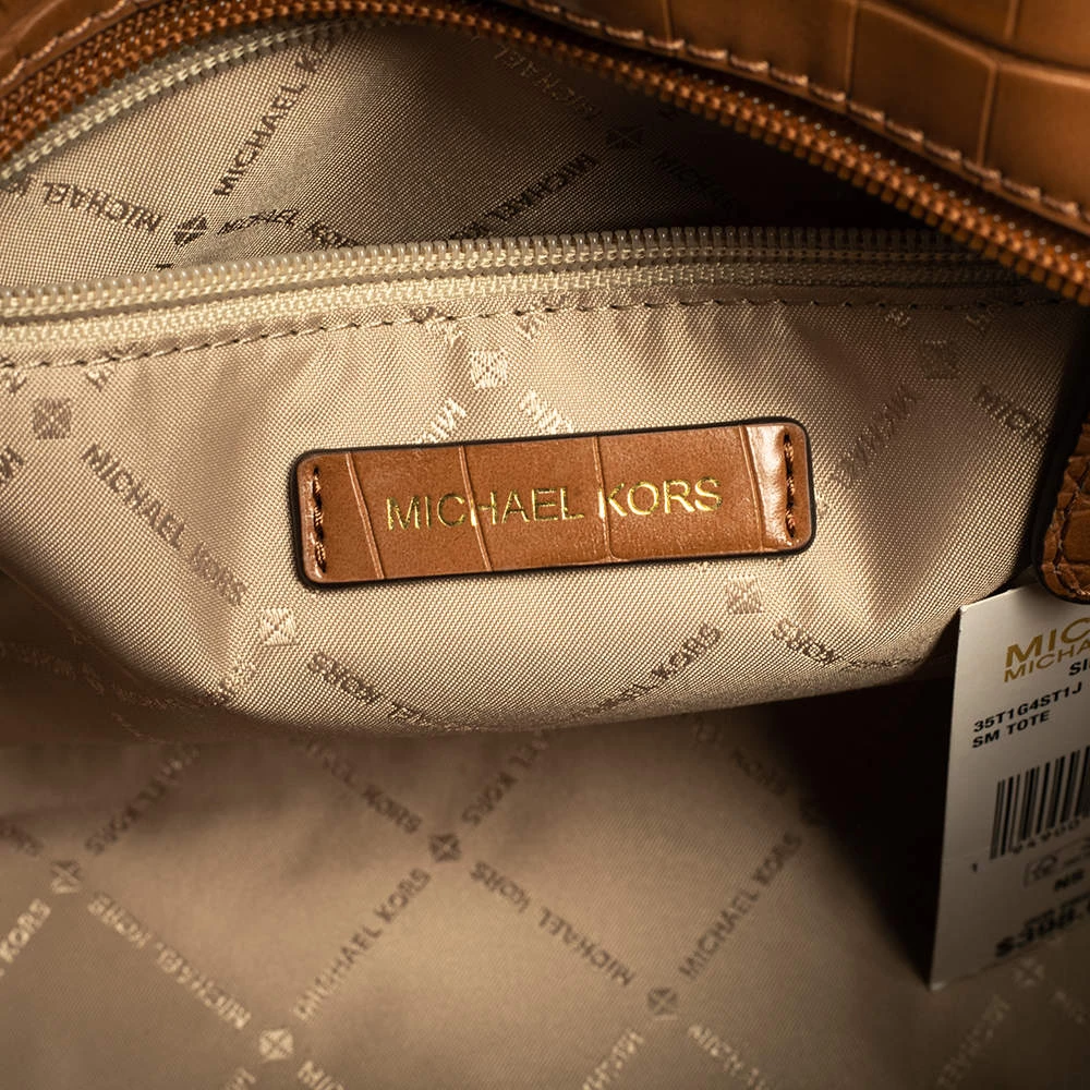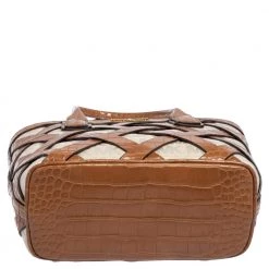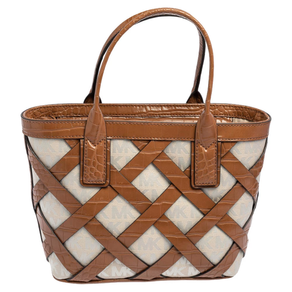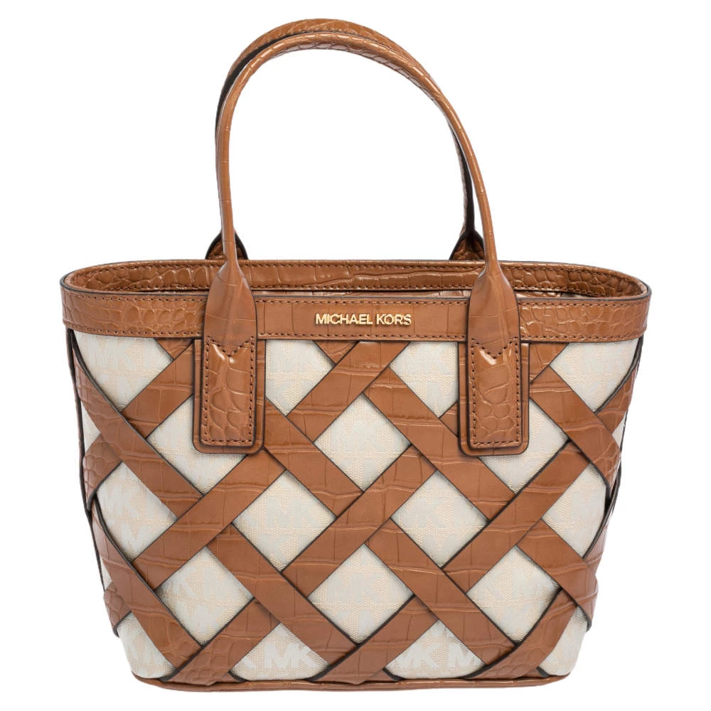 Characterized by a unique woven design, this Michael Kors Sienna tote is a beautiful creation from the house. It has been expertly designed from signature coated canvas and croc-embossed leather and comes fitted with two top handles. It bears the brand logo on the exterior and can easily hold your day-to-day essentials.
