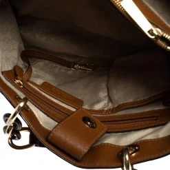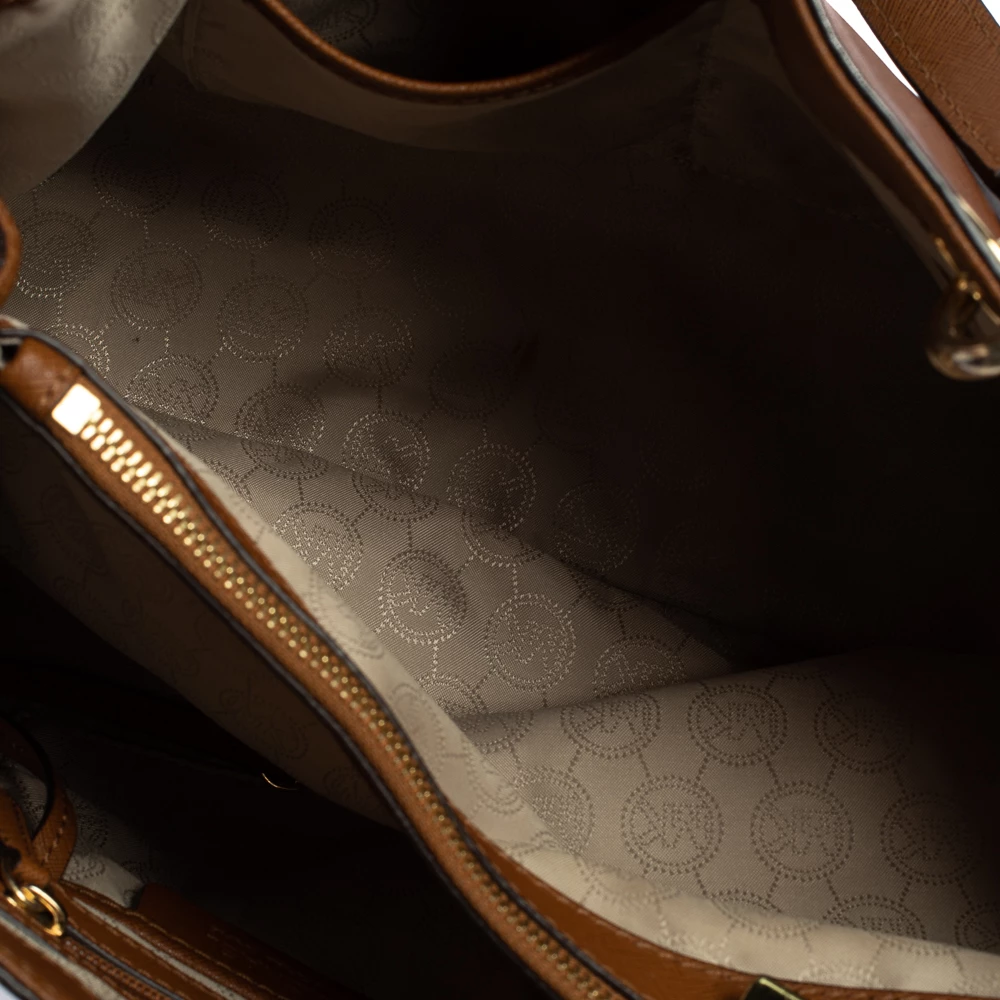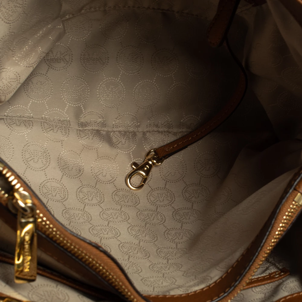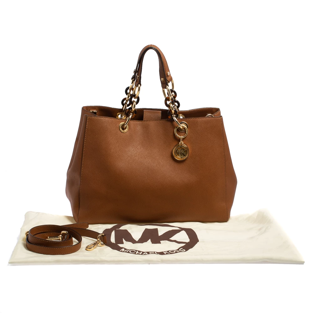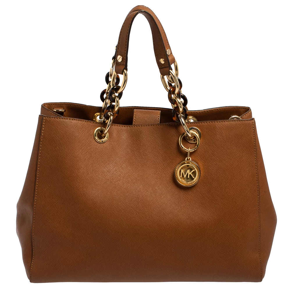 This Cynthia tote by Michael Kors is a bag ready to blend in with the busy life of the women of today. Meticulously crafted from leather, it features a brown hue and two handles as well as a shoulder strap for you to parade it. The bag is equipped with a spacious fabric-lined interior that has a zip compartment. Complete with gold-tone hardware and their MK charm, this bag will make an ideal buy.