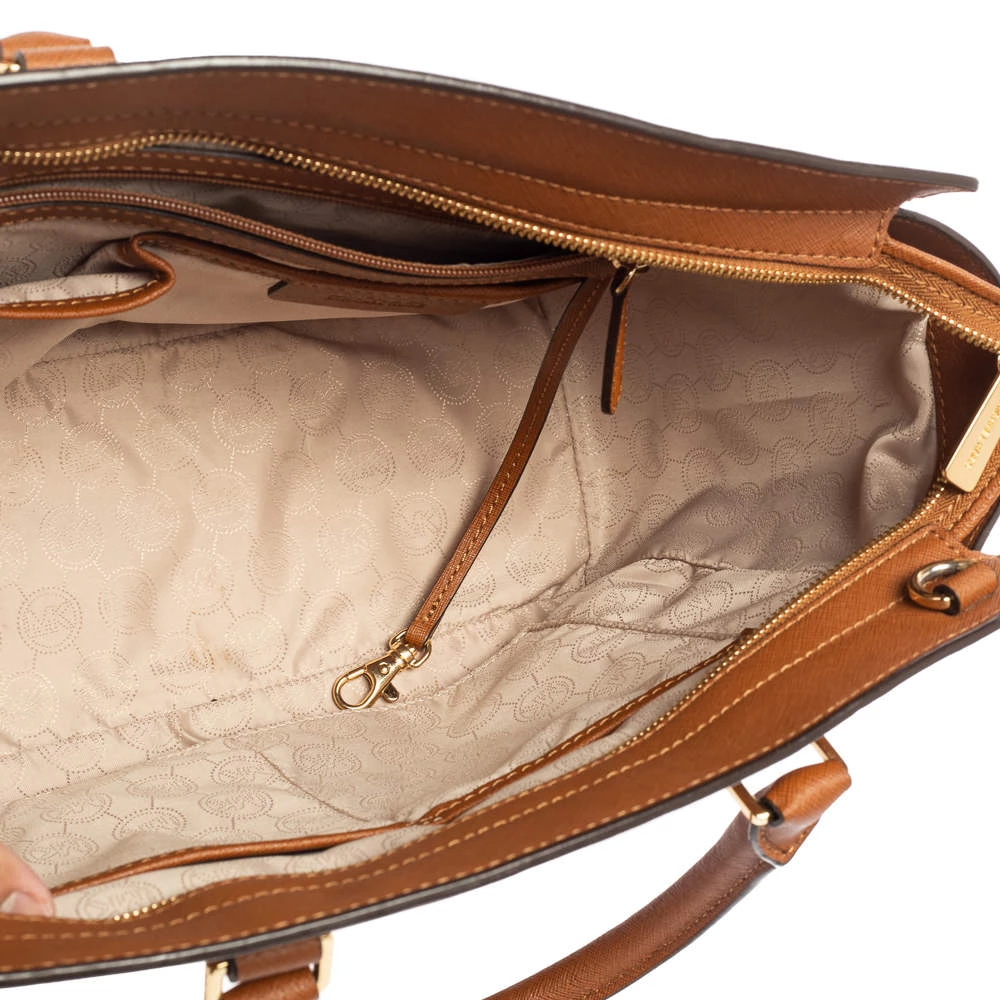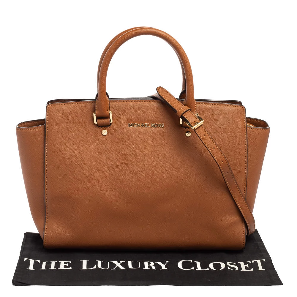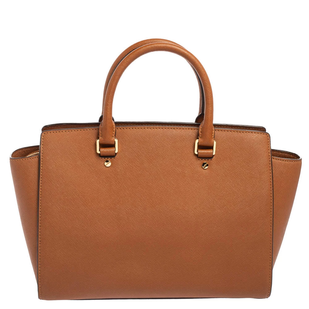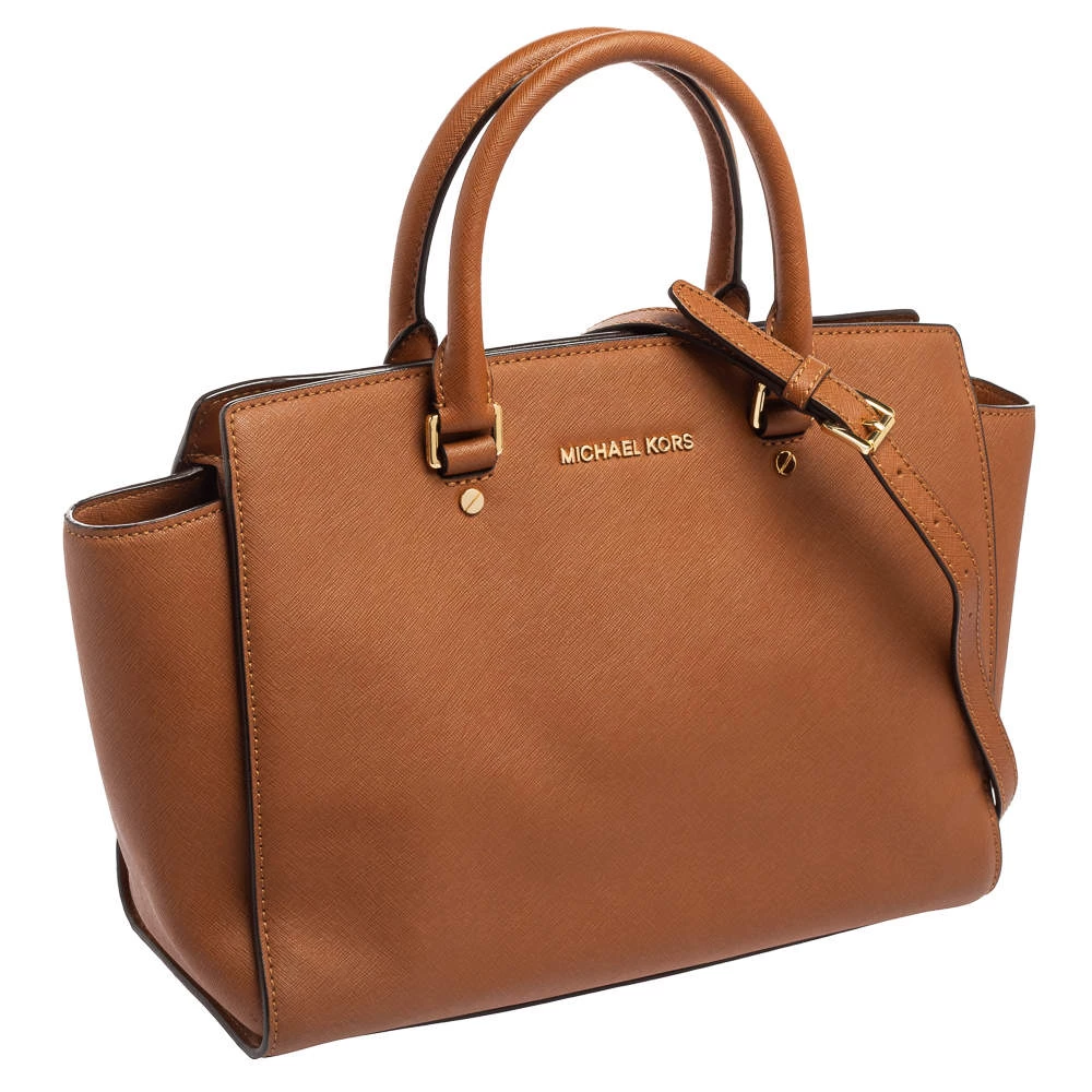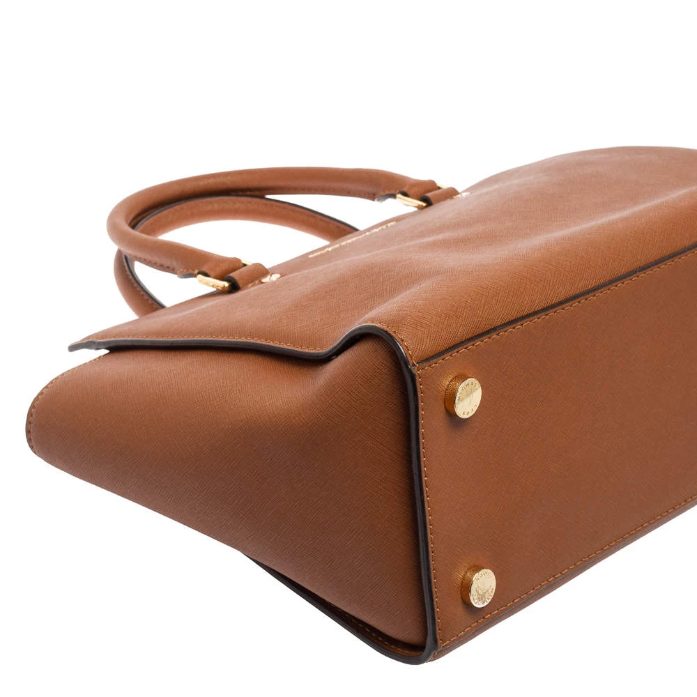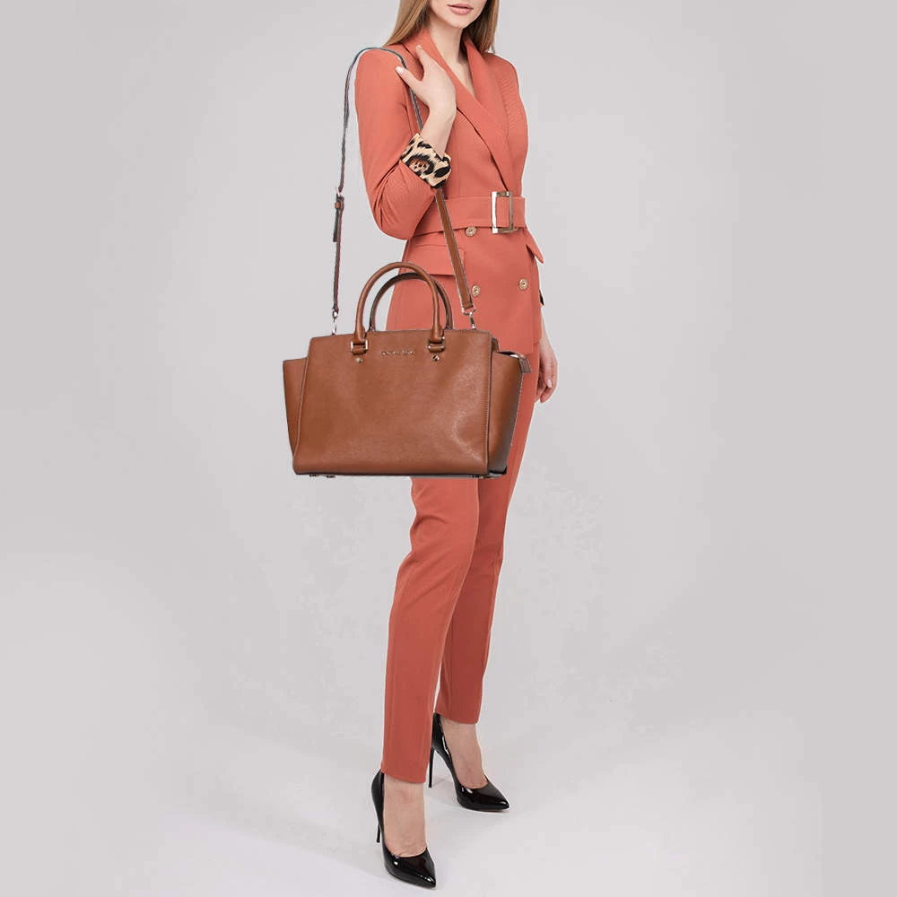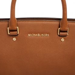 This Selma satchel from MICHAEL Michael Kors is both elegant and functional. Crafted from brown leather, the bag features a structured silhouette, two top handles, and a detachable shoulder strap. The fabric-lined interior has enough space to hold all your daily essentials. Get your hands on this beauty right away!