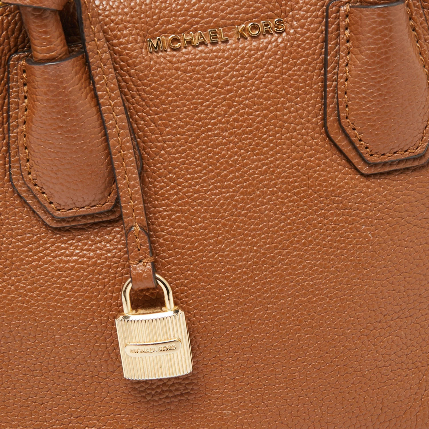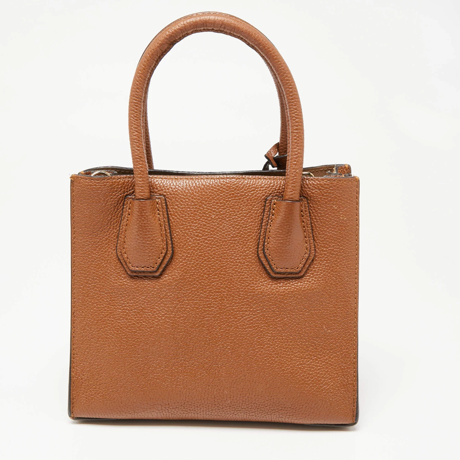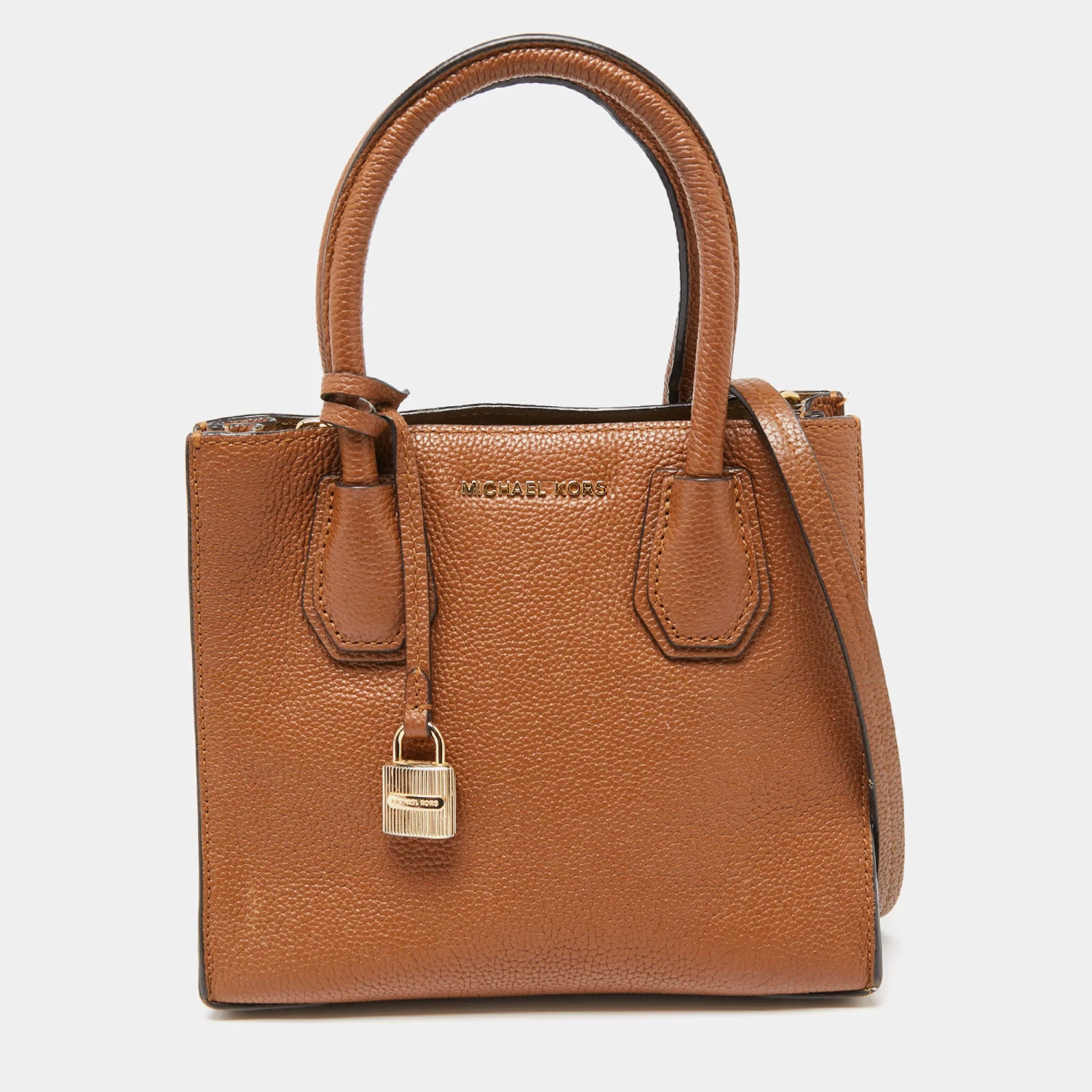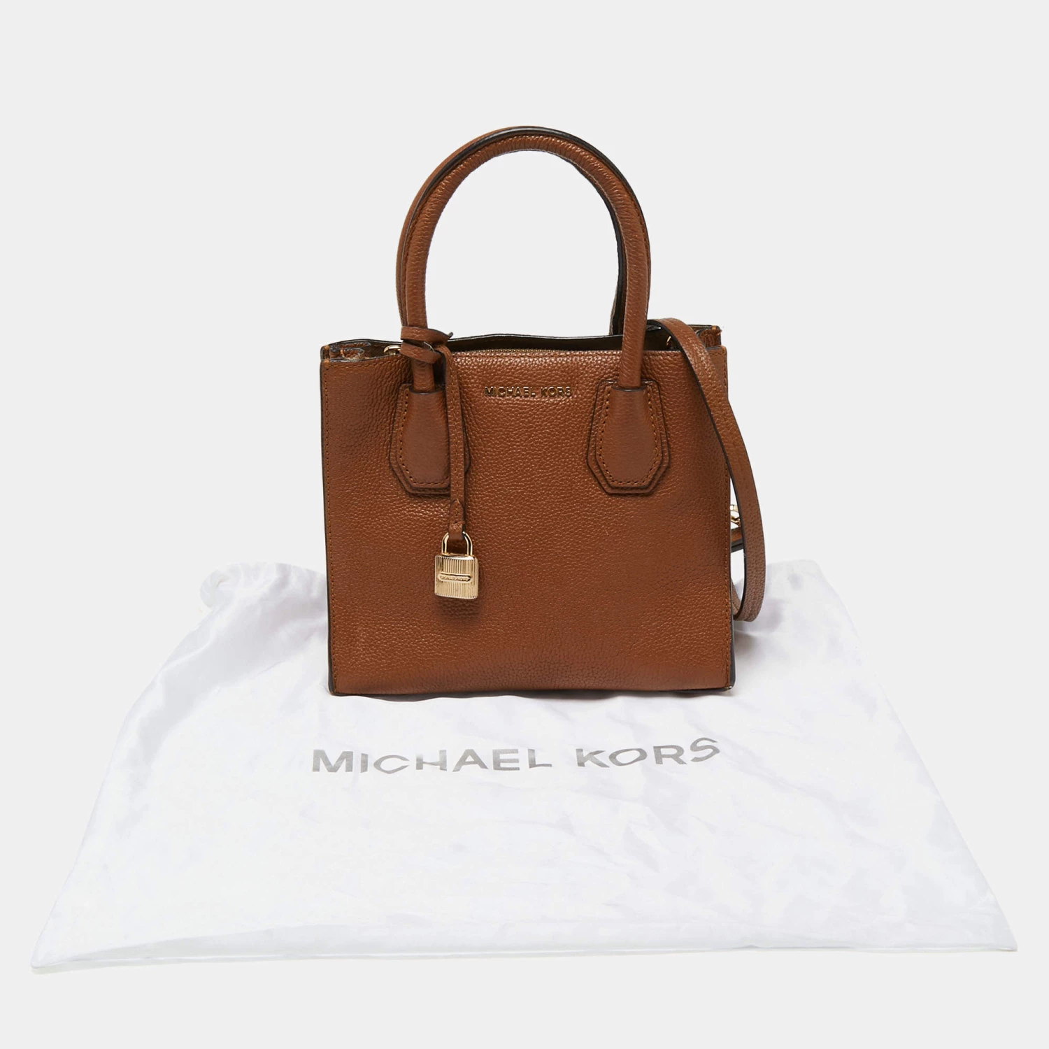 Made using brown leather, this Michael Kors tote brings a convenient size and a refined appeal. It features two handles, a detachable strap, gold-tone hardware, and a lined interior.