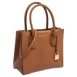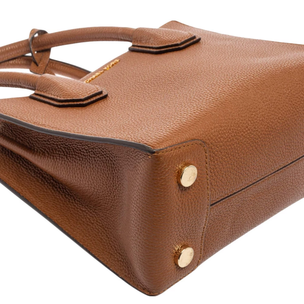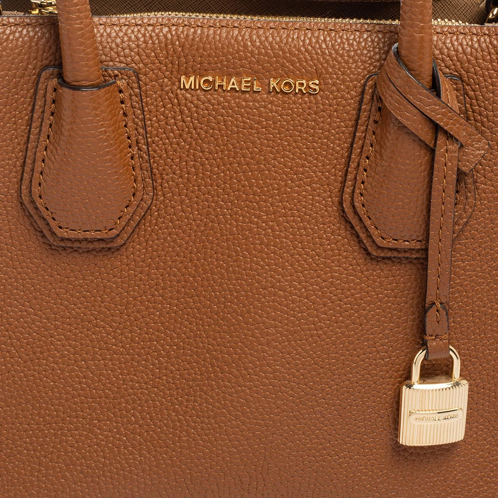 Stylish and easy to carry, this Michael Kors leather satchel will be a fine choice for work or after. This bag can easily fit in all your essentials. It can be held in your arm or hand using the two handles or worn on the shoulder or across the body using the detachable strap.