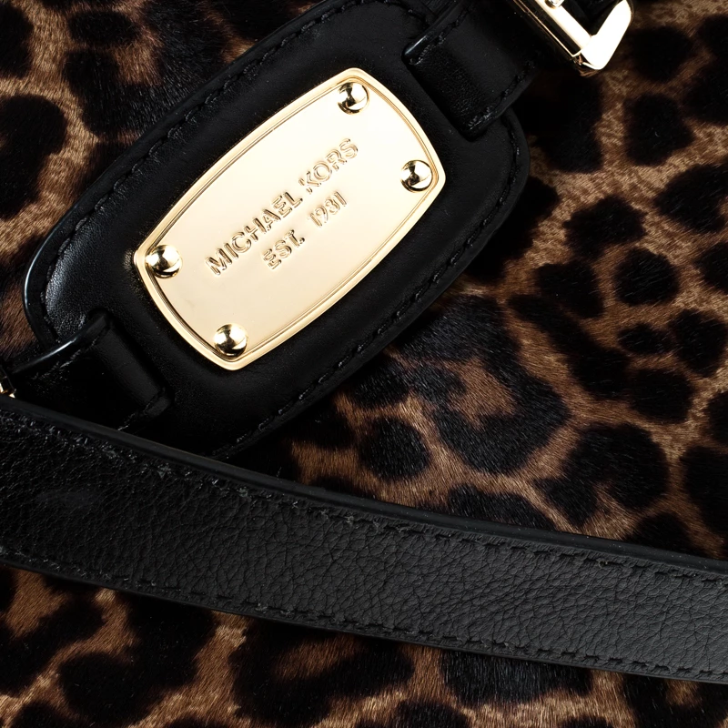 This striking Hamilton tote from Michael Kors is a worthy buy. It has been crafted from leopard print calfhair and leather in a classy brown shade and decorated with a logo plaque on the front. The bag has two handles, a shoulder strap, and a spacious nylon interior. This creation is ideal for everyday use.