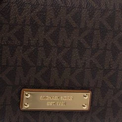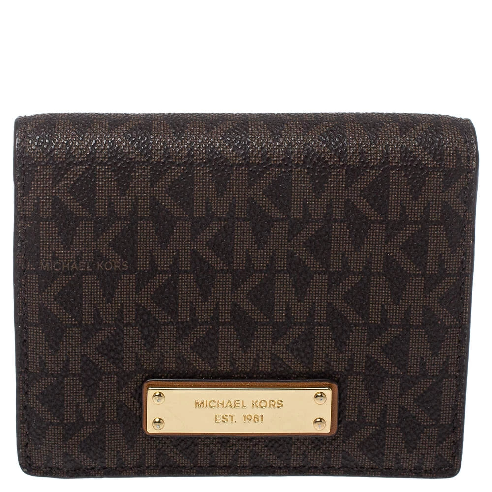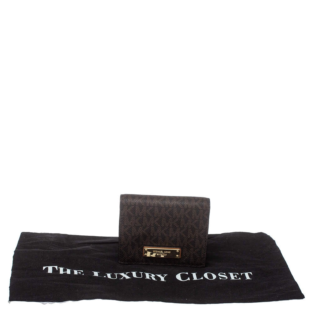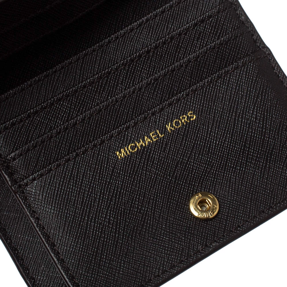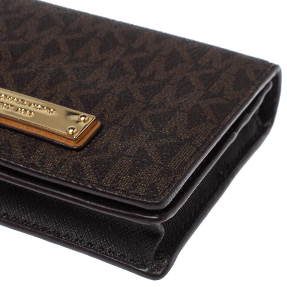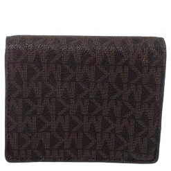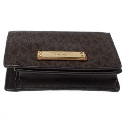 This functional creation from Michael Kors is designed for convenience. Crafted from monogram coated canvas, this brown wallet has the brand plaque on the front and leather-fabric lining on the insides. It makes for a great buy.