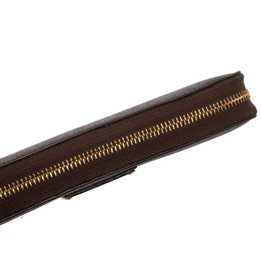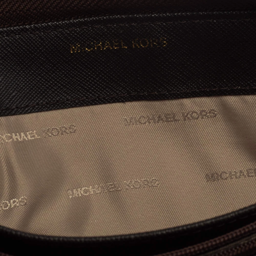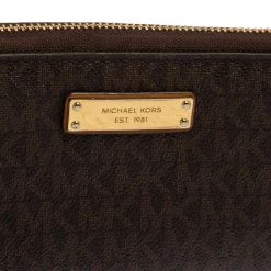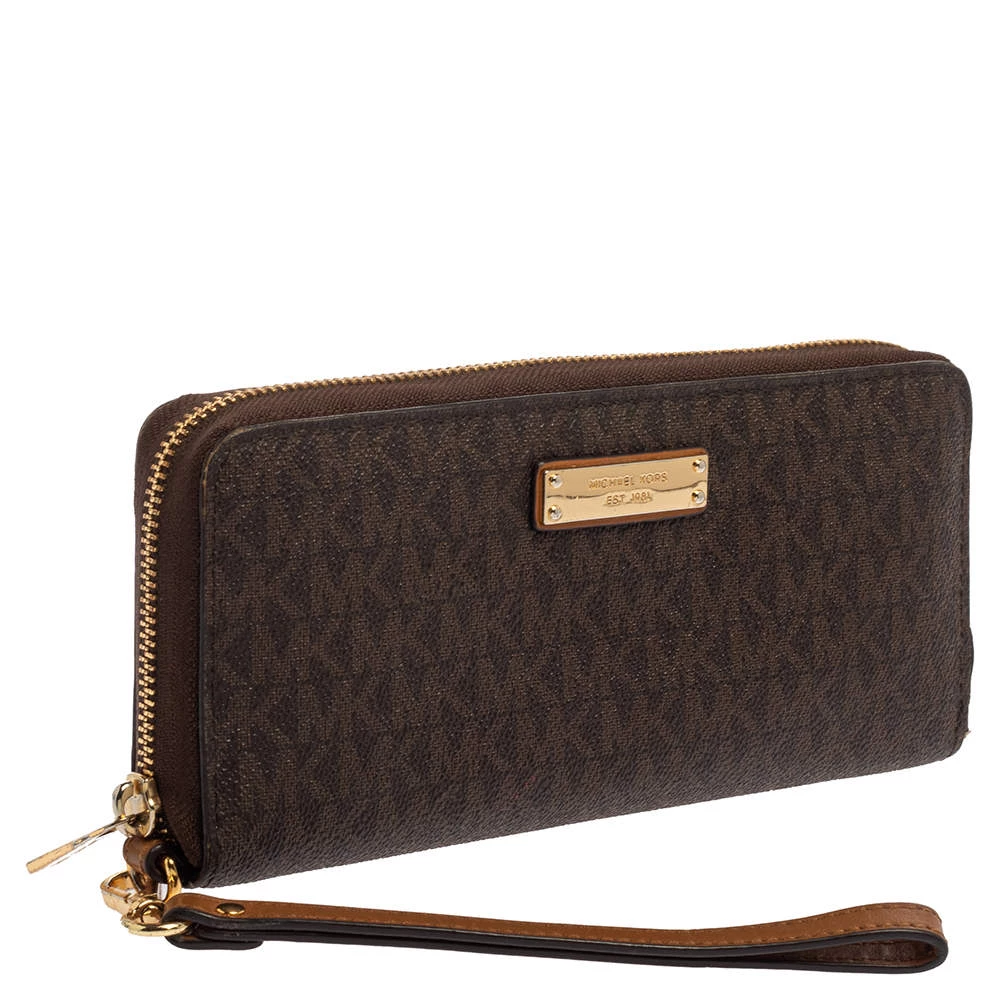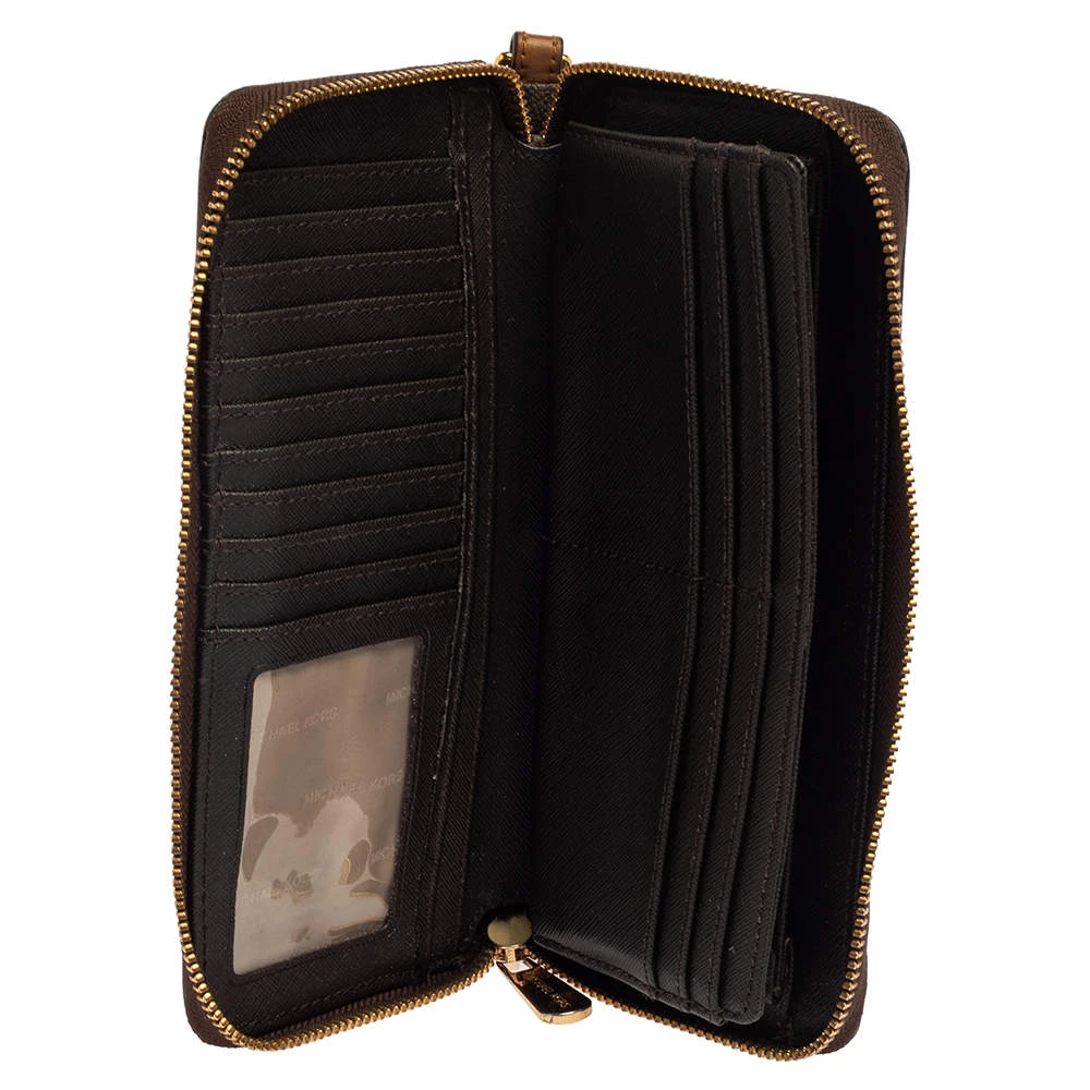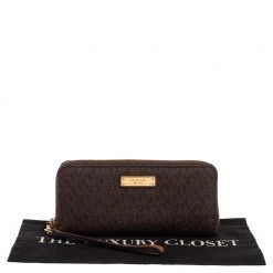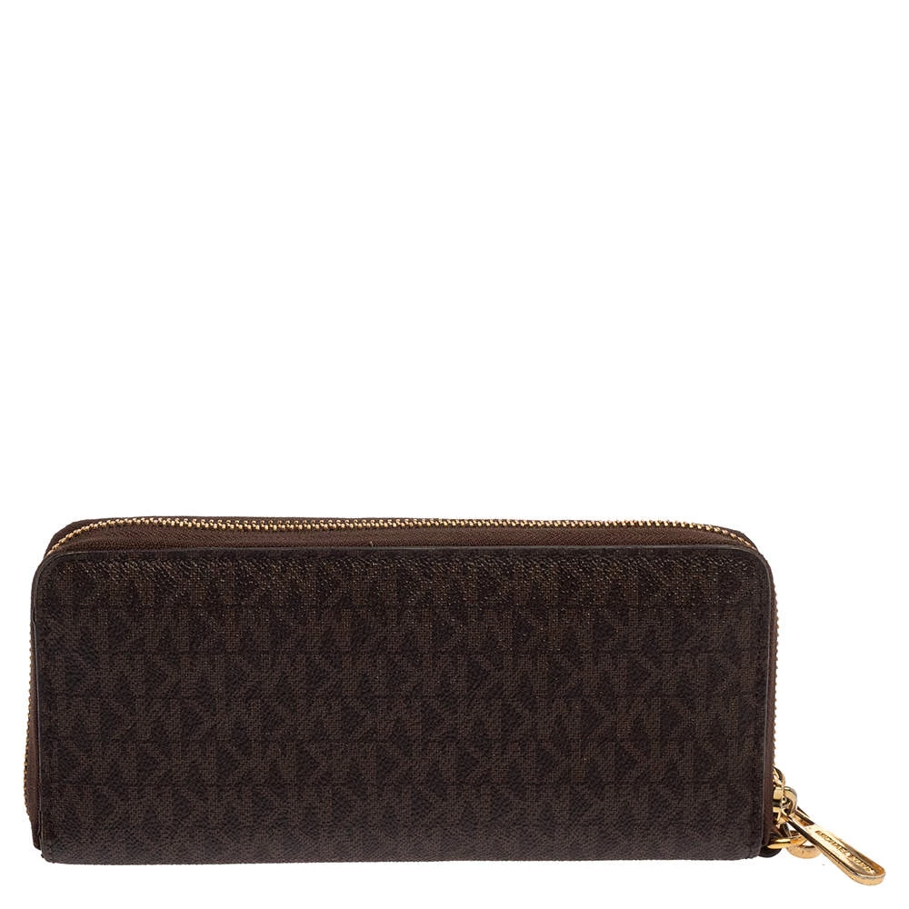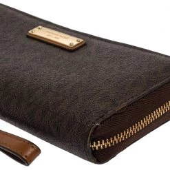 A compact and practical option to store your handy essentials, this Michael Kors wallet is crafted from monogram canvas. It has a zip-around closure, the brand logo on the front, and is equipped with multiple card slots and a zip pocket in the leather & nylon interior.