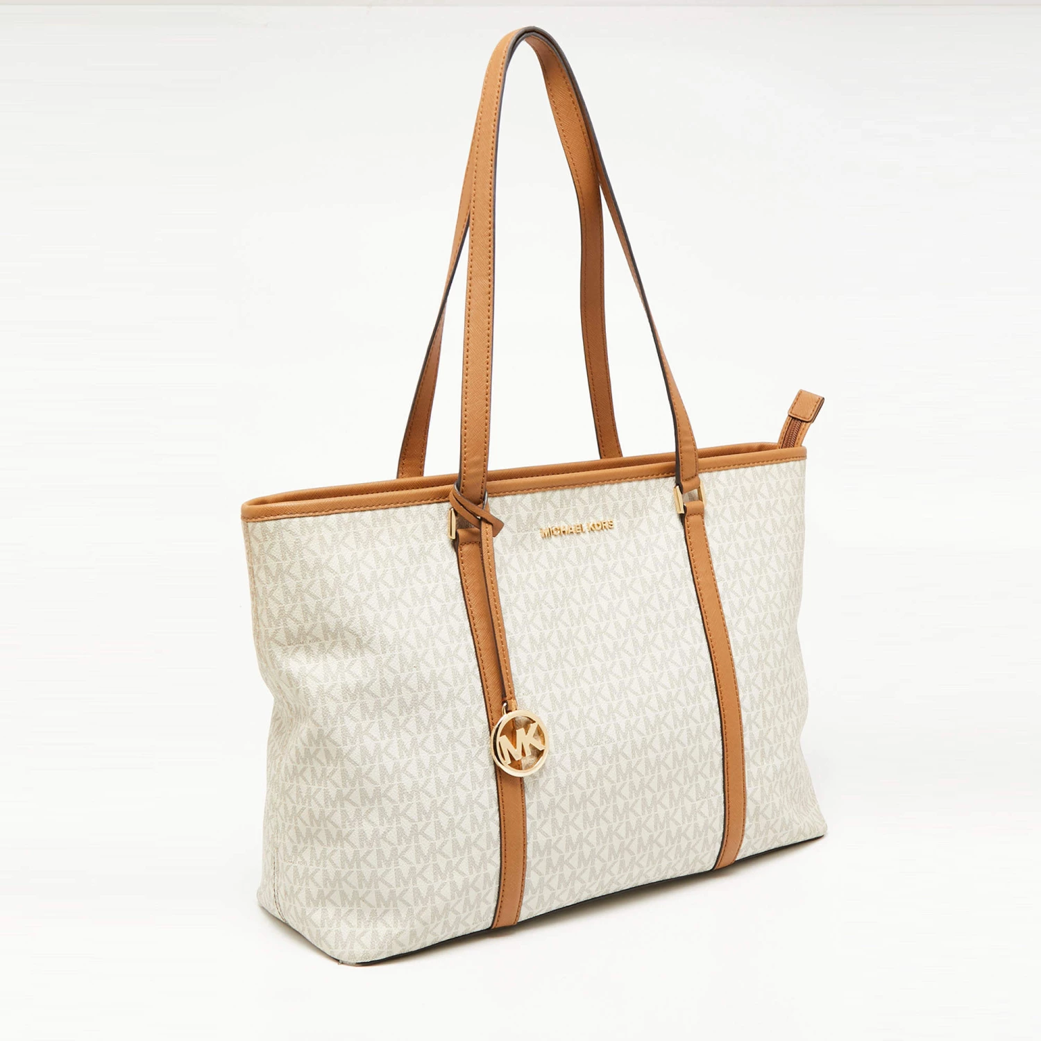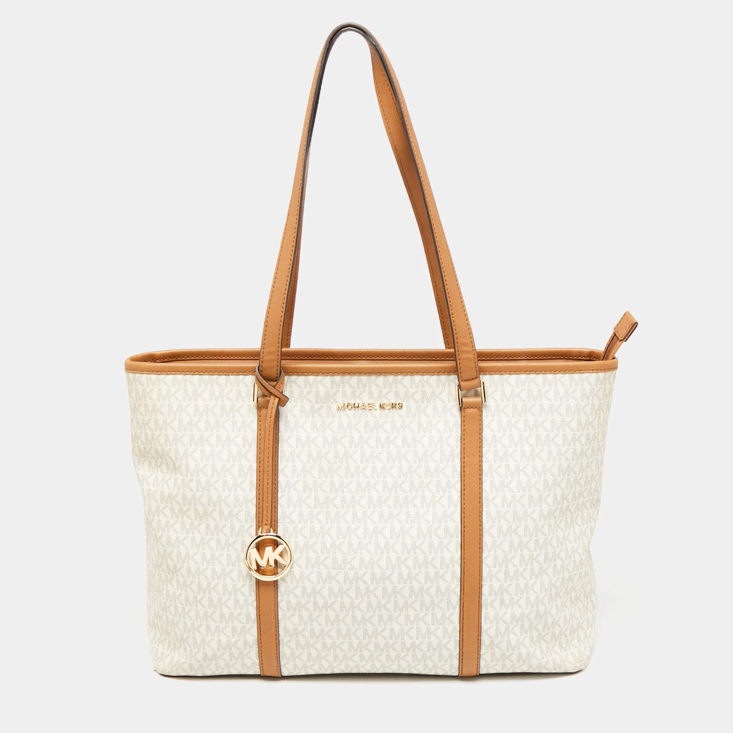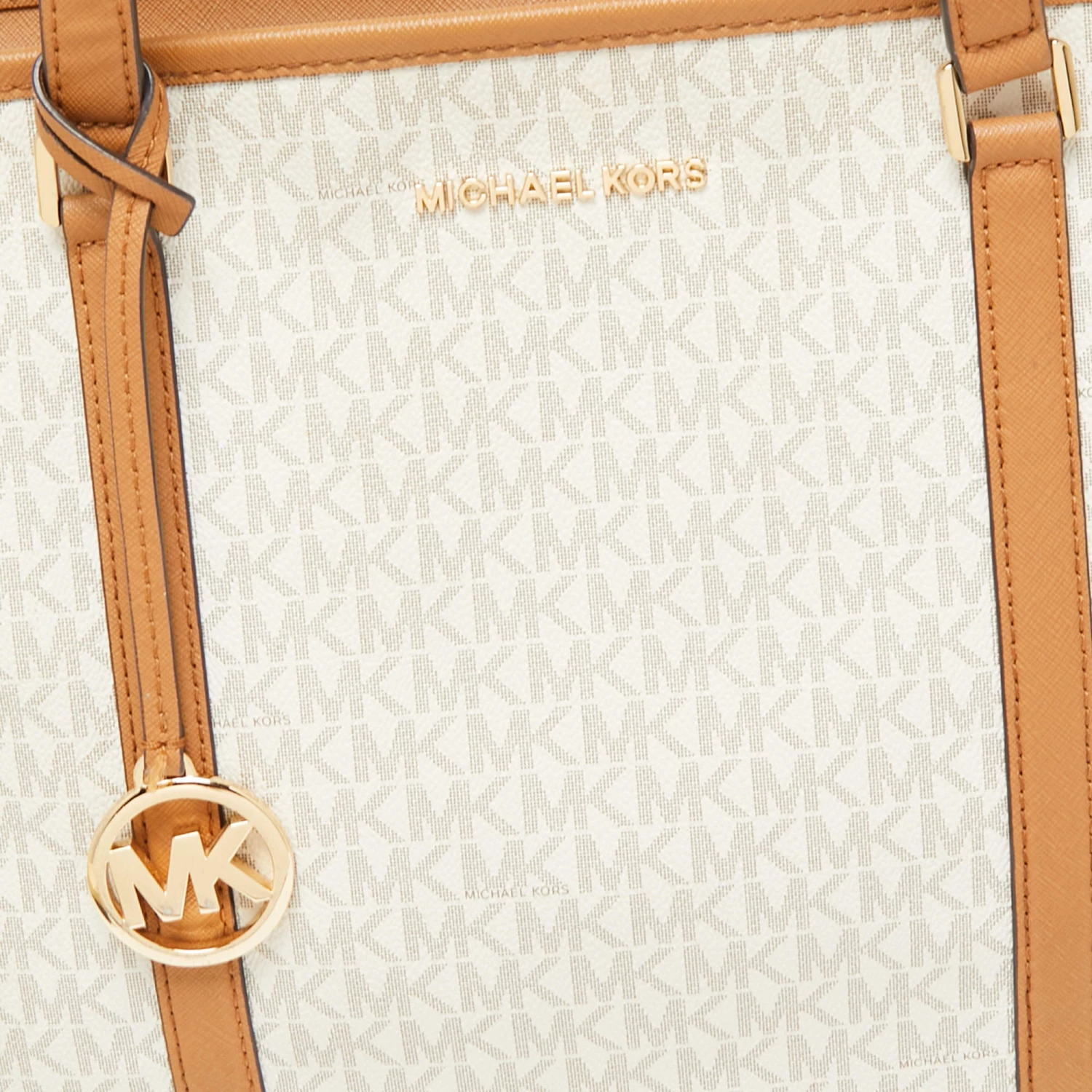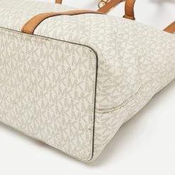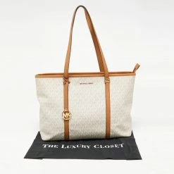 The fabric-lined interior of this Michael Kors Sady tote has an ample amount of space to accommodate your daily essentials. Created from the signature monogram canvas and leather, it is complete with a brand signature on the front, dual handles at the top, and gold-tone hardware.
