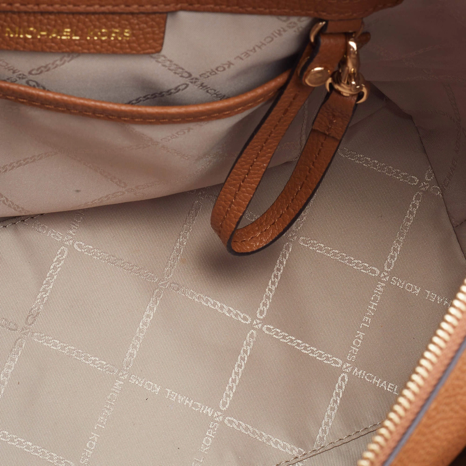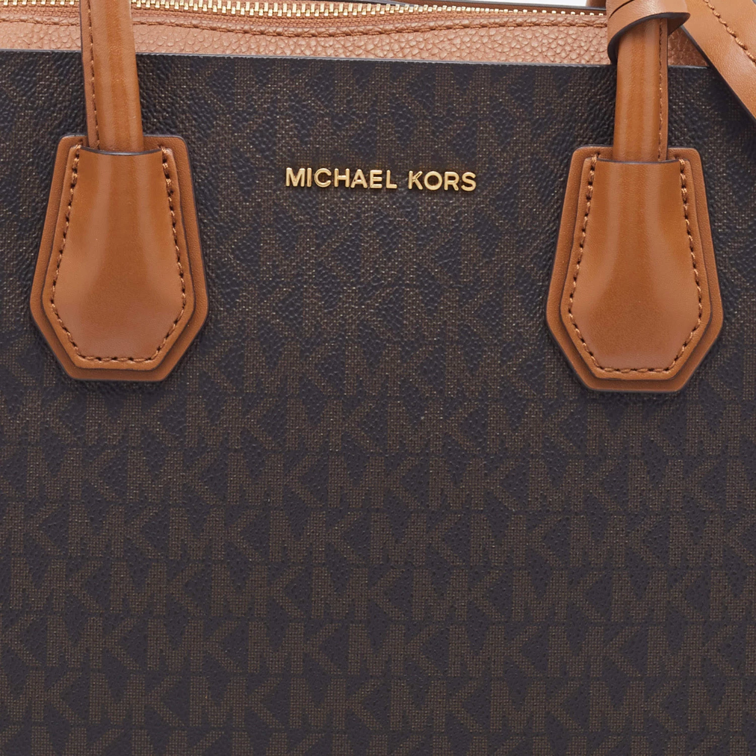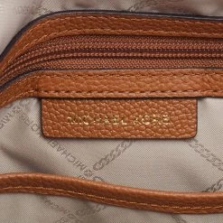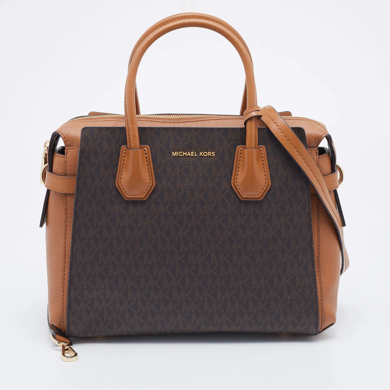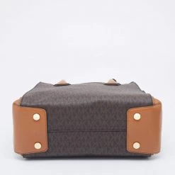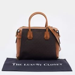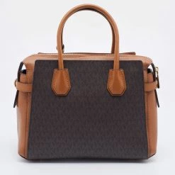 Featuring a chic structured style, this Michael Kors satchel is modern. Crafted from coated canvas and leather in stunning brown, it features dual handles, a removable shoulder strap, and a matching wallet. The bag opens to a spacious fabric interior and comes with protective metal feet. You are sure to love swinging this beauty!