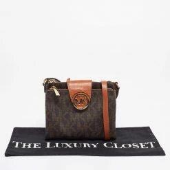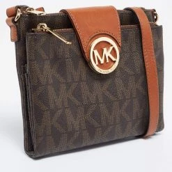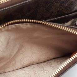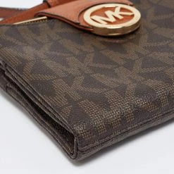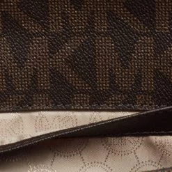 The compact silhouette and the shoulder strap provide this Michael Kors bag with practical ease. Created from the signature coated canvas and leather, it gets a recognizable accent with the brand signature on the front. The compartmentalized interior of this bag will keep your belongings organized.