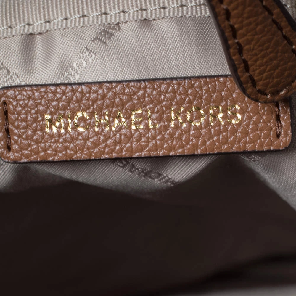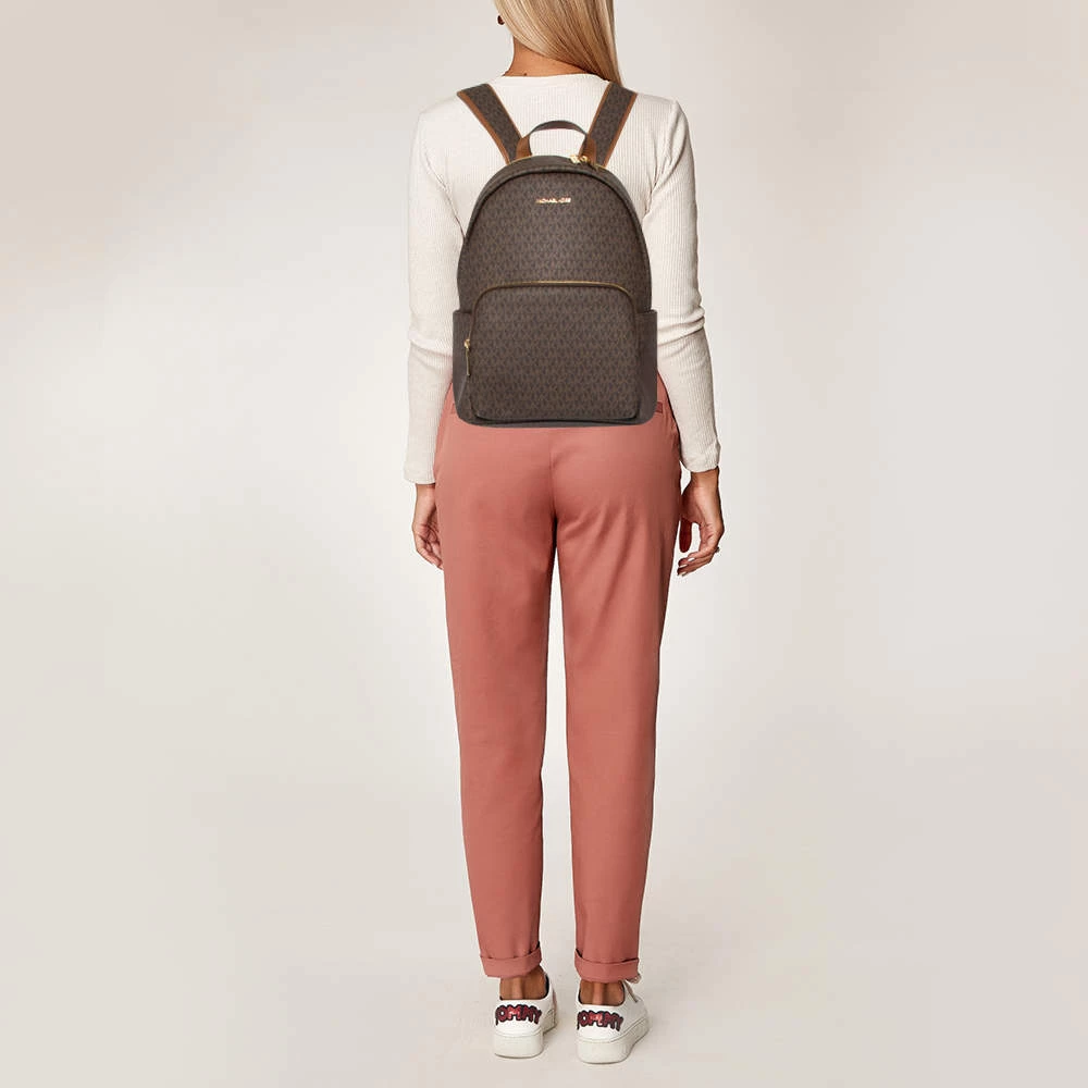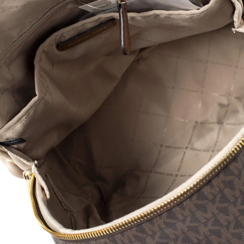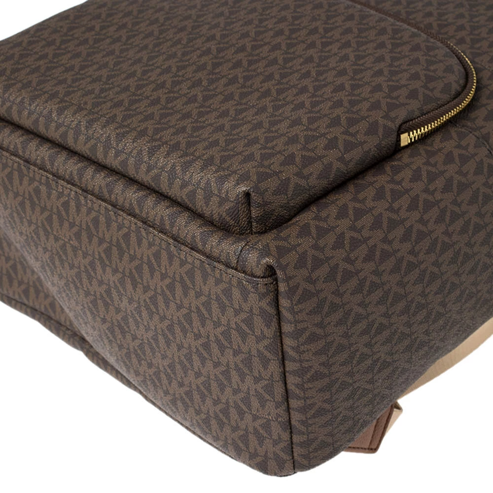 Designed with love, this Michael Kors backpack is crafted from brown signature coated canvas. It comes with a fabric-lined interior that houses enough space for essentials and a zip pocket at the front. The backpack features a top handle and two shoulder straps.