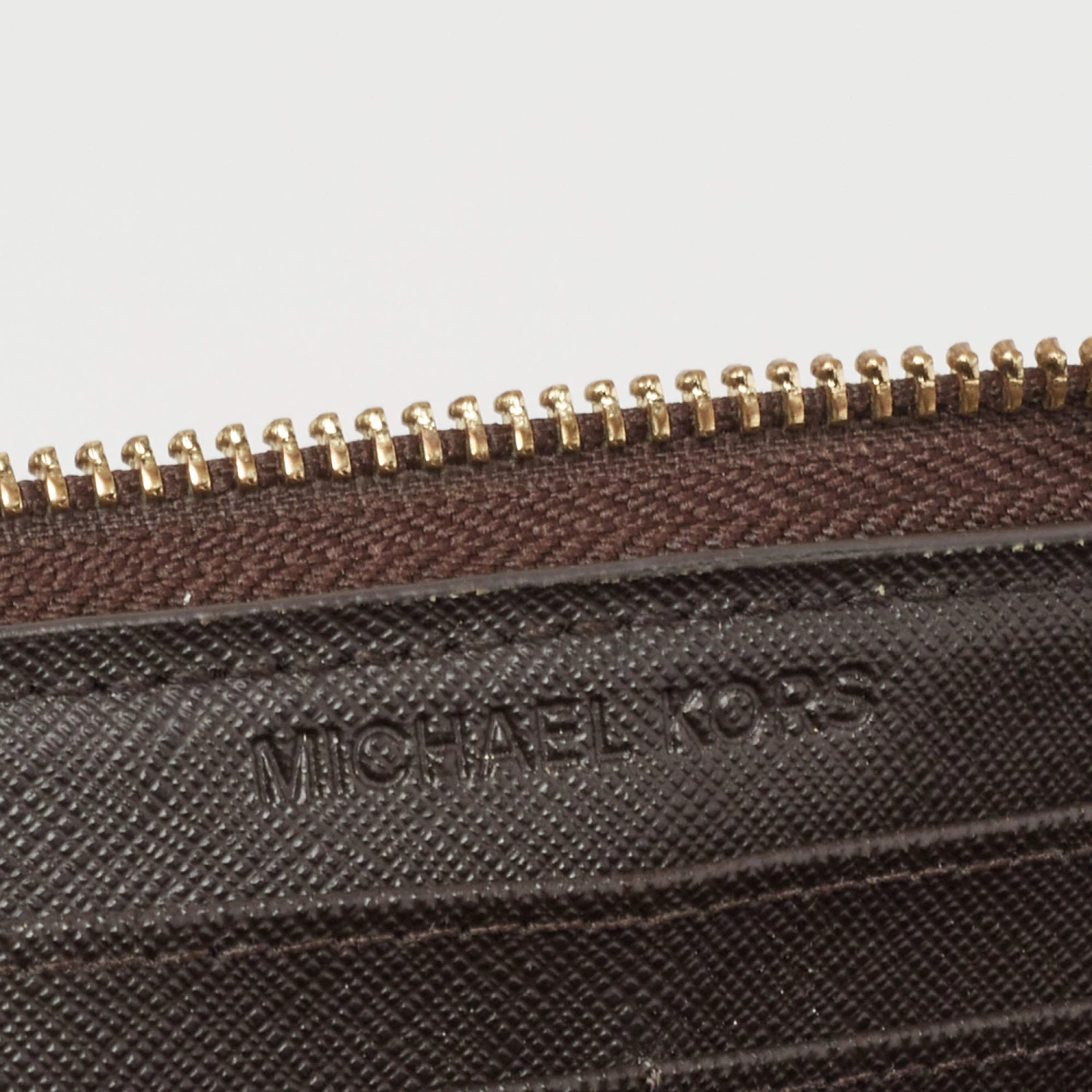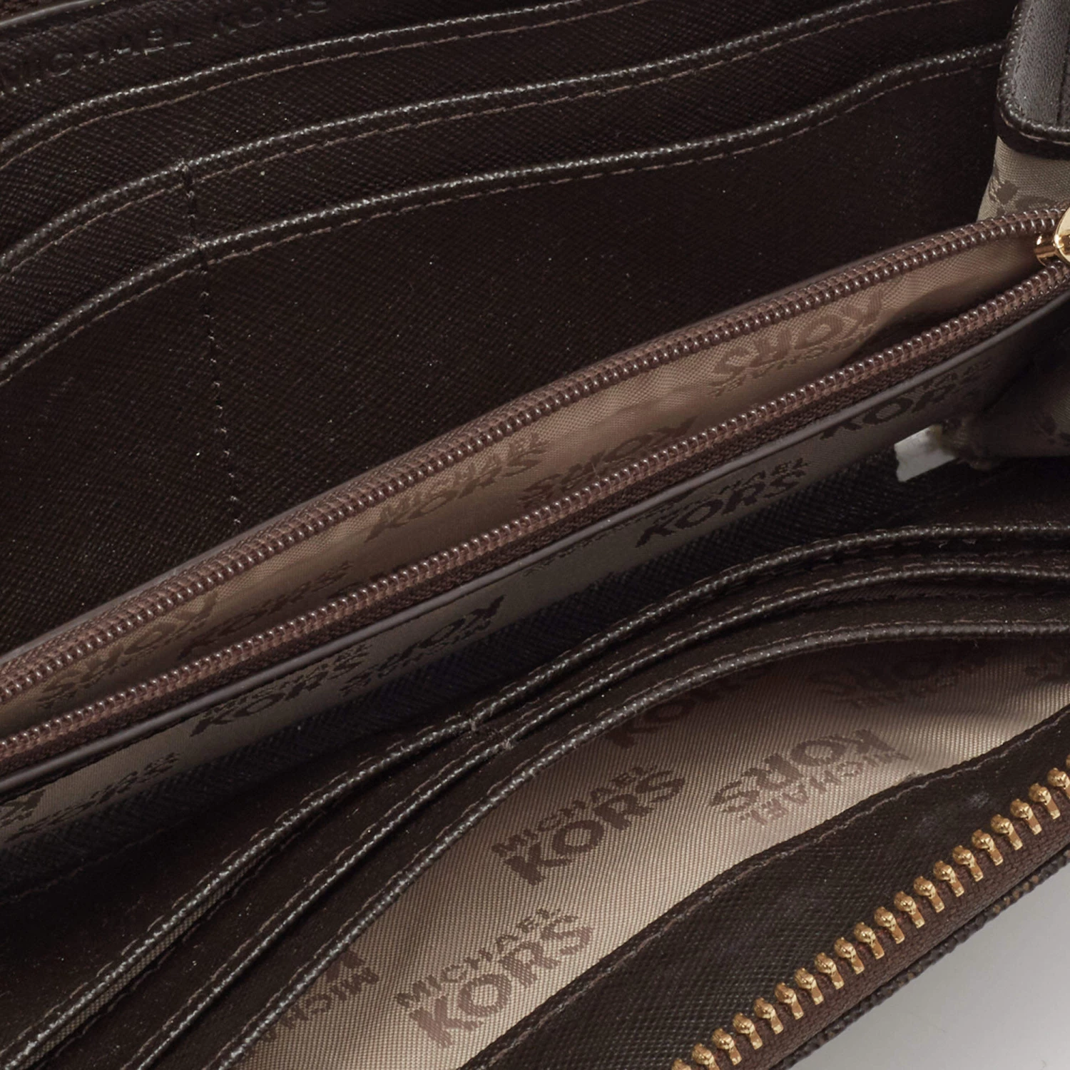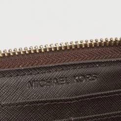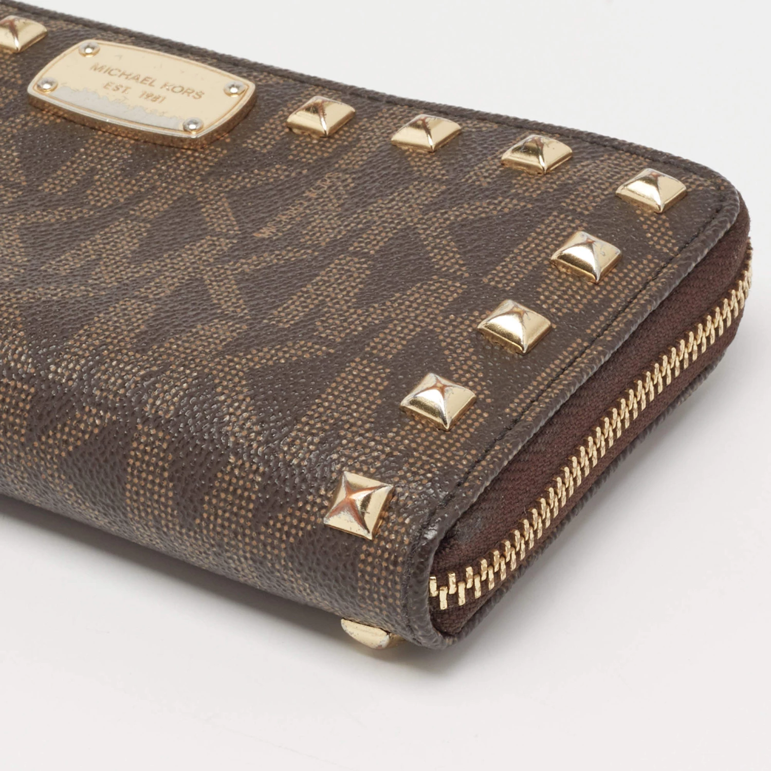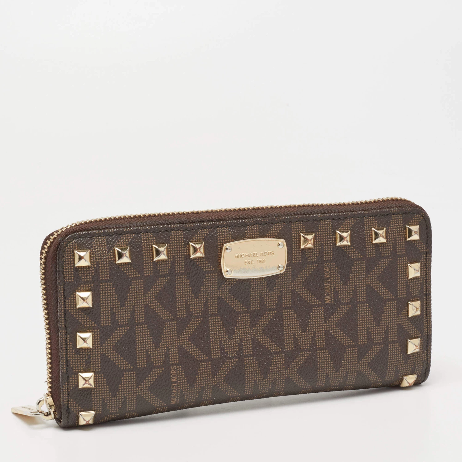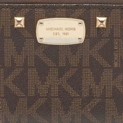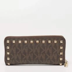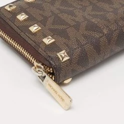 The studs beautifully outline the brown exterior of this Michael Kors wallet. Crafted from the signature coated canvas, it exhibits a branded motif on the front, gold-tone hardware, and a functional design. The zip-around closure secures its leather and fabric interior.