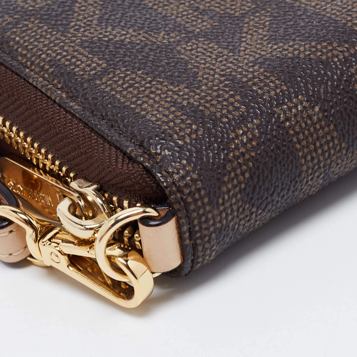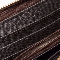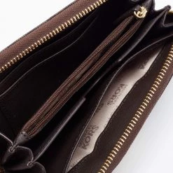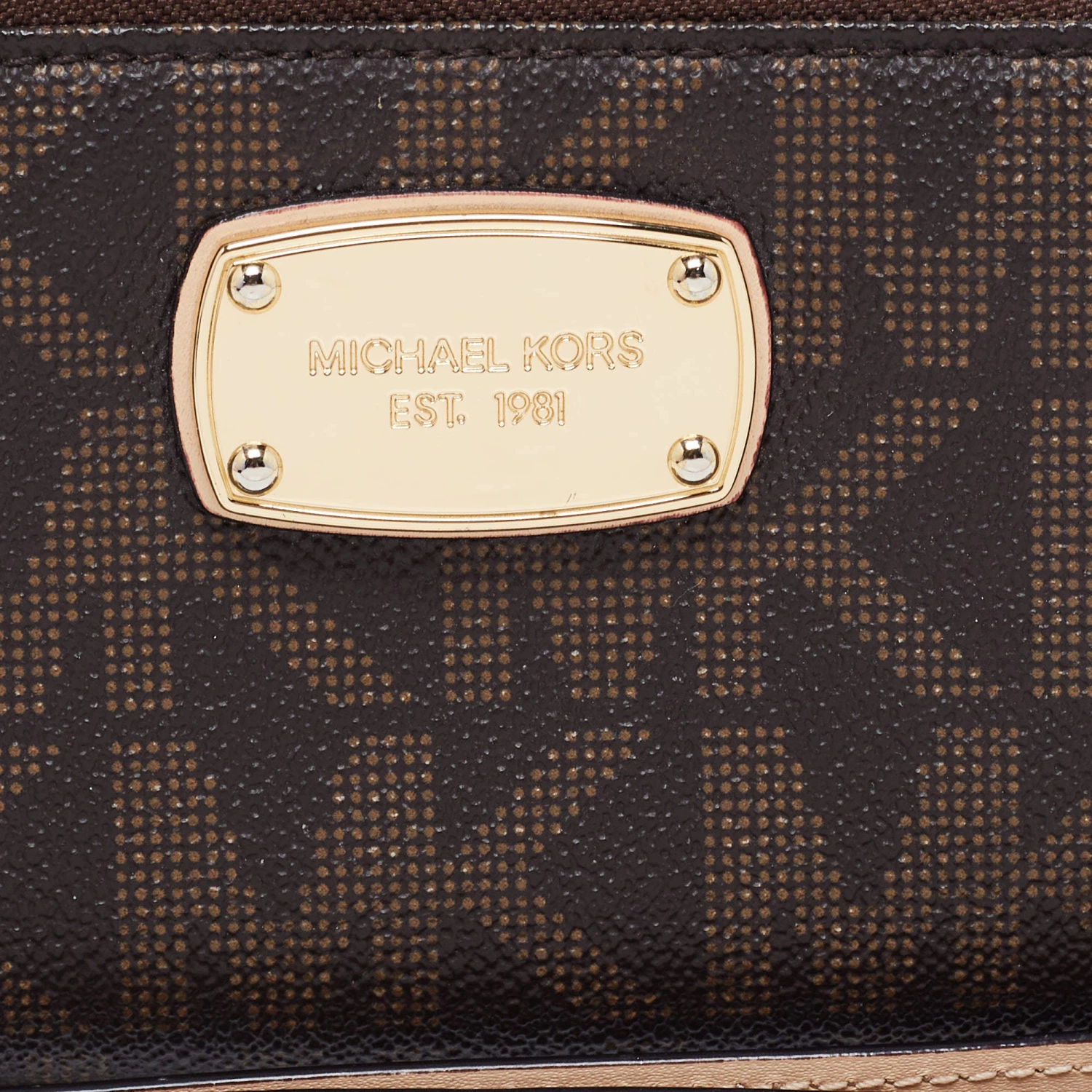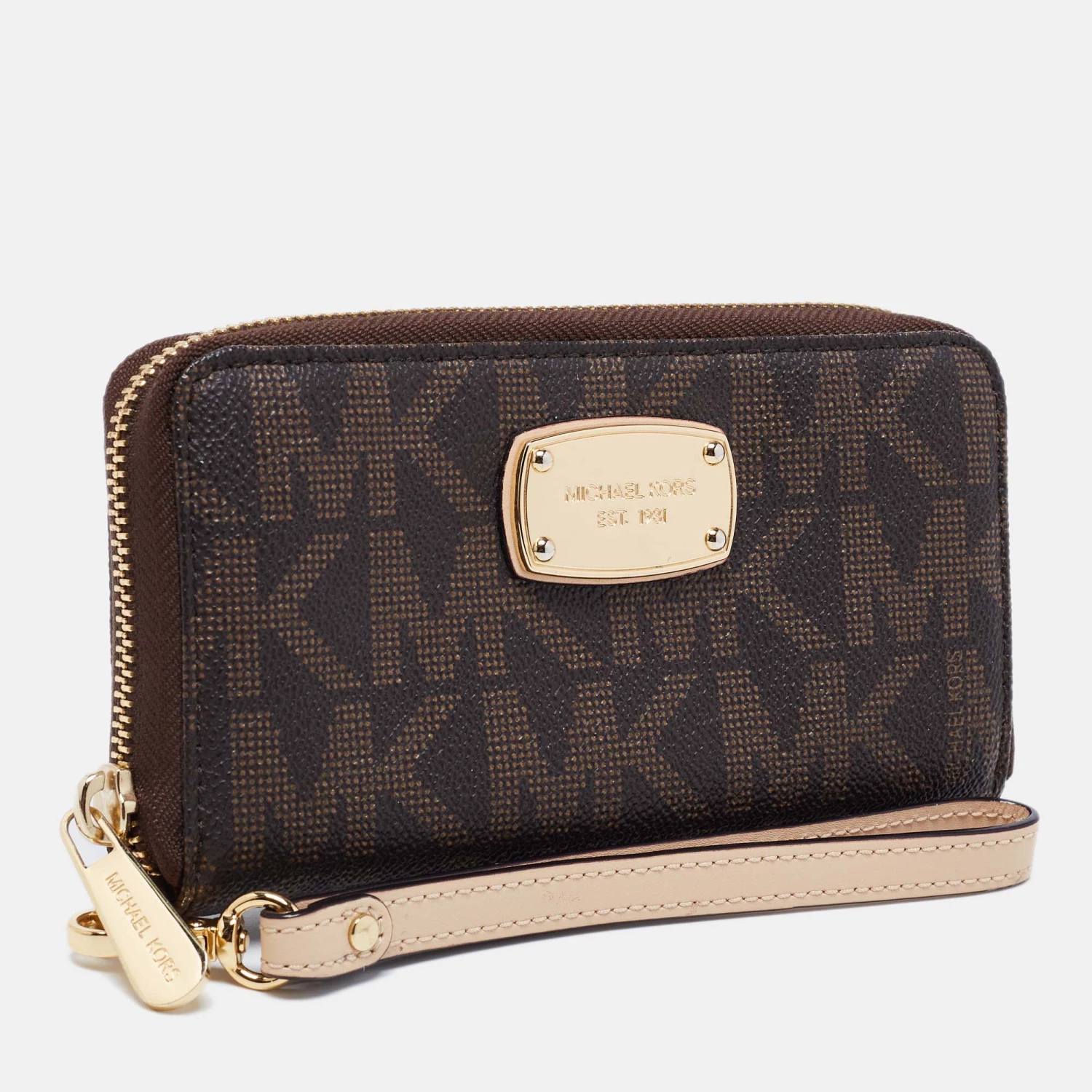 Keep your monetary essentials in an organized way with this wallet from the House of Michael Kors. It is made from brown Signature coated canvas and leather, with gold-tone hardware elevating its beauty. It opens to a spacious interior.