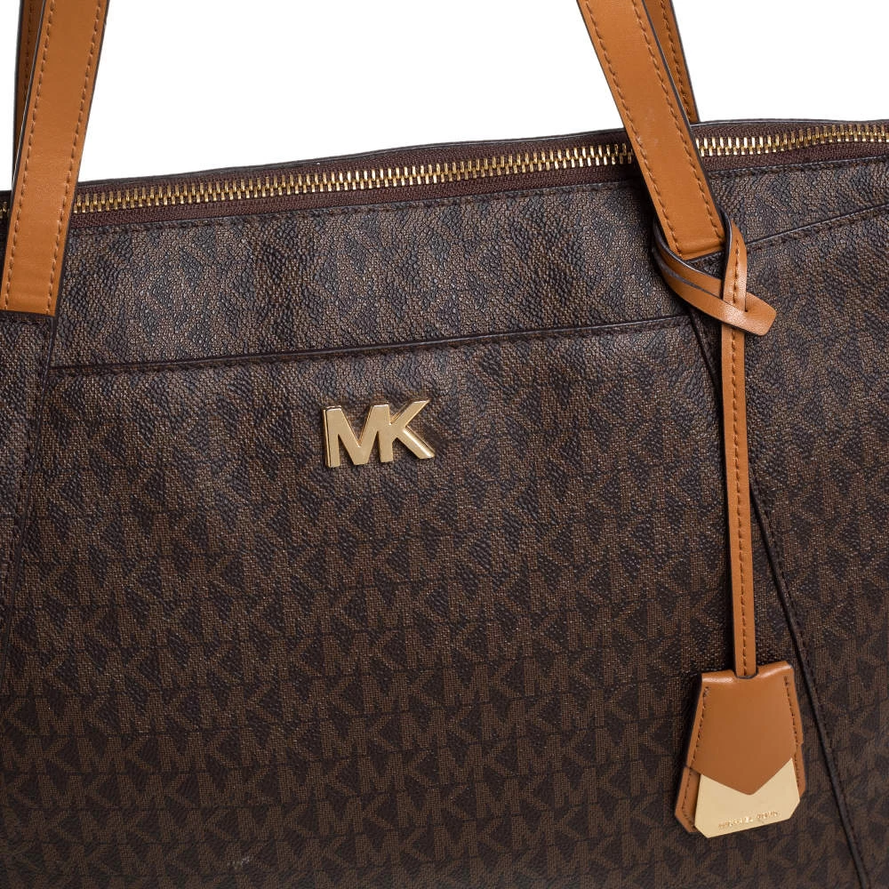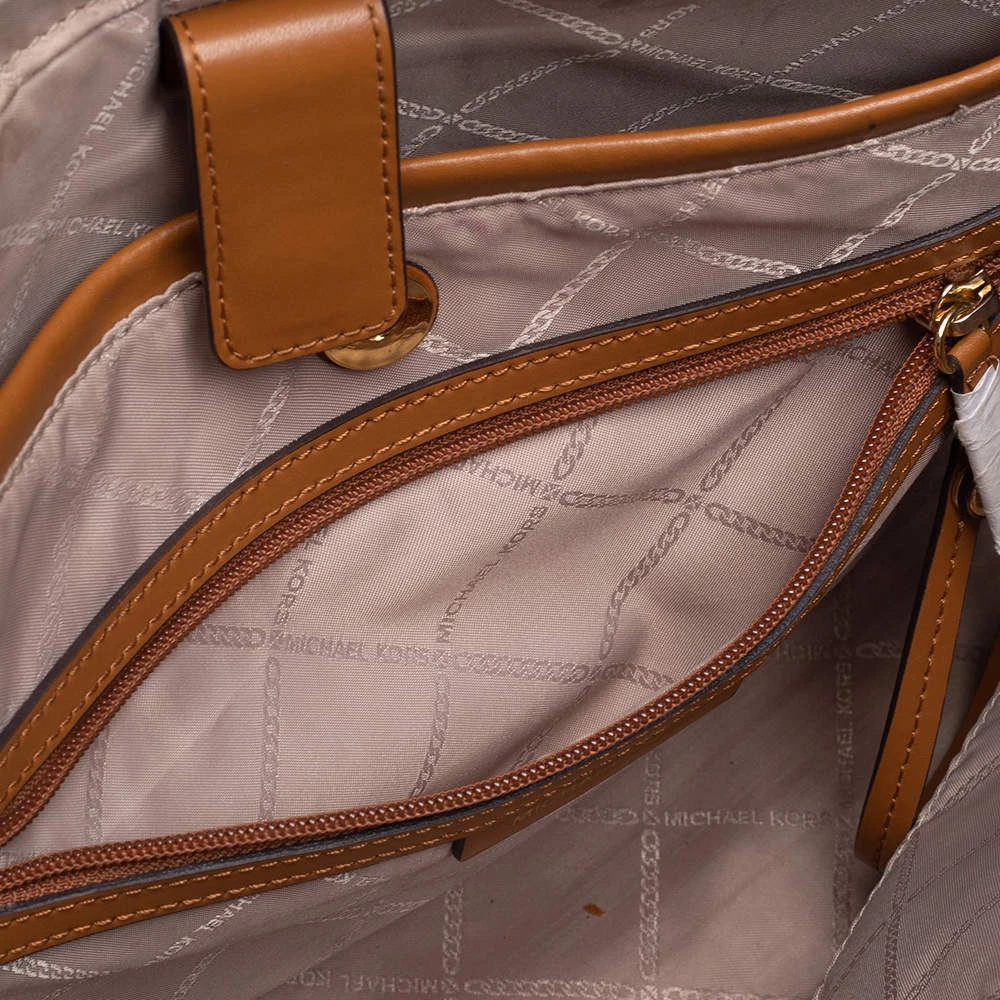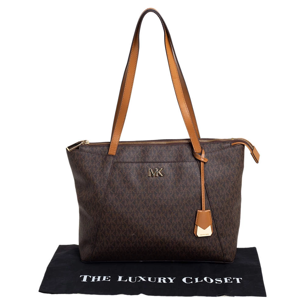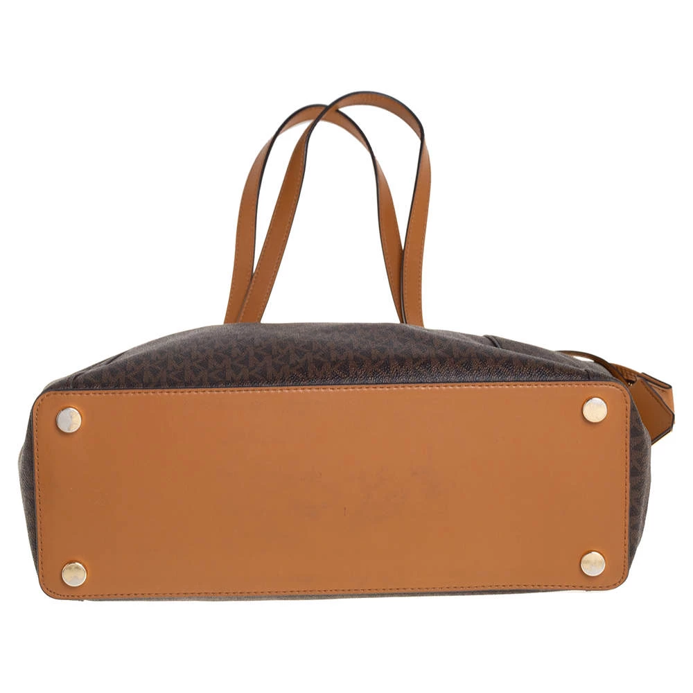 This Michael Kors Maddie tote will surely catch a lot of attention. It has been crafted from signature coated canvas and leather and secured with top snap button fastening. Set on protective base studs, this bag comes fitted with two top handles and a fabric-lined interior furnished with a zipper pocket that can neatly organize all your essentials with great ease.