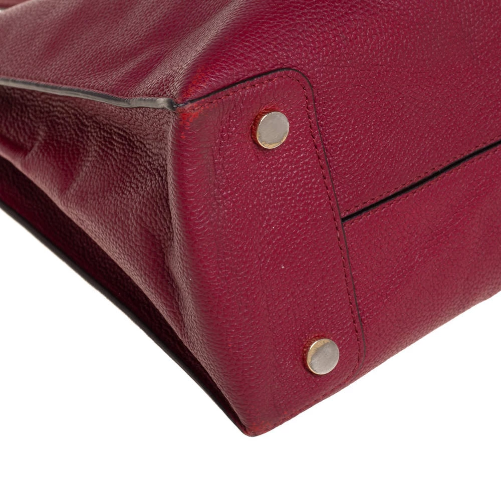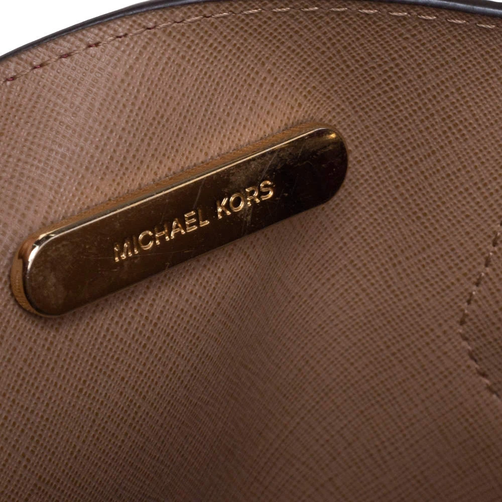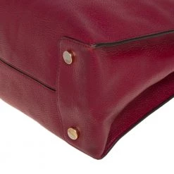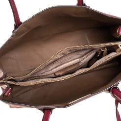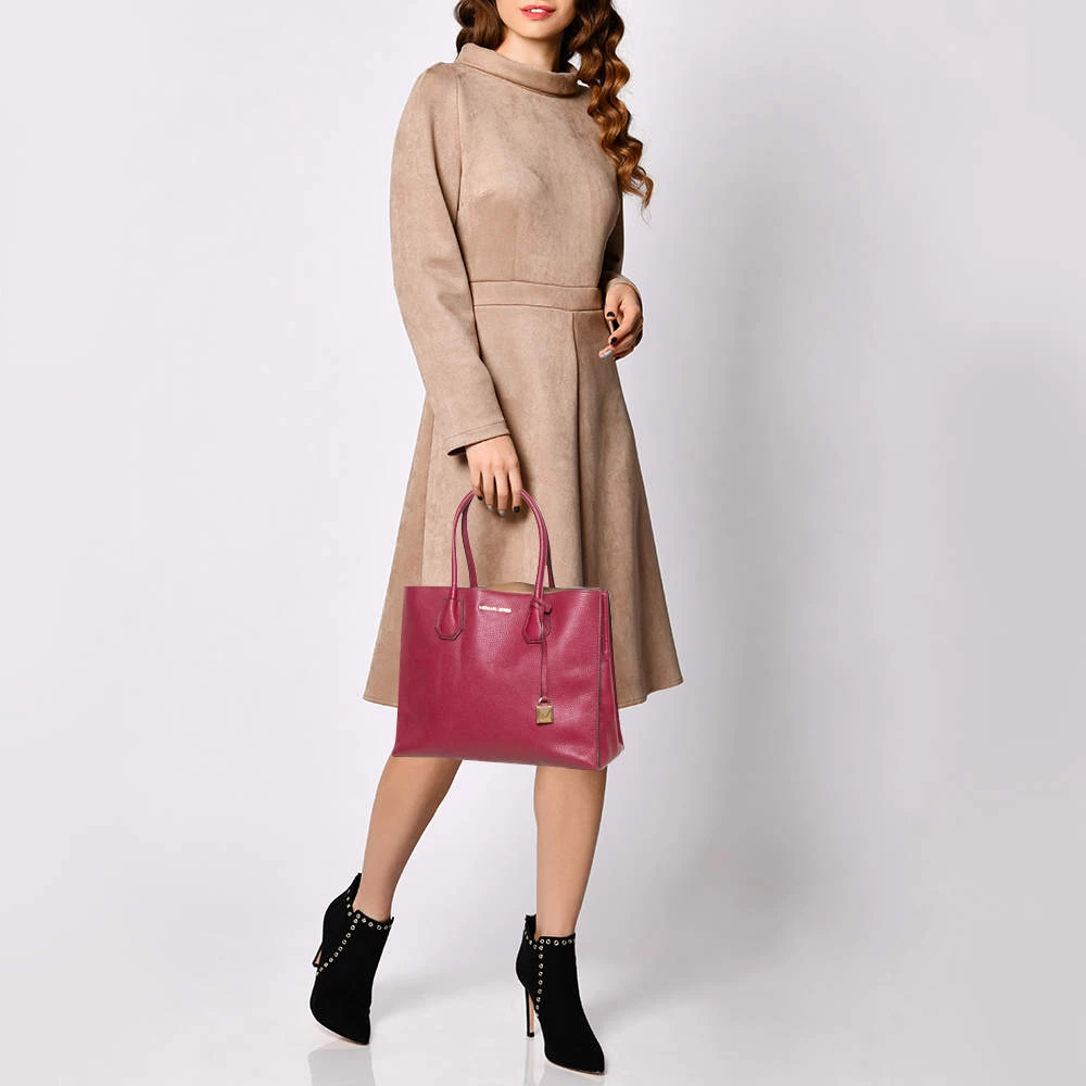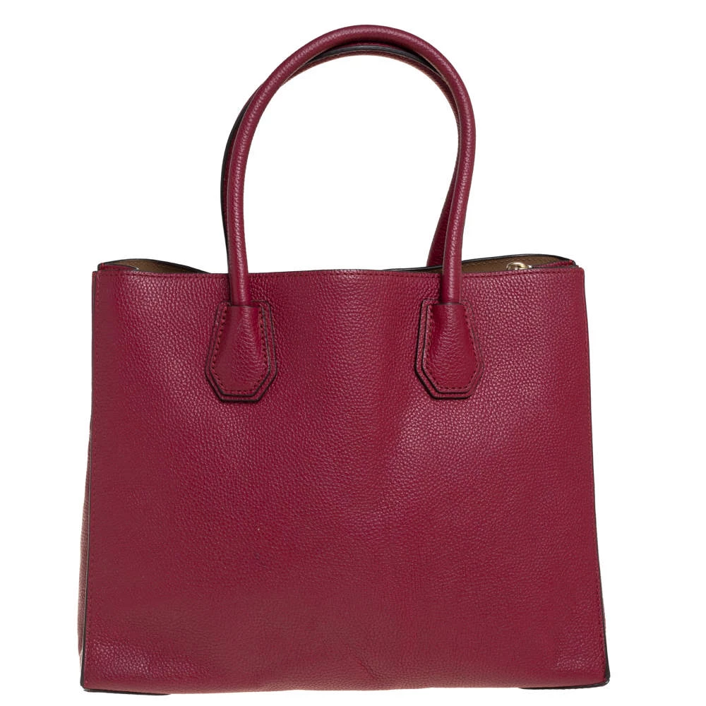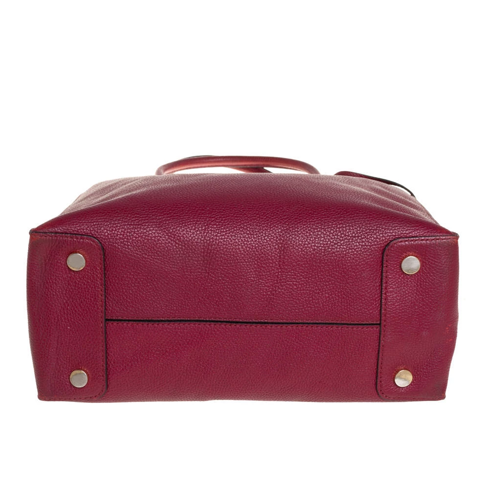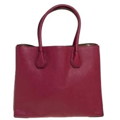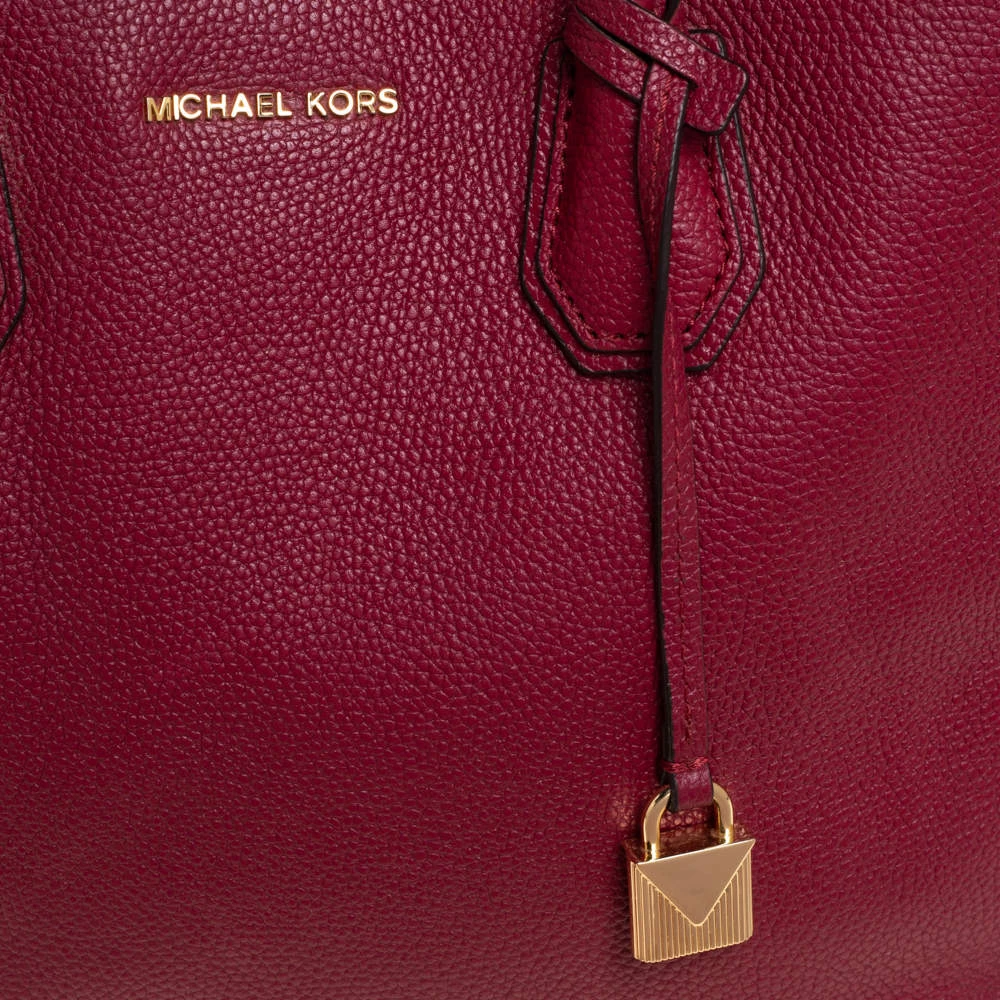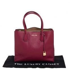 Featuring a chic and fabulous style, this Michael Kors tote is modern. Crafted from grained leather in a lovely burgundy shade, the tote features dual handles, brand logo detailing on the front, and a dangling padlock accent. It opens to a spacious leather and fabric interior that can easily embrace your daily essentials. The tote comes with protective metal feet and you are sure to love swinging this beauty!