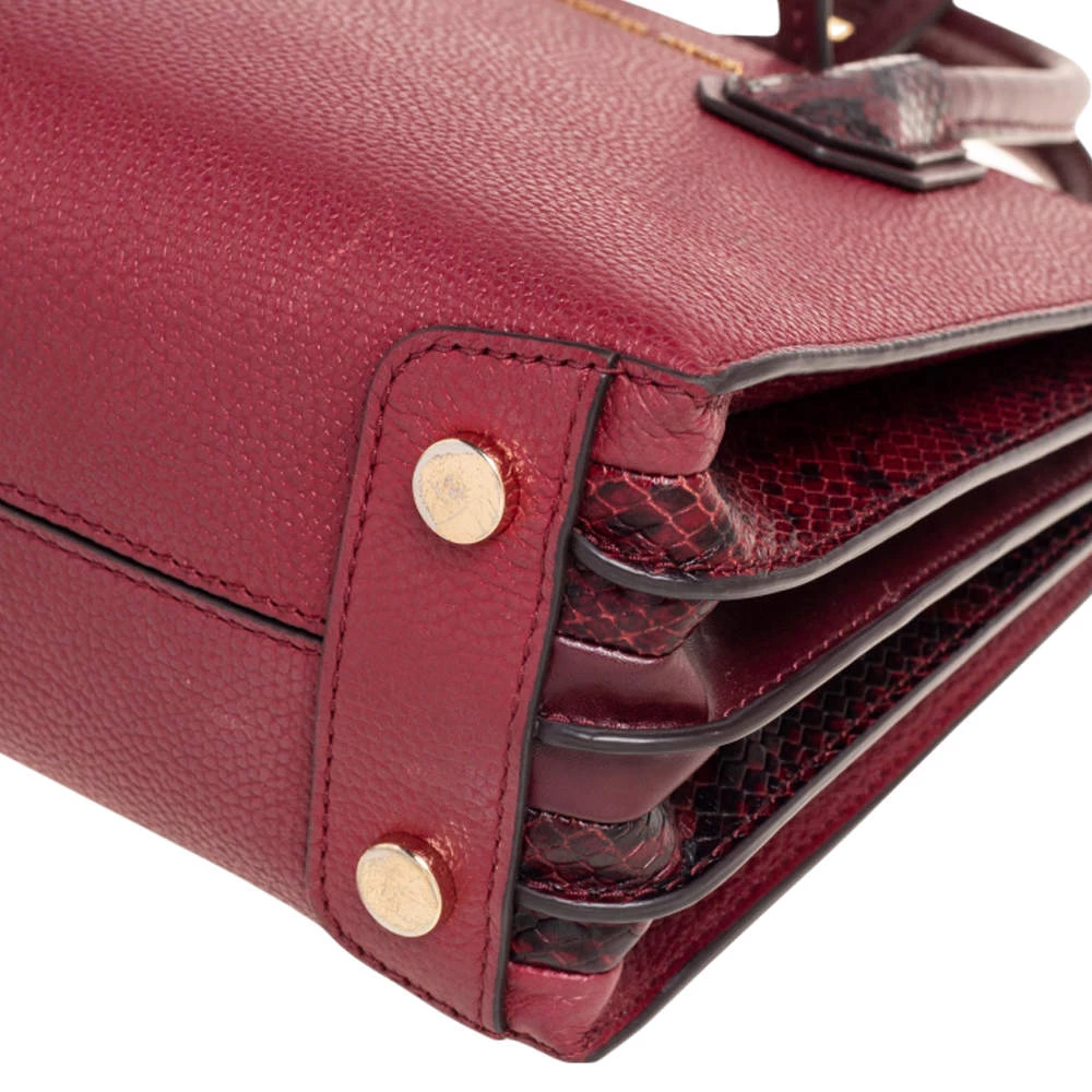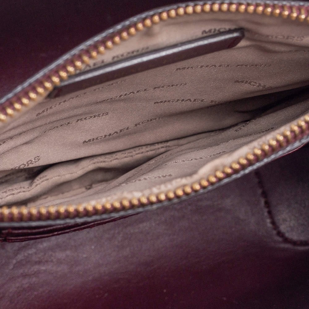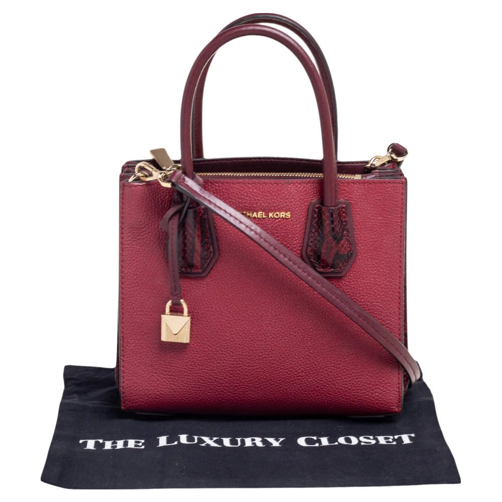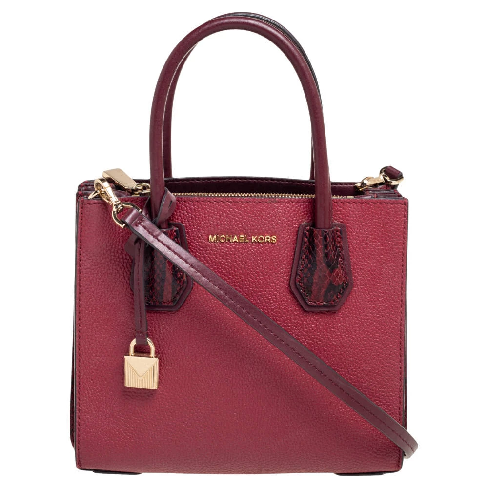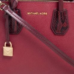 Featuring a chic and fabulous style, this Michael Kors tote is modern. Crafted from snakeskin-embossed leather in stunning burgundy, the tote features dual handles, a removable shoulder strap, and a padlock. It opens to a spacious leather interior divided by a zipped compartment. The tote comes with protective metal feet and you are sure to love swinging this beauty.