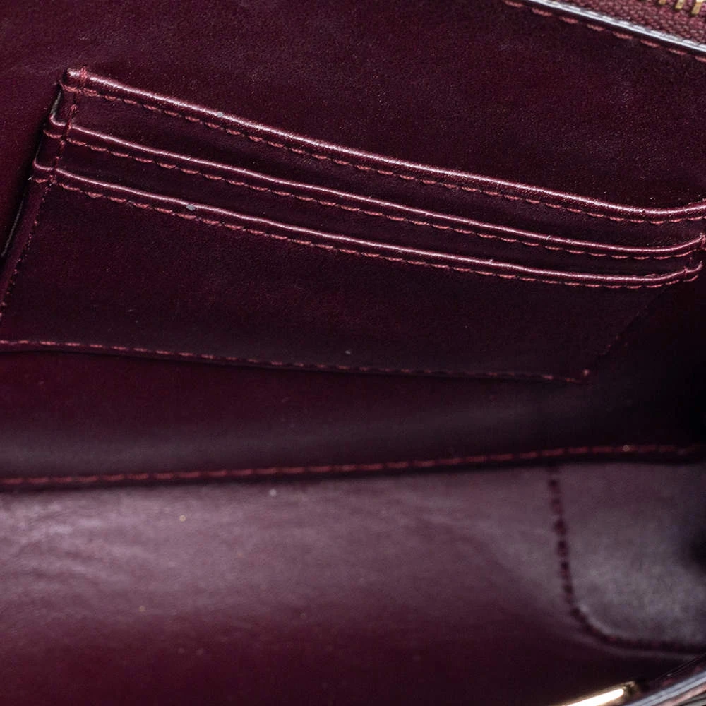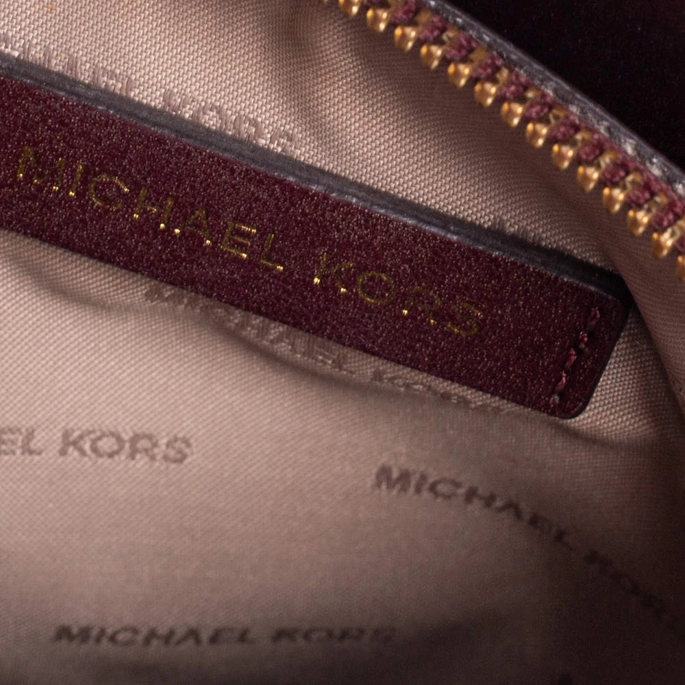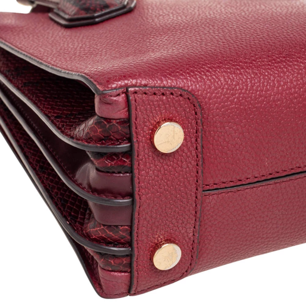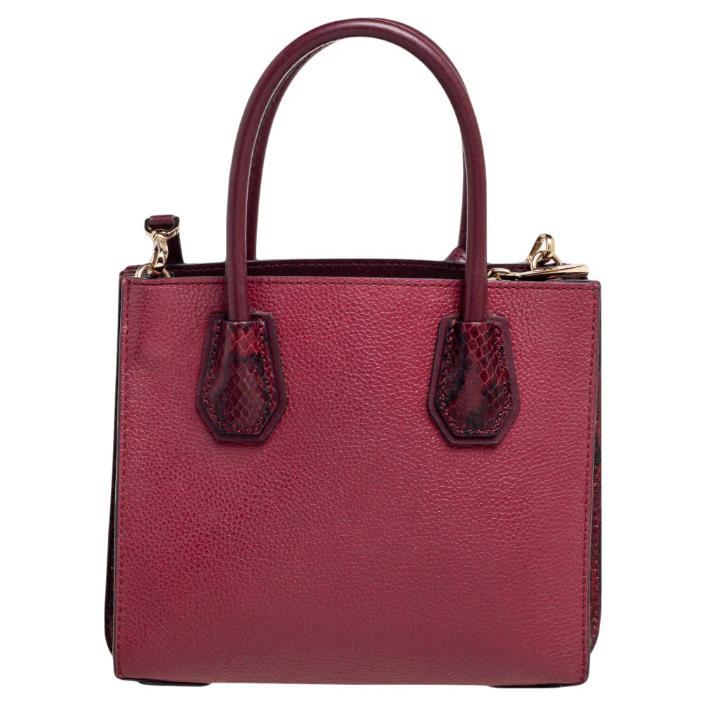 Featuring a chic and fabulous style, this Michael Kors tote is modern. Crafted from snakeskin-embossed leather in stunning burgundy, the tote features dual handles, a removable shoulder strap, and a padlock. It opens to a spacious leather interior divided by a zipped compartment. The tote comes with protective metal feet and you are sure to love swinging this beauty.