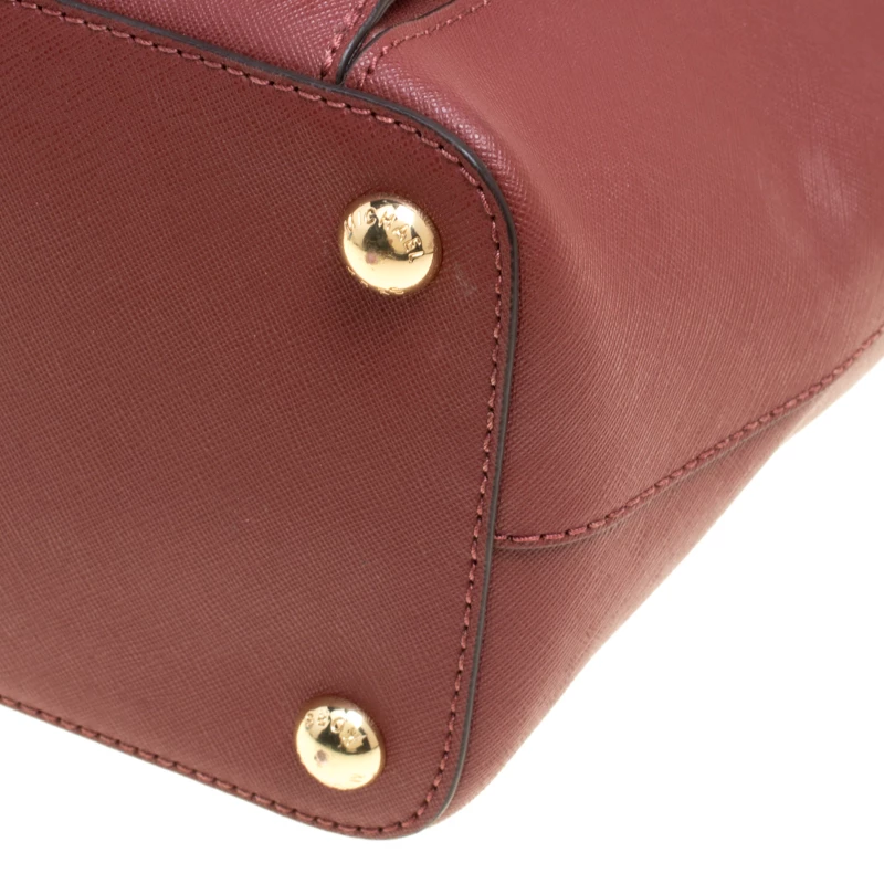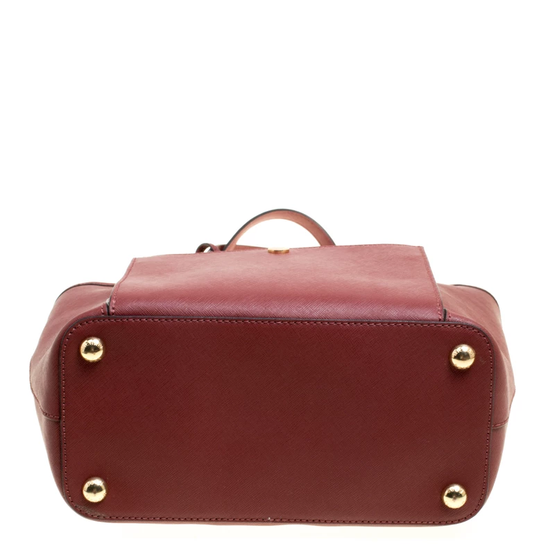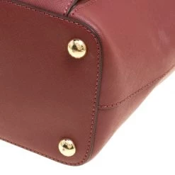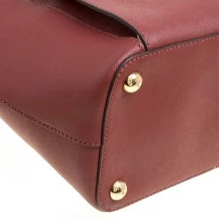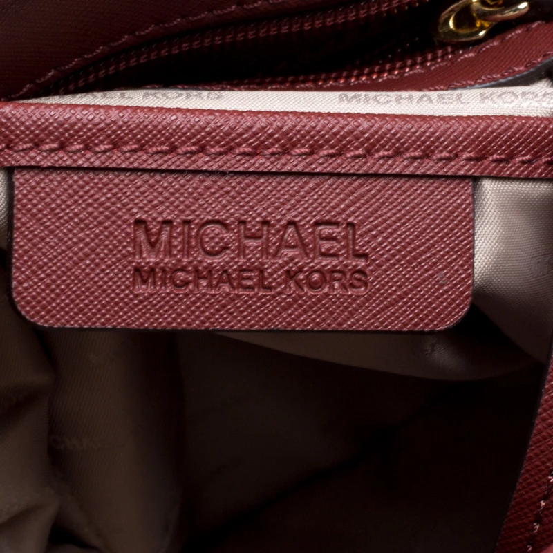 This tote from Michael Kors is a creation meant to assist you with style and ease. It comes crafted from burgundy leather and accompanied by an MK tag and a front pocket. Two handles are provided for you to carry it, and a spacious fabric interior is to house your belongings.