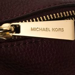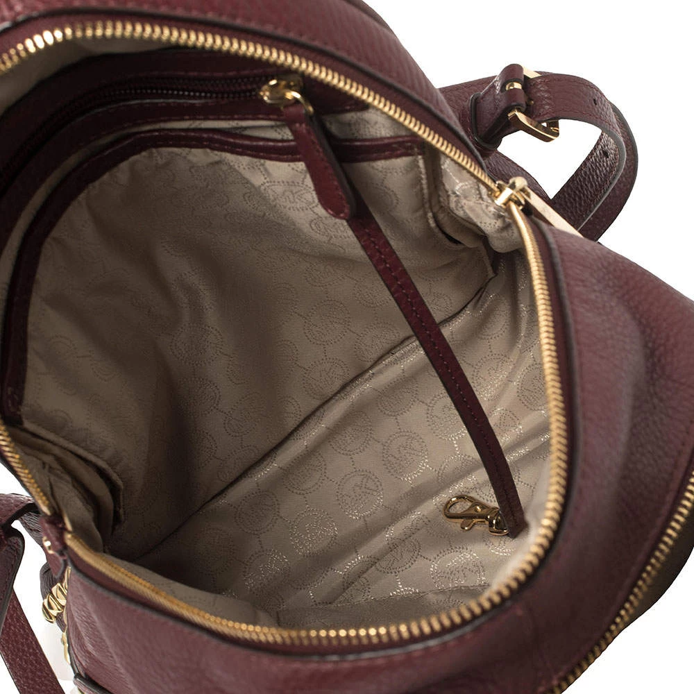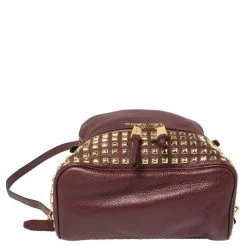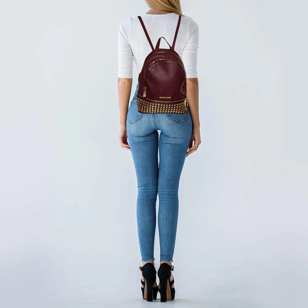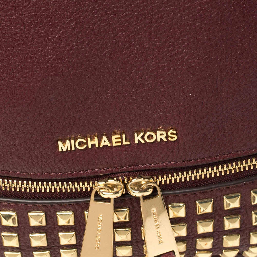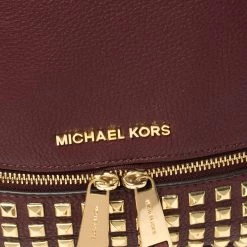 Get set for an uber stylish look with this burgundy Rhea backpack from Michael Kors. It has been crafted from leather and detailed with zippers and studs. The designer backpack for women is equipped with a top handle, adjustable shoulder straps, and fabric compartments.