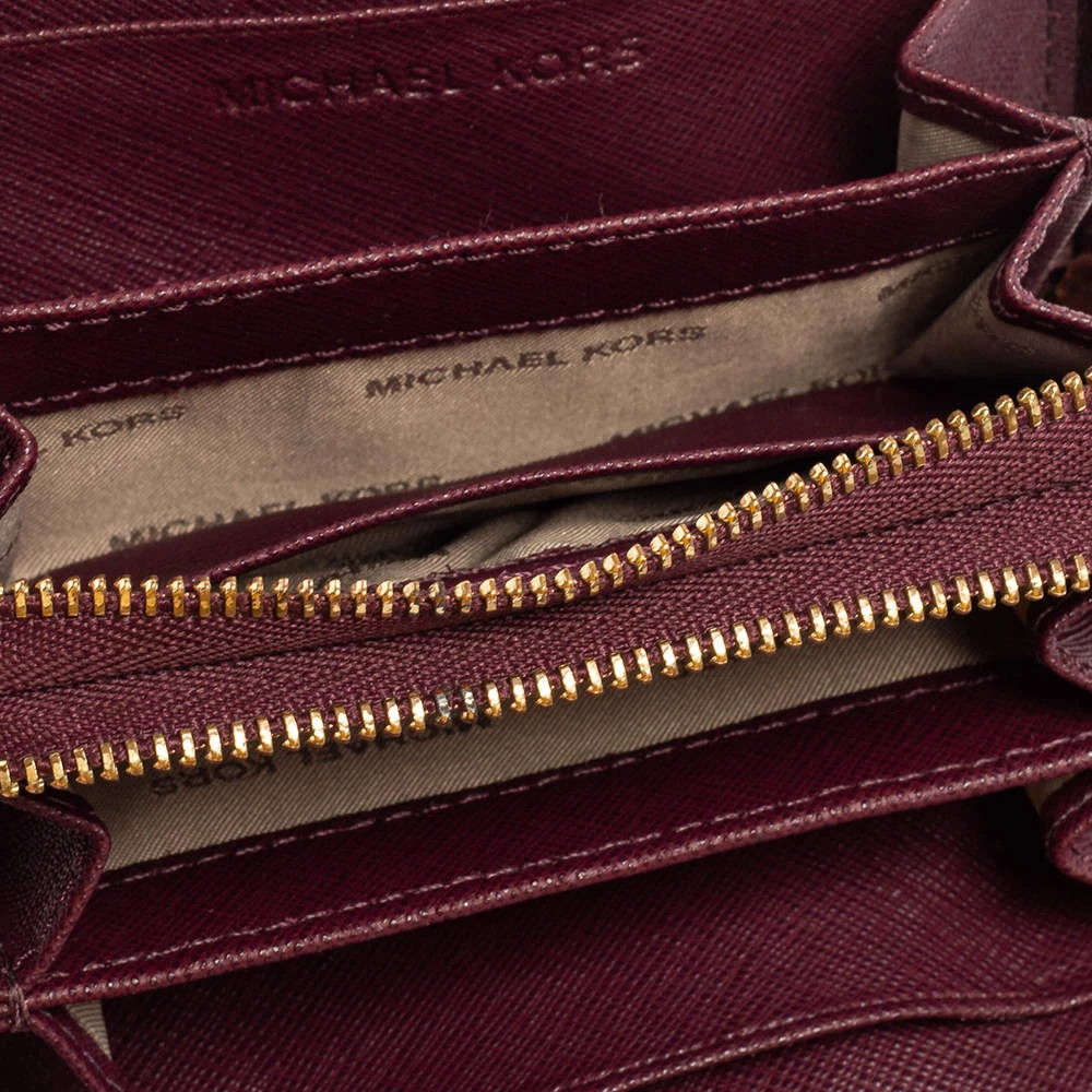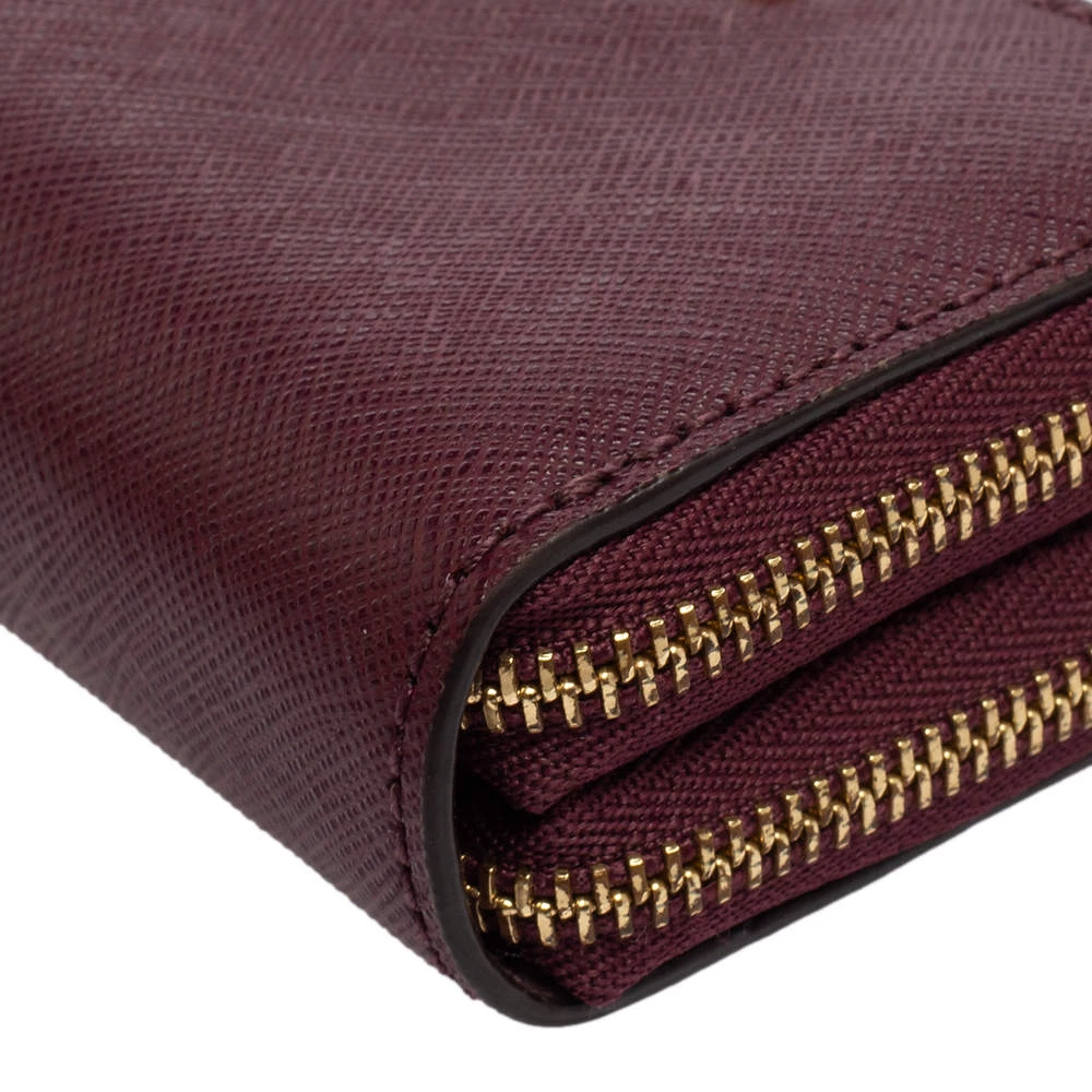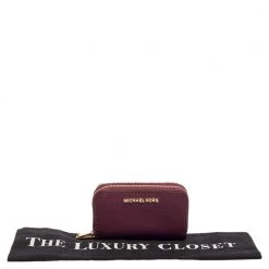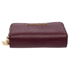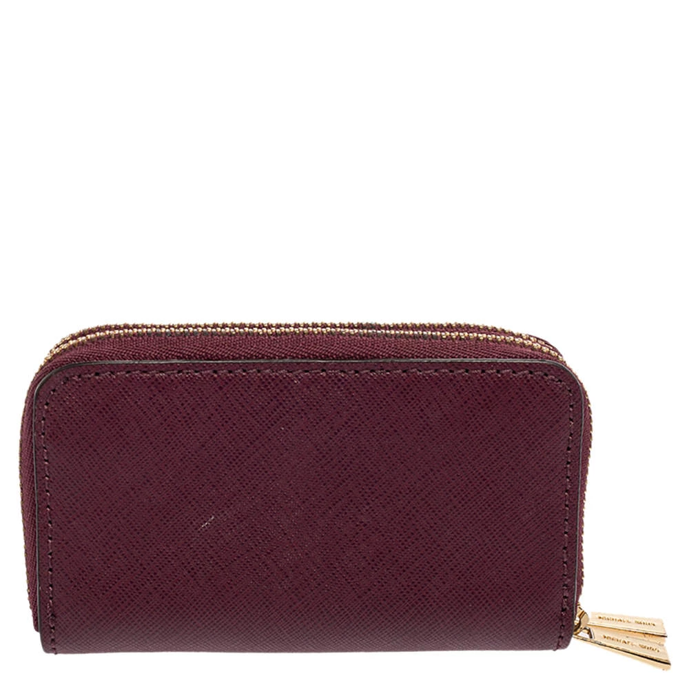 A compact and practical option to store your essentials, this Michael Kors wallet is crafted from burgundy leather. It has a double zip-around closure and is equipped with multiple card slots to keep things organized. It showcases the brand logo in gold-tone on the front.