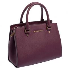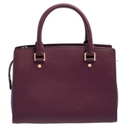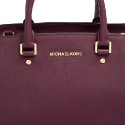 Designs by Michael Kors capture the effortless, nonchalant style that a modern wardrobe requires. Crafted from leather in a burgundy hue, this chic Savannah satchel features a fabric interior secured with a top zip fastening. The sleek, understated silhouette is joined by gold-tone hardware, a logo charm, and the brand detail on the front.