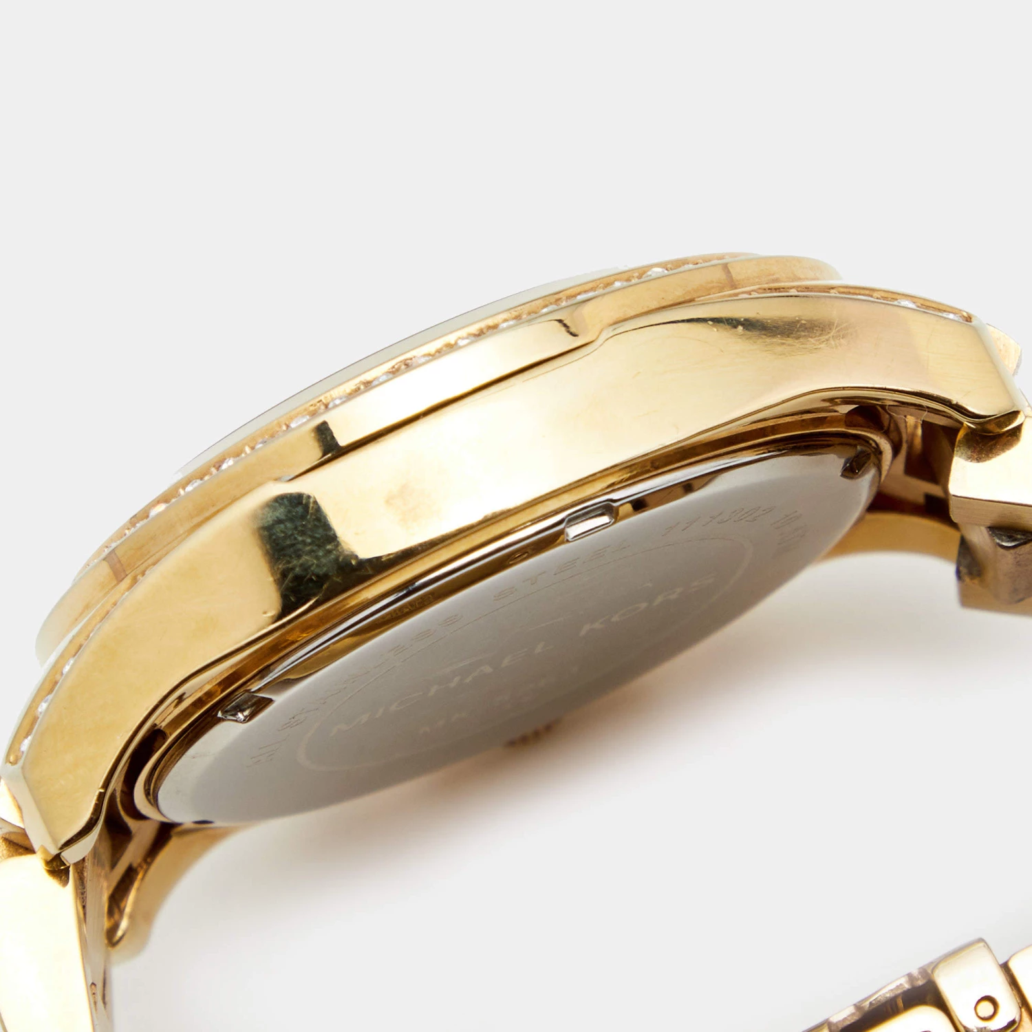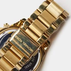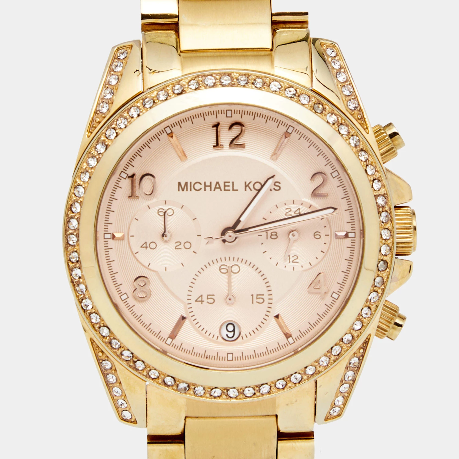 The Michael Kors Blair watch for women is an example of everyday luxury. Made from champagne gold-plated stainless steel, it has crystal embellishments on the bezel & lugs and a round dial with three sub-dials. 100 meters of water resistance and a push-button clasp make the quartz timepiece ready to be yours.