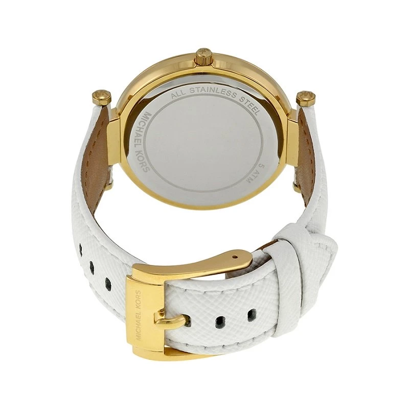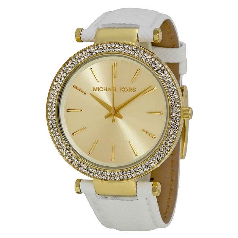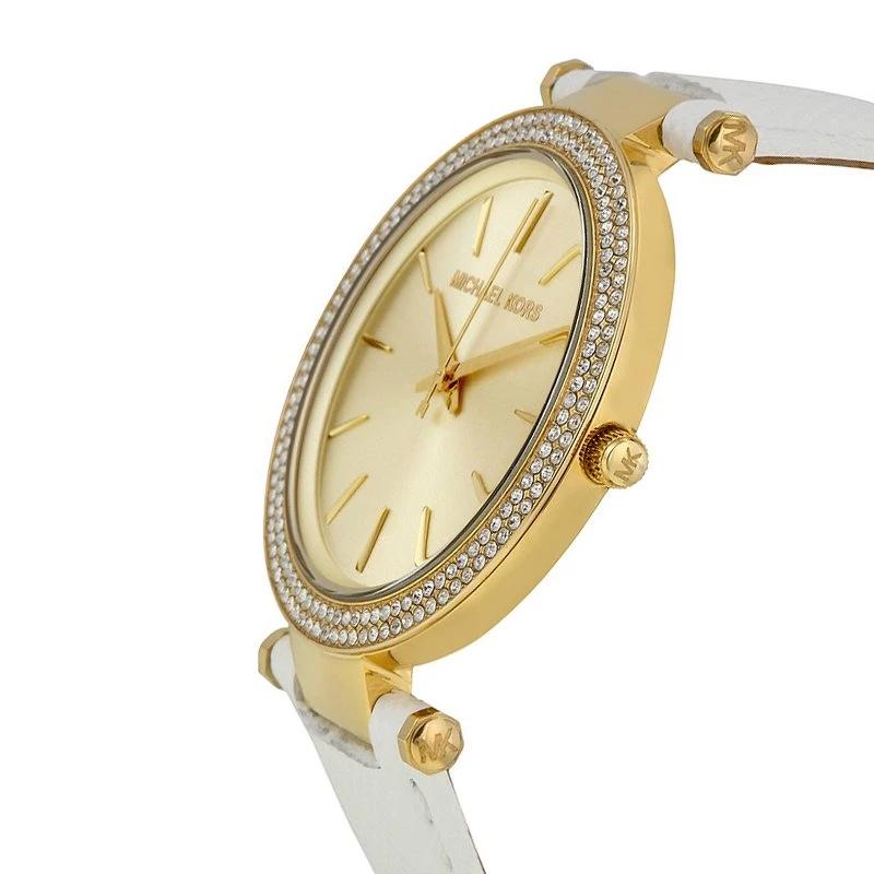 Classic and stylish this beautiful Darci MK2391 watch is from the fashion house of Michael Kors. Crafted from gold-plated stainless steel, it features a round diamond studded bezel with a match gold-tone dial and sleek hands. The watch comes with a brand name and a index markers. This 50M watch fixes on a wrist with a white leather bracelet and a pin buckle closure.