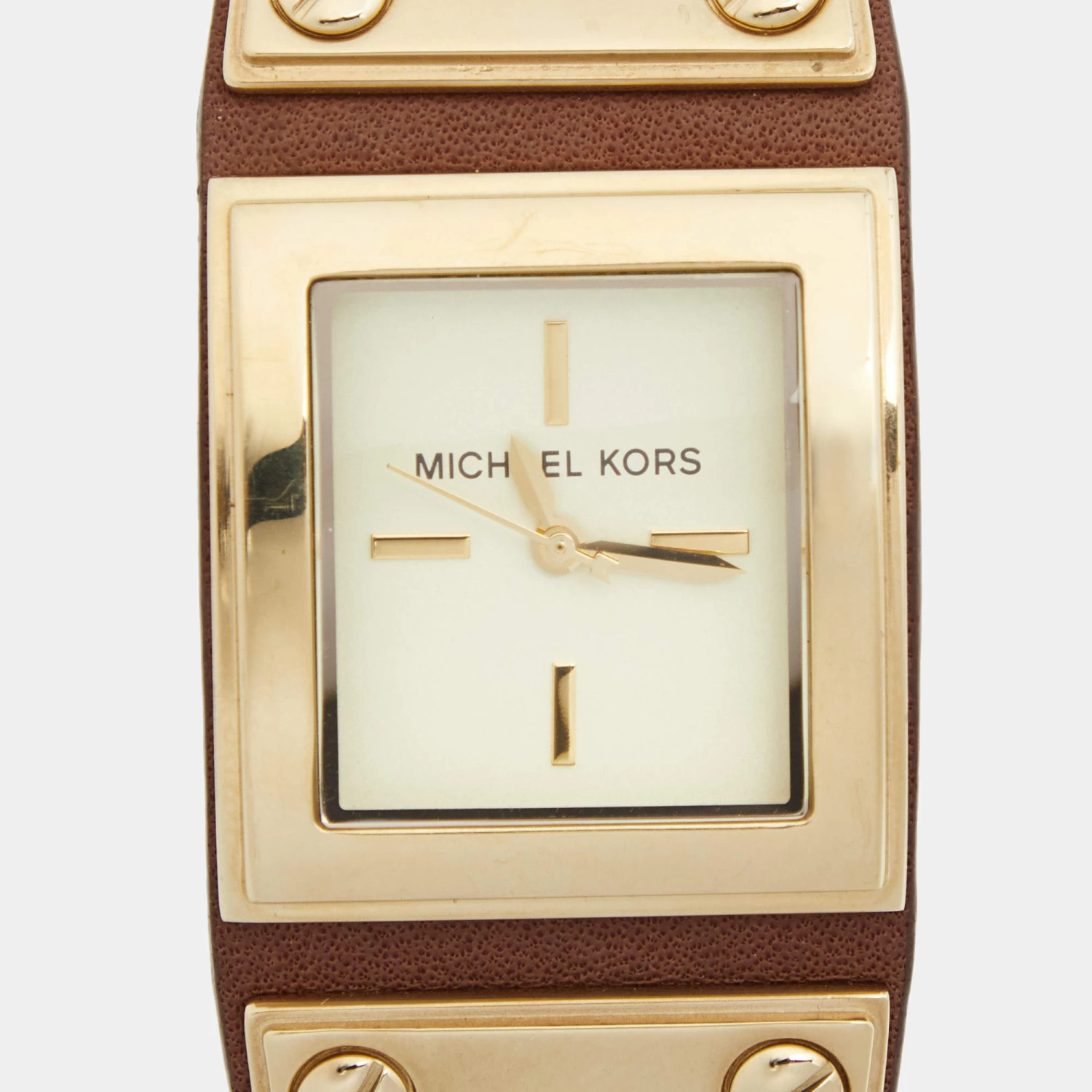 Let this timepiece by Michael Kors help you make every moment count! The quartz watch has a gold-plated stainless steel case added with a champagne dial and a leather bracelet secured by a buckle. It is a functional accessory designed to impart a luxurious style while keeping you on time.
