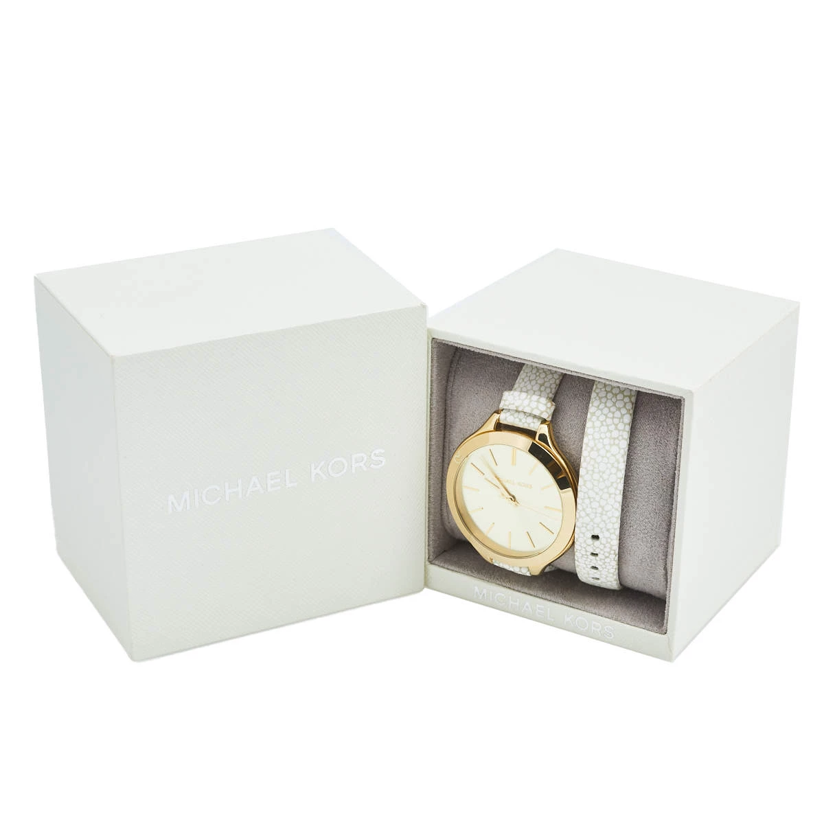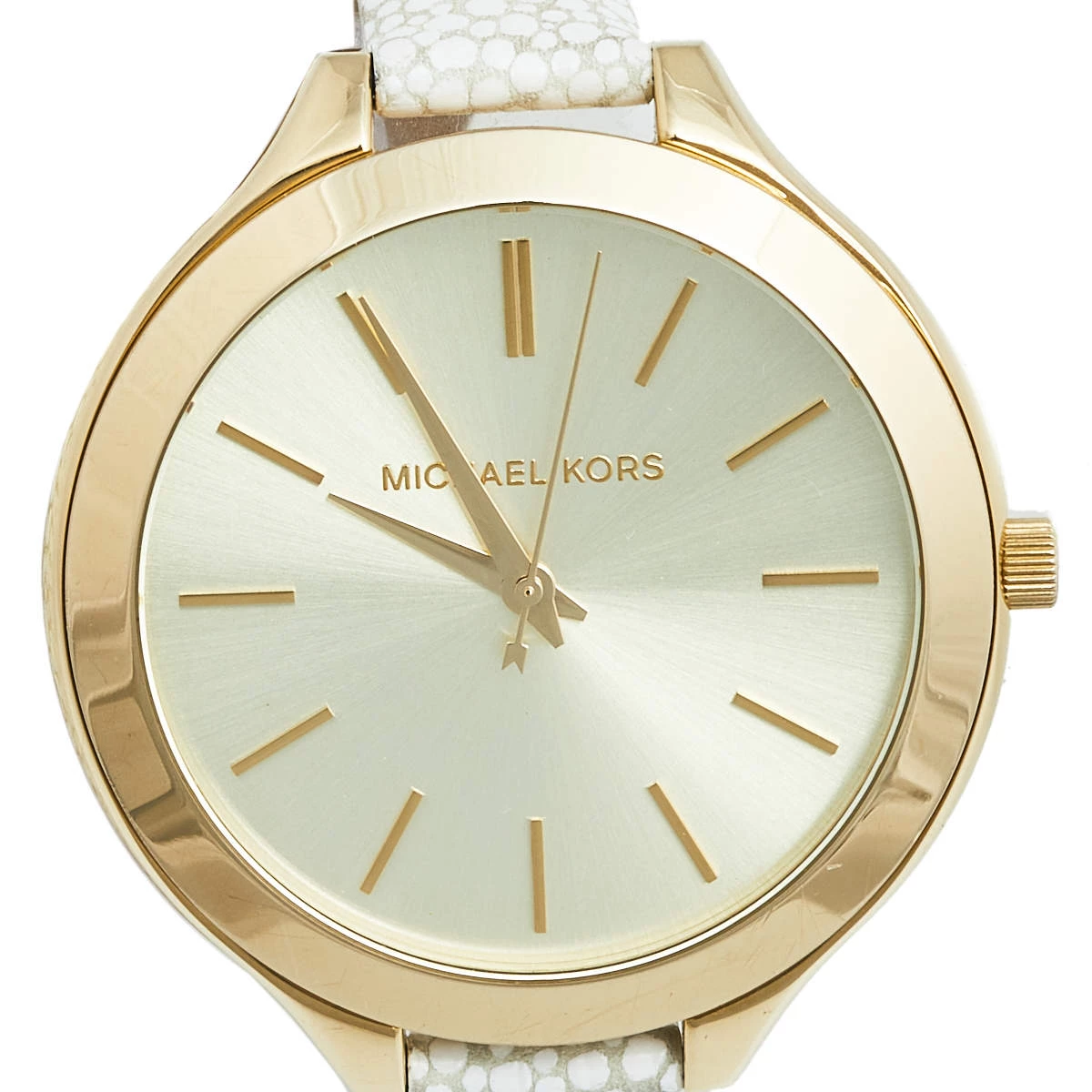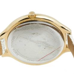 Designed with a fine blend of luxury and craftsmanship, this Runway watch from Michael Kors is sure to delight your style. Made from gold-plated stainless steel, it has a champagne dial with index hour markers and three hands. The smooth bezel, 50 meters water resistance, and buckle clasp make the 1uartz timepiece ready to be yours.