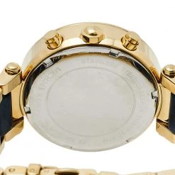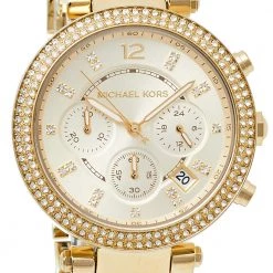 Set to shine on your wrist, this Michael Kors watch comes in a delighting gathering of the finest features. It has been wonderfully crafted from gold-plated stainless steel and designed with a bezel decorated with crystals. The scratch-resistant mineral glass protects the dial with three sub-dials. Lastly, the creation is topped by a water resistance of 100 meters and held by a bracelet with a push-button release.