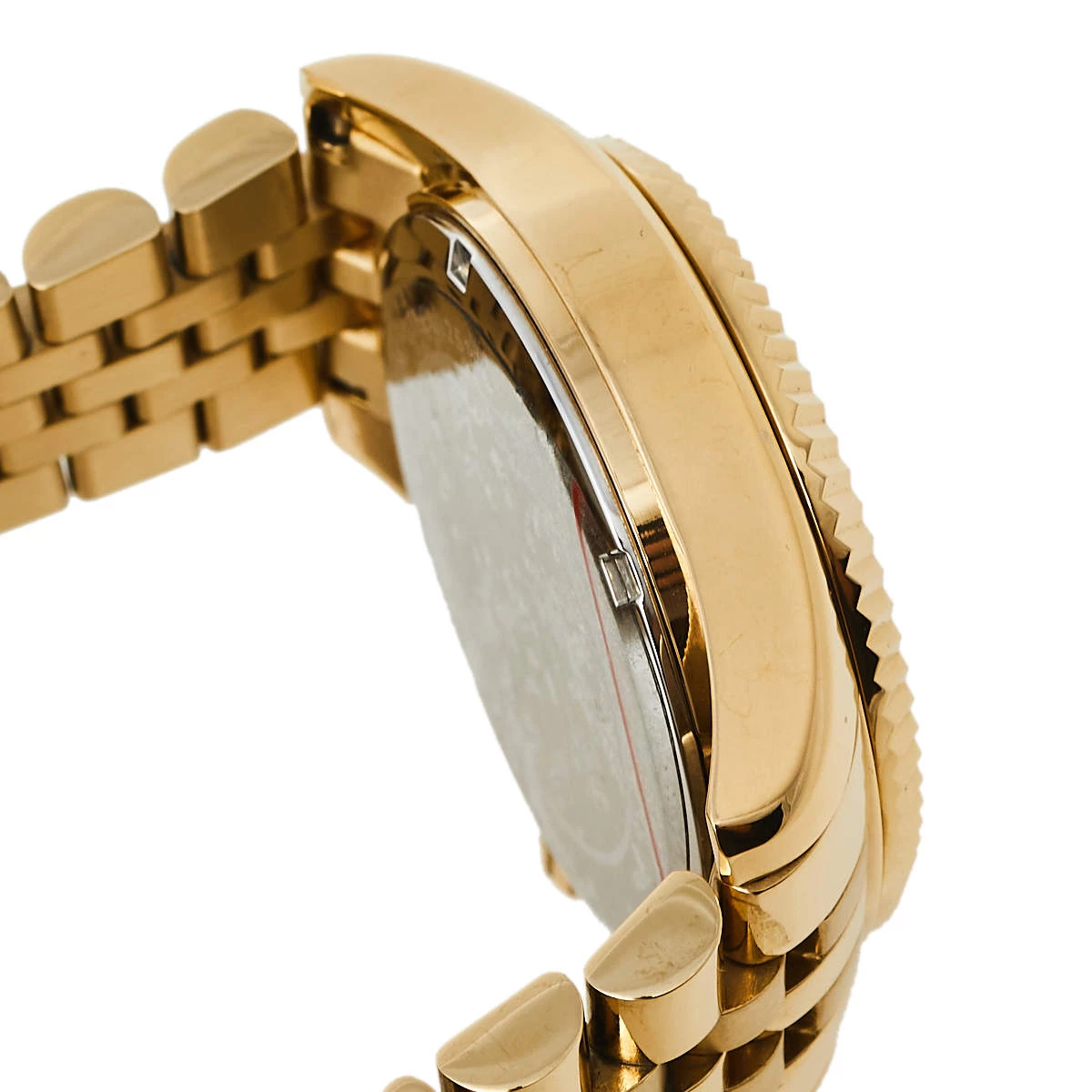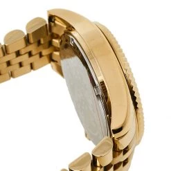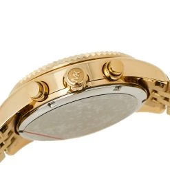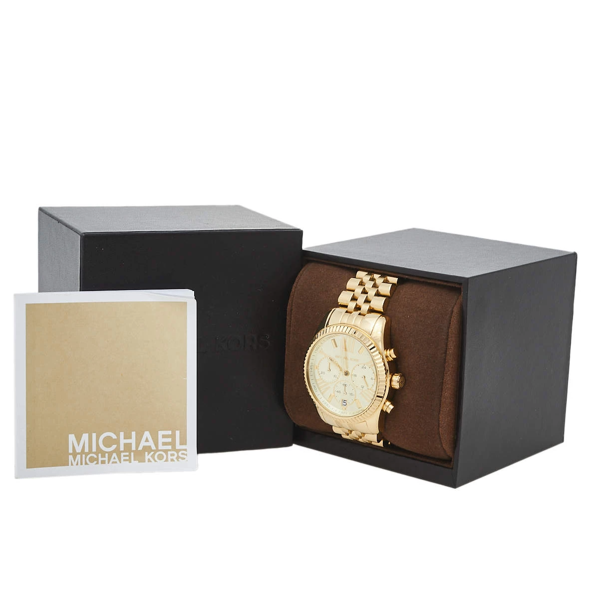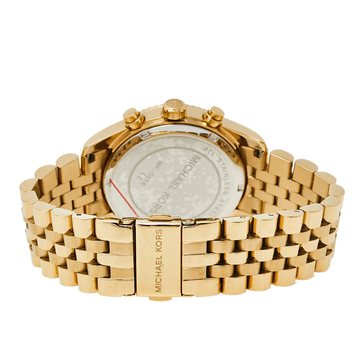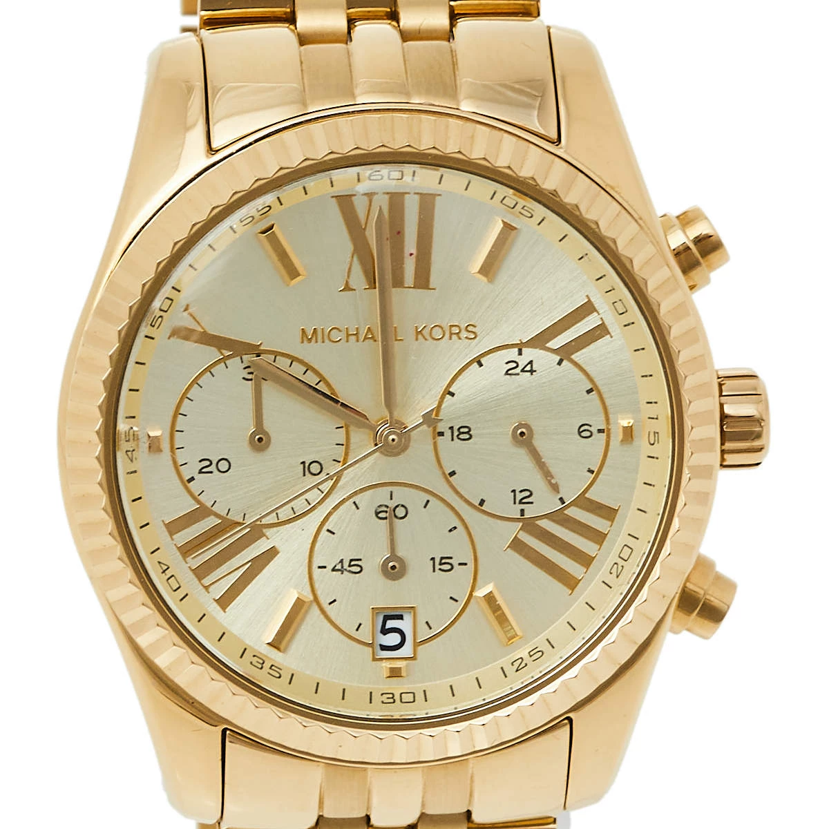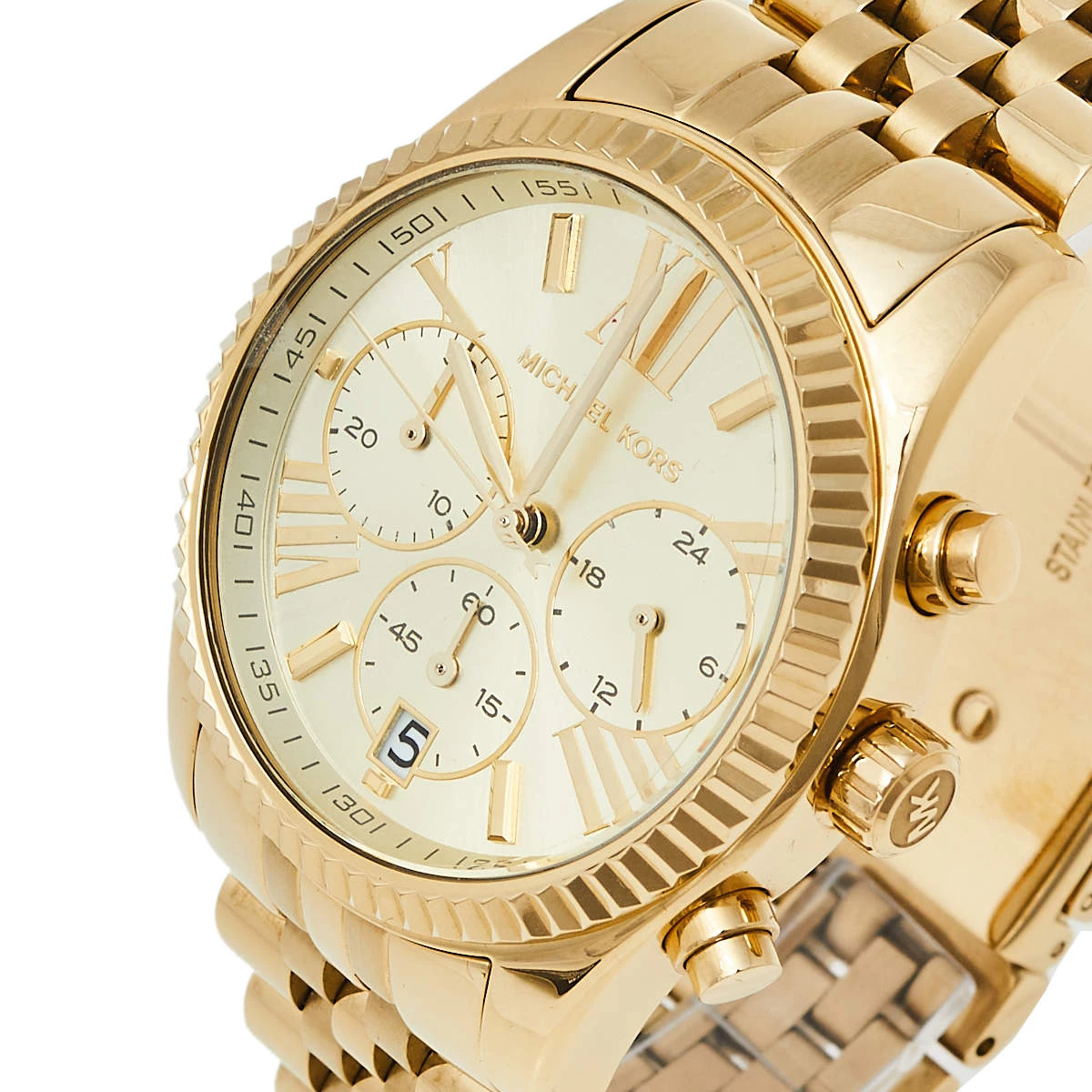 Designed with a fine blend of luxury and craftsmanship, this Lexington watch from Michael Kors is sure to delight. Crafted using gold-tone stainless steel, the quartz watch has gold-tone markers, three hands, three subdials, and a date window on the dial. It is water-resistant up to 100 meters and secured by a push-button clasp.