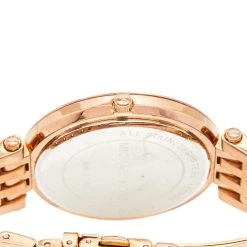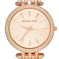 Studded with dazzling crystals on the bezel, this Michael Kors Darci MK3192 wristwatch knows how to charm its way to your esteemed collection of elegant timepieces. The sophisticated rose gold-plated stainless steel body of this quartz watch is detailed with a matching dial that flaunts index hour markers and three hands. The chain-link bracelet is secured using a push-button deployment clasp and the watch is equipped with a water resistance of 50 meters.