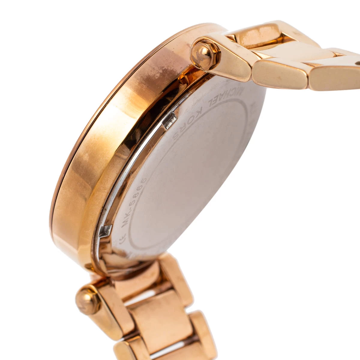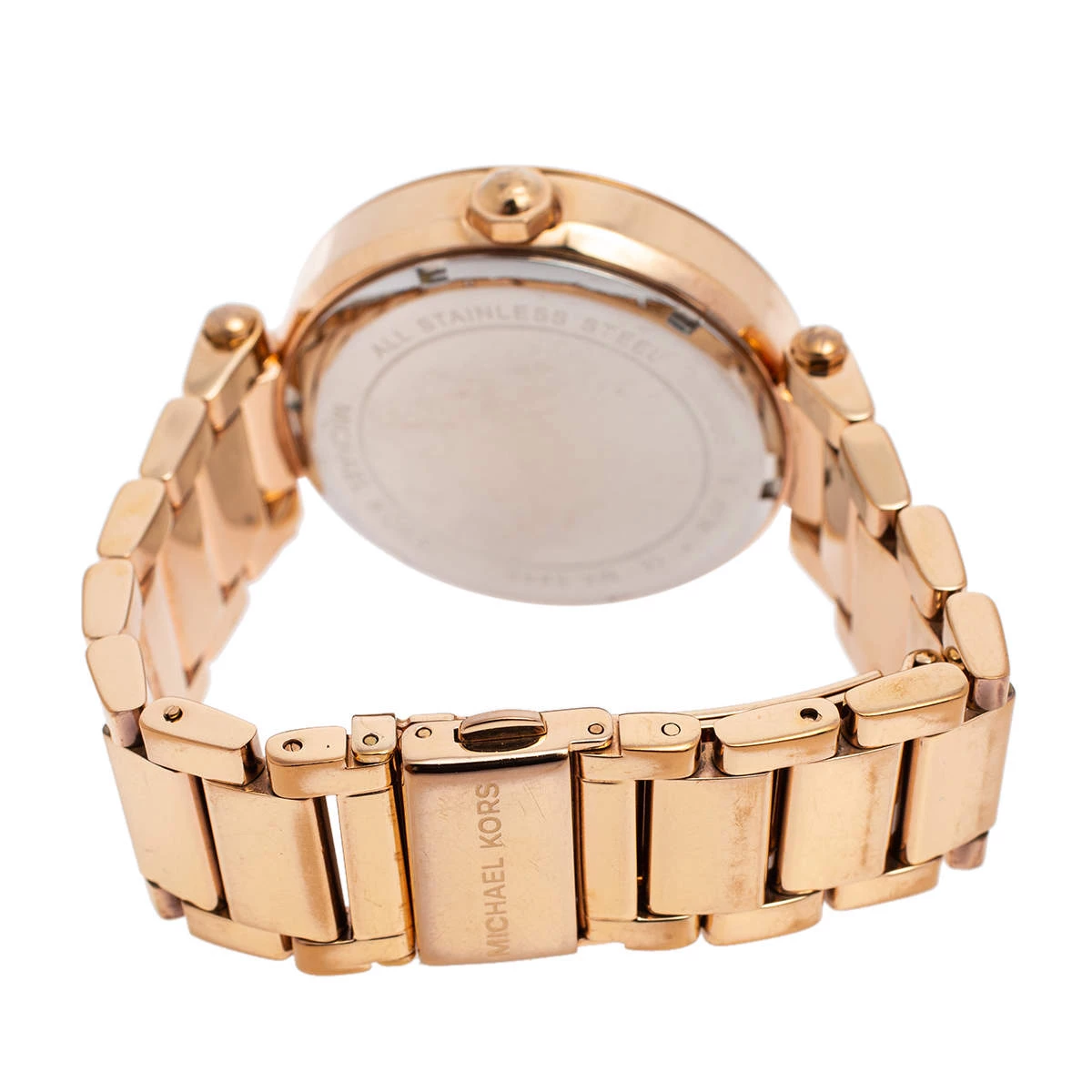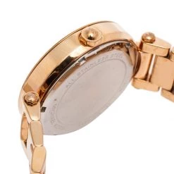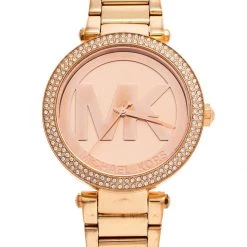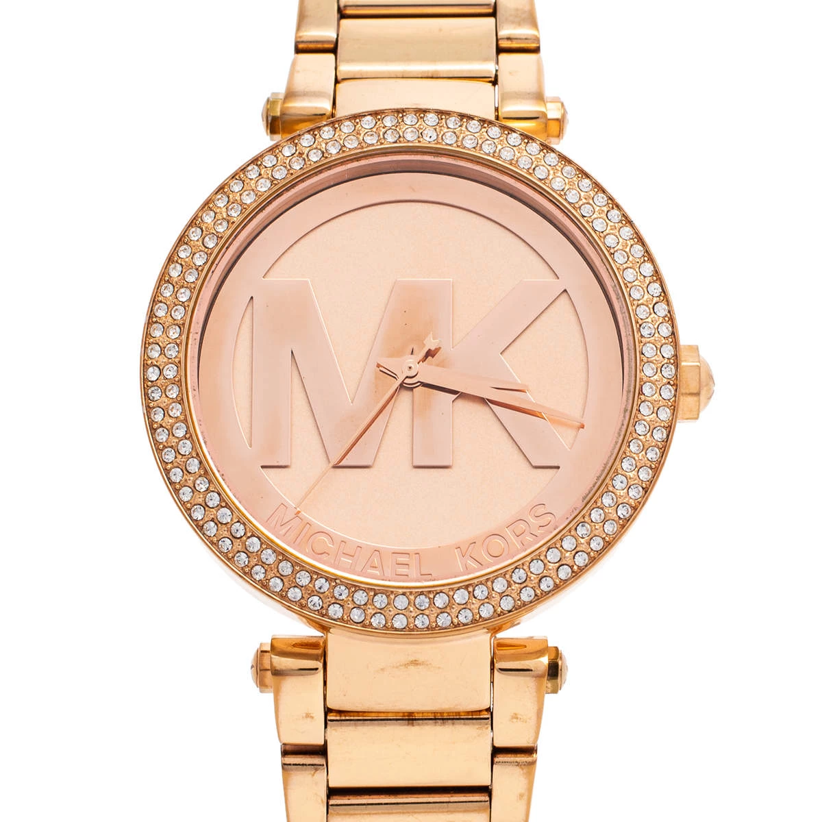 Set to shine on your wrist, this Michael Kors watch comes in a delighting gathering of the finest features. It is crafted from gold-plated stainless steel and designed with a crystal-embellished bezel. The champagne dial has an MK logo and three hands. The watch is completed with a push-button clasp.