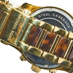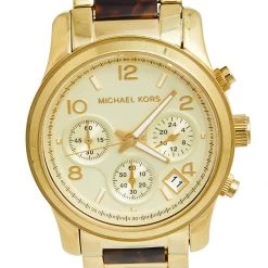 Designed with a fine blend of luxury and craftsmanship, this Runway watch from Michael Kors is sure to delight your style. Made from gold-plated stainless steel and acetate, it has a champagne dial with a date window and three sub-dials. The smooth bezel, 50 meters water resistance, and push-button clasp make the quartz timepiece ready to be yours.