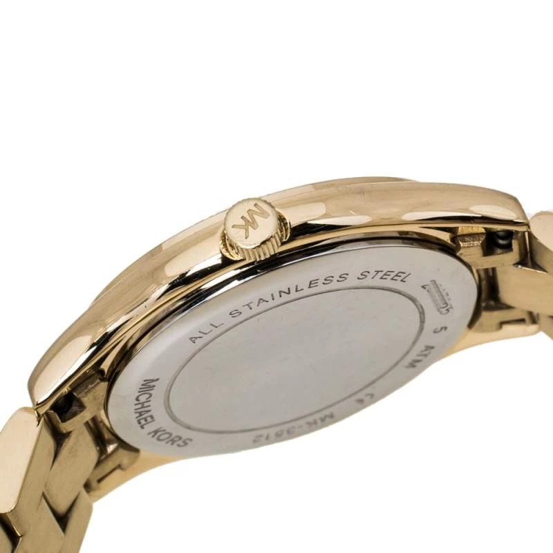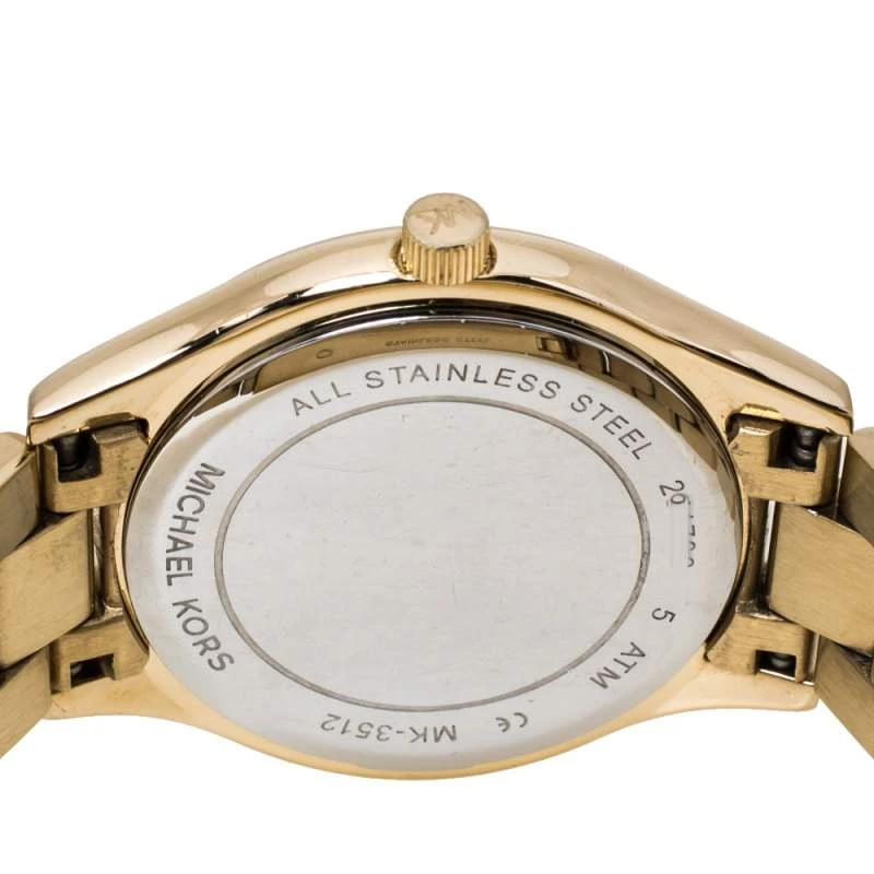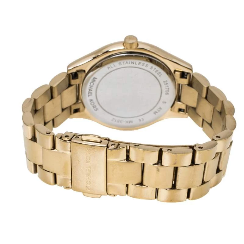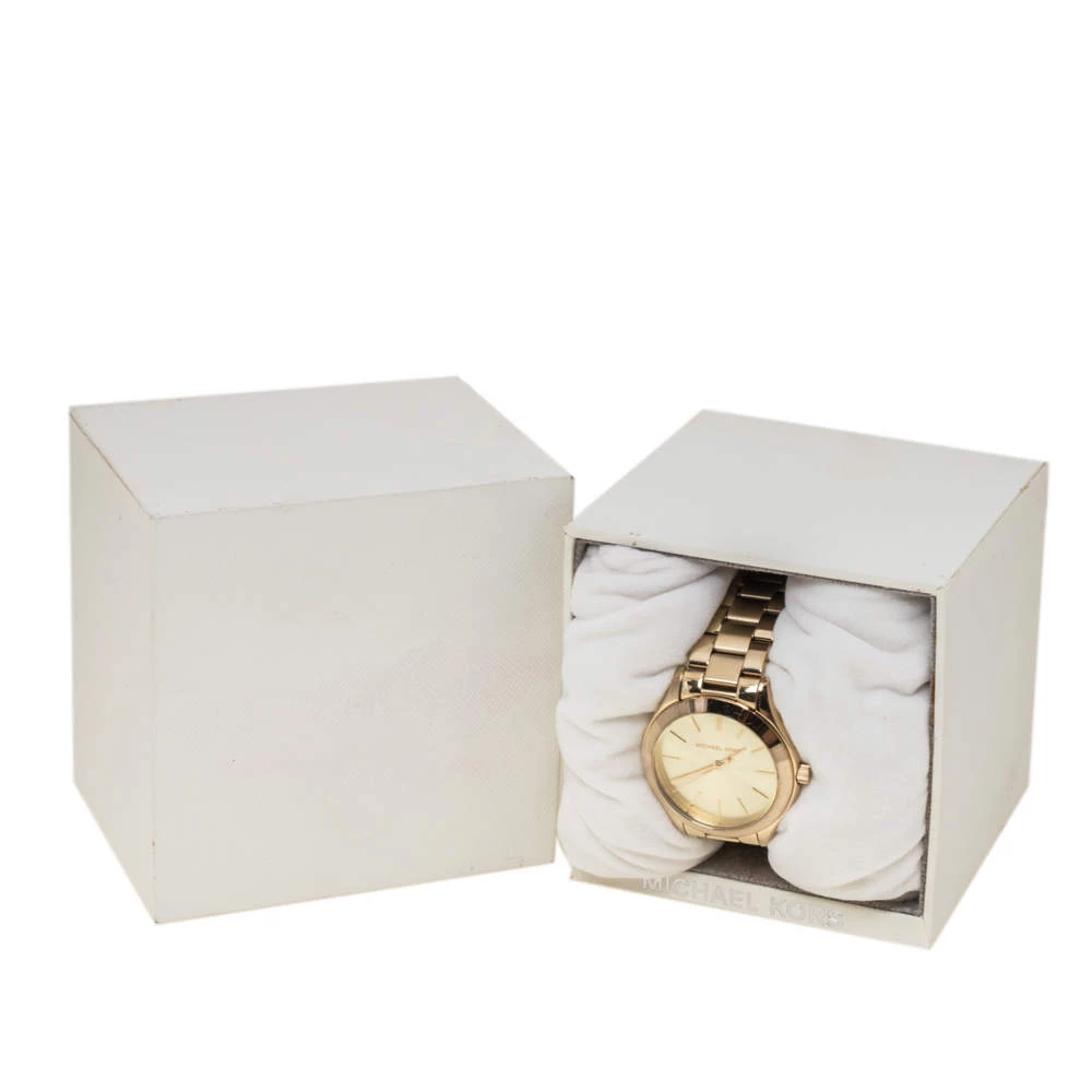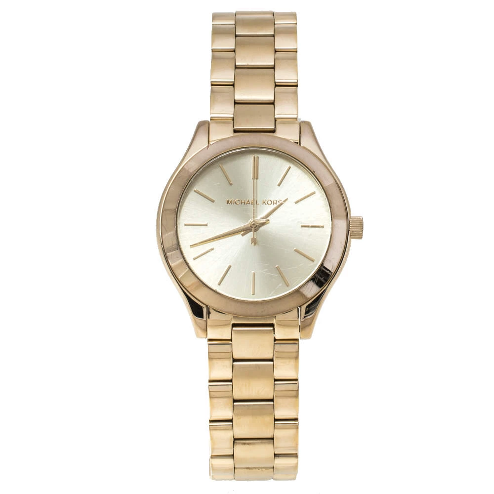 Designed with a fine blend of luxury and craftsmanship, this Runway watch from Michael Kors is sure to delight your style. Made from gold-tone stainless steel, it has a champagne-hued dial with three hands and hour indexes. The smooth bezel, 50 meters water resistance, and push-button clasp make the quartz timepiece ready to be yours.