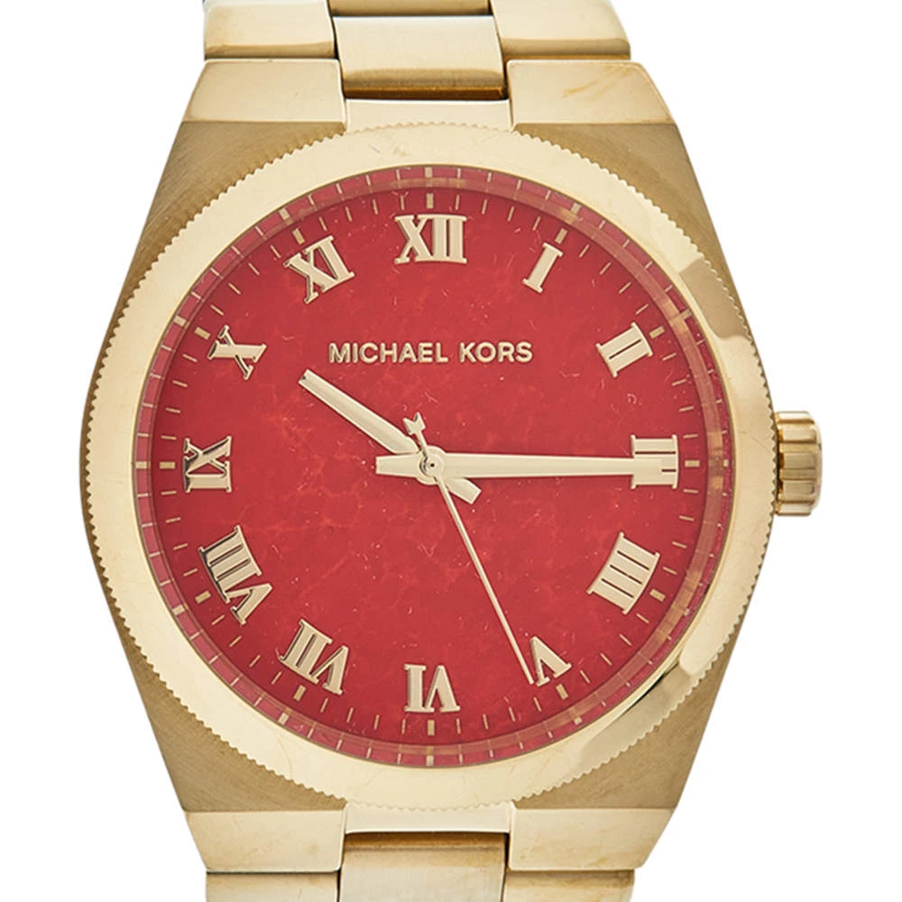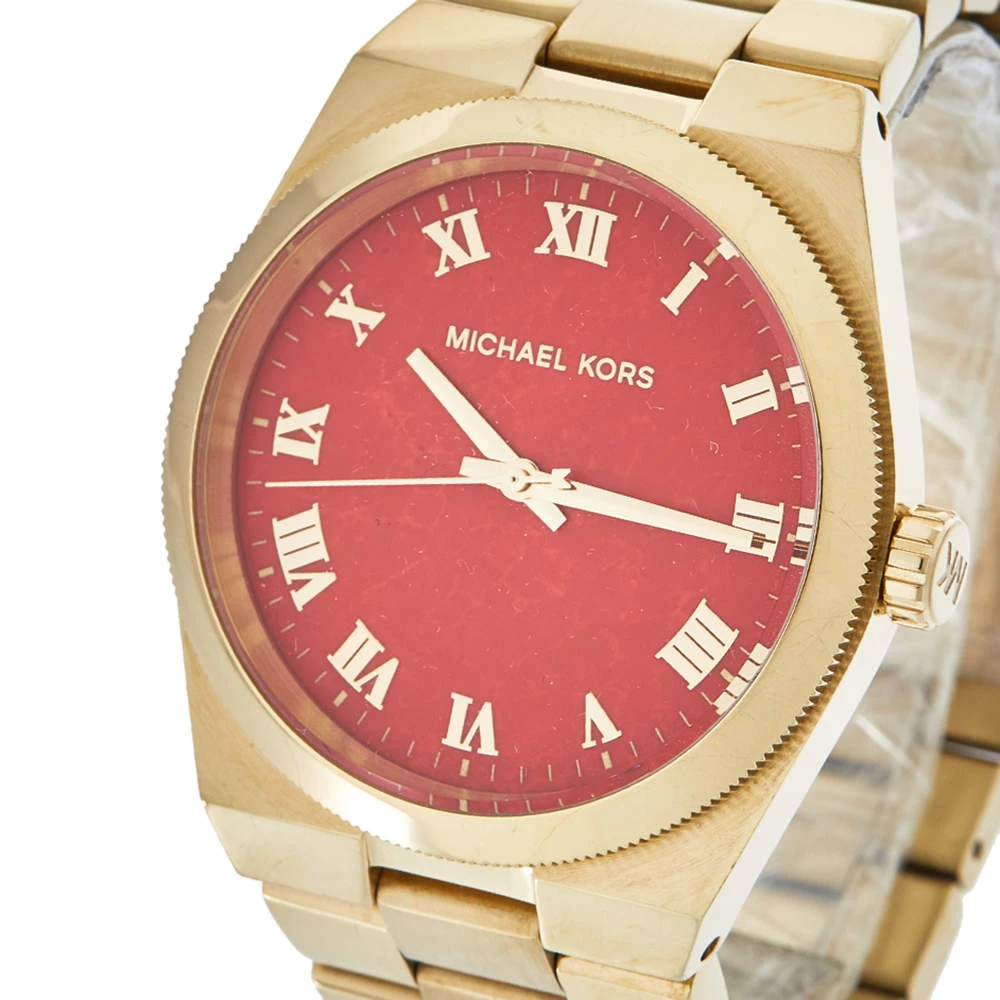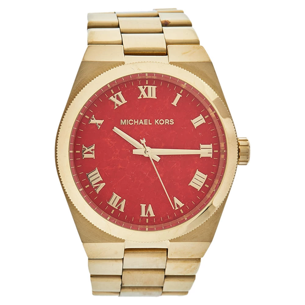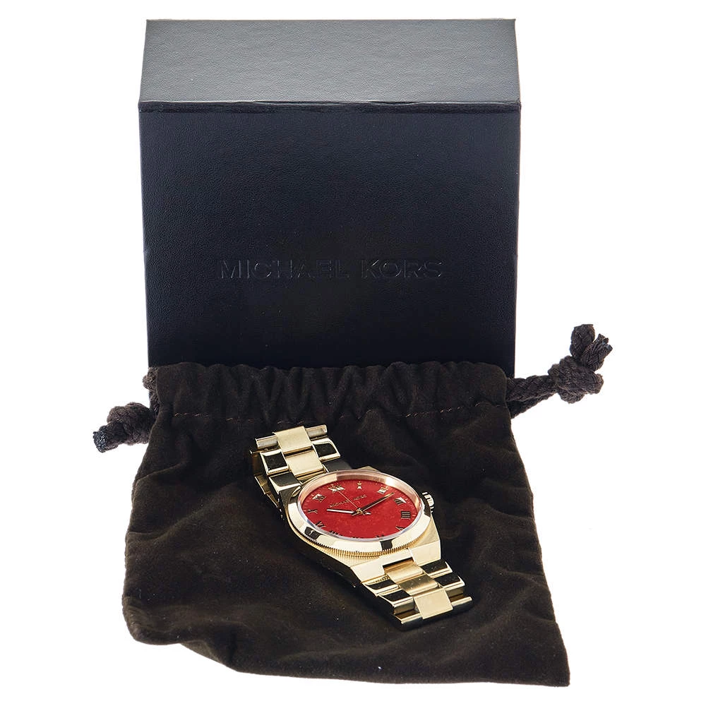 Your everyday style deserves a luxurious touch like this MK5936 wristwatch from Michael Kors. It is made from gold-tone stainless steel and has a coral red dial with three hands, Roman numeral hours markers, and minute markers around the outer rim. The gold-tone stainless steel bracelet fastens with the help of a push-button deployment clasp and the Quartz watch is equipped with a water resistance of 100 meters.